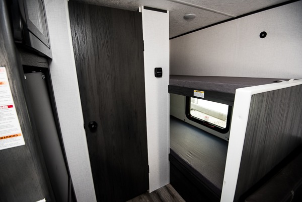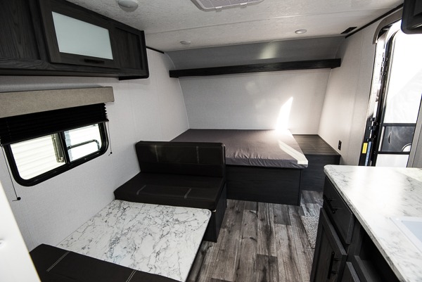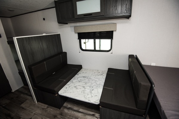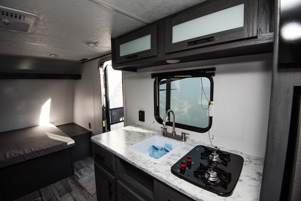 A perfect couples coach that could sleep one or two more, depending on size, using the booth dinette which can be converted at night This unit is cozy and convenient providing you just what you need to enjoy a little adventure away from home. For meals, there is a two burner cooktop and sink, plus a 3.3 cu. ft. refrigerator for your perishables. Overhead cabinetry can be found along both sides for your dishes and things. You will all appreciate the convenience of having your own private shower and toilet so that you don't need to use the campground facilities at night. You will also enjoy spending time outside with an 8' awning to provide even more living space outdoors!