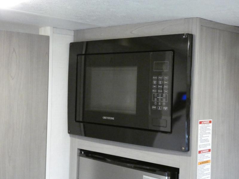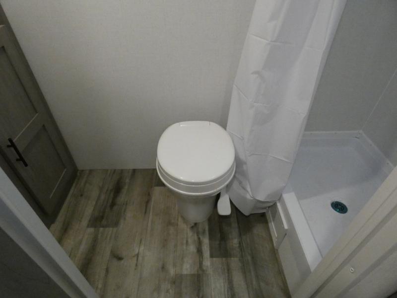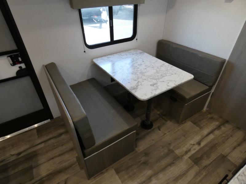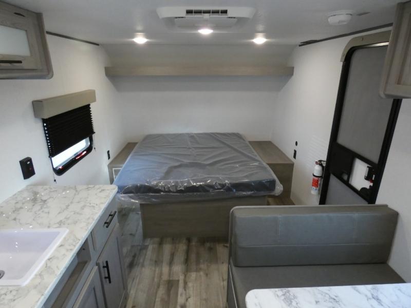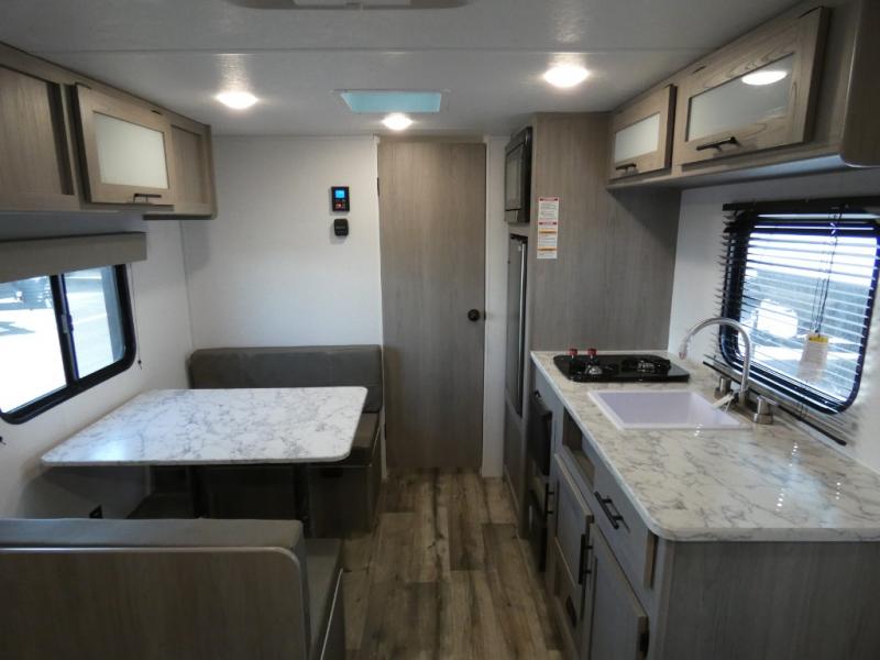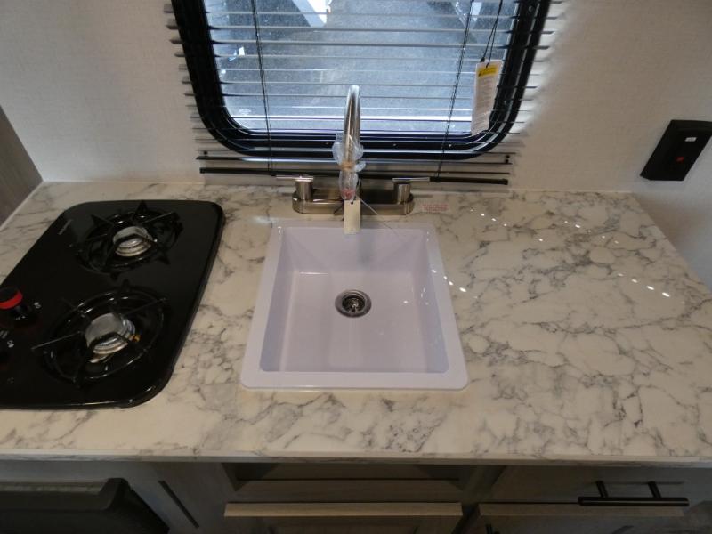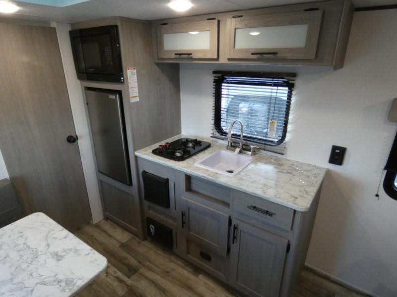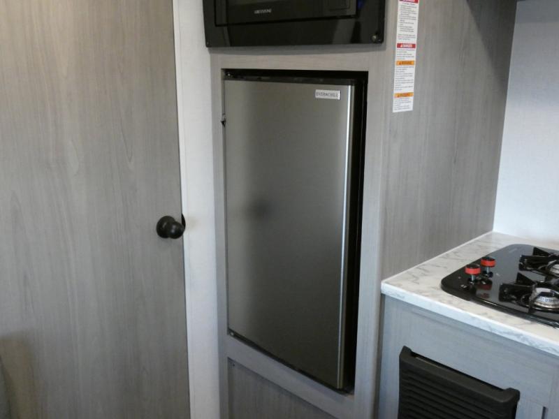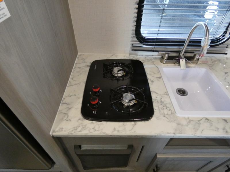 A perfect couples coach that could sleep one or two more, depending on size, using the booth dinette which can be converted at night This unit is cozy and convenient providing you just what you need to enjoy a little adventure away from home. For meals, there is a two burner cooktop and sink, plus a 3.3 cu. ft. refrigerator for your perishables. Overhead cabinetry can be found along both sides for your dishes and things. You will all appreciate the convenience of having your own private shower and toilet so that you don't need to use the campground facilities at night. You will also enjoy spending time outside with an 8' awning to provide even more living space outdoors!
