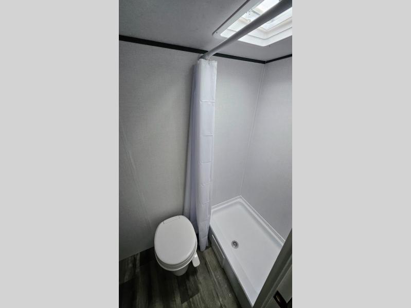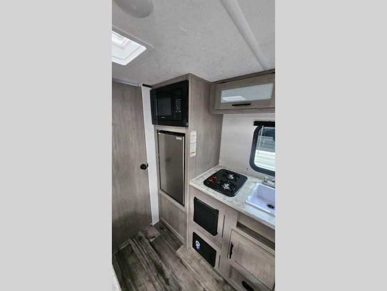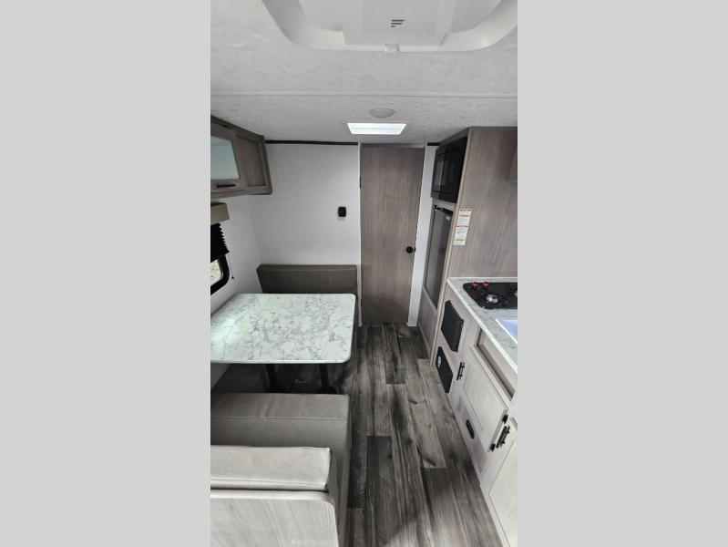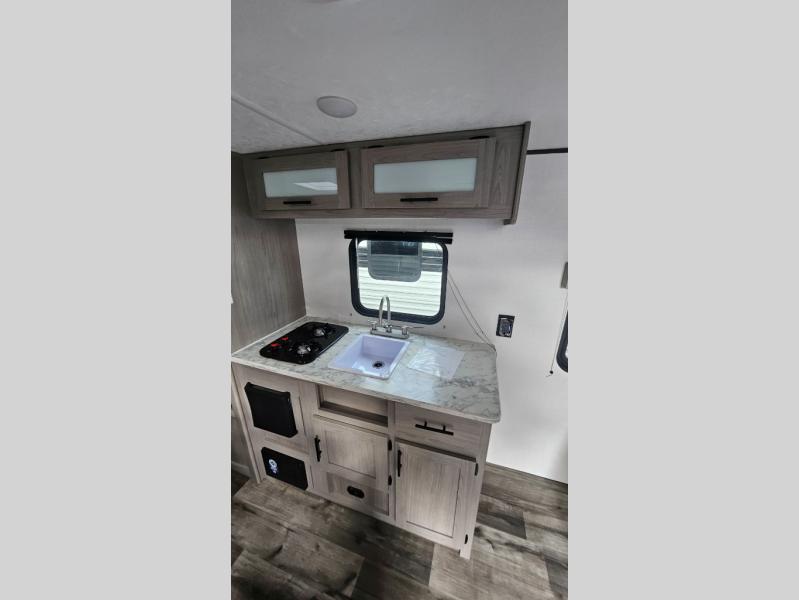 A perfect couples coach that could sleep one or two more, depending on size, using the booth dinette which can be converted at night This unit is cozy and convenient providing you just what you need to enjoy a little adventure away from home. For meals, there is a two burner cooktop and sink, plus a 3.3 cu. ft. refrigerator for your perishables. Overhead cabinetry can be found along both sides for your dishes and things. You will all appreciate the convenience of having your own private shower and toilet so that you don't need to use the campground facilities at night. You will also enjoy spending time outside with an 8' awning to provide even more living space outdoors!