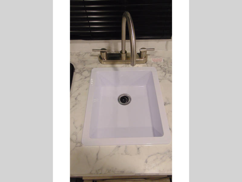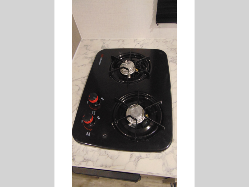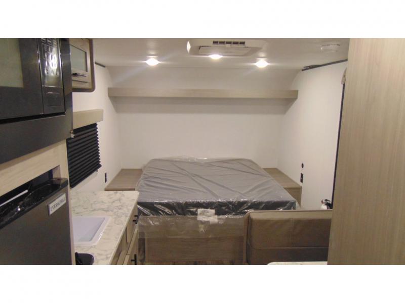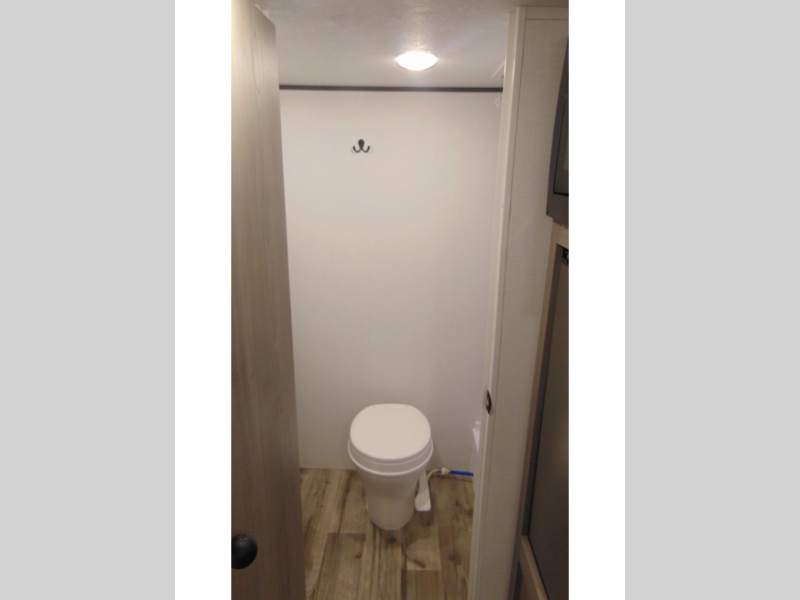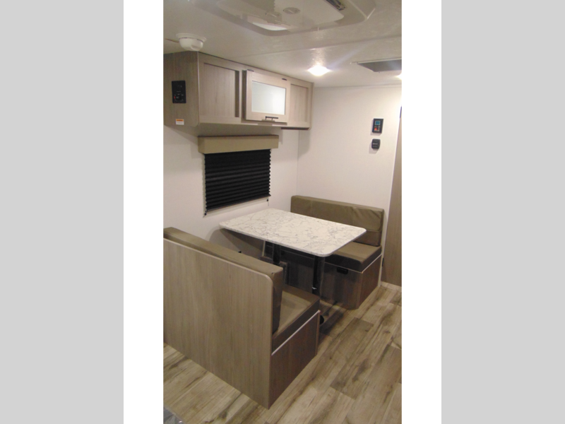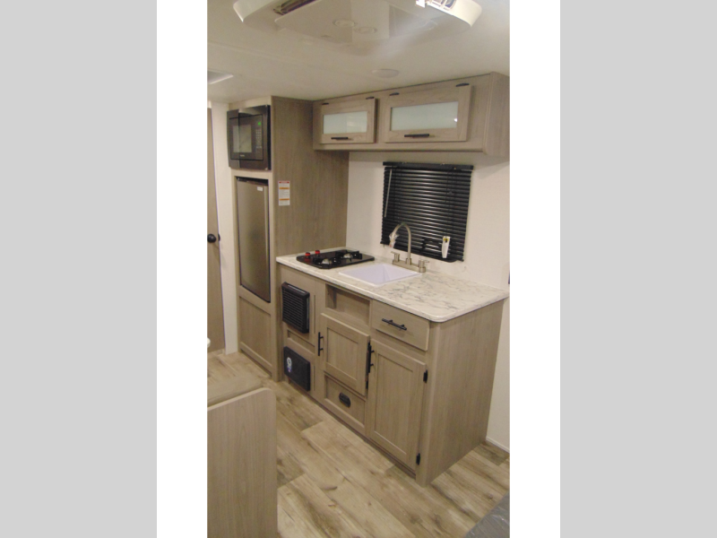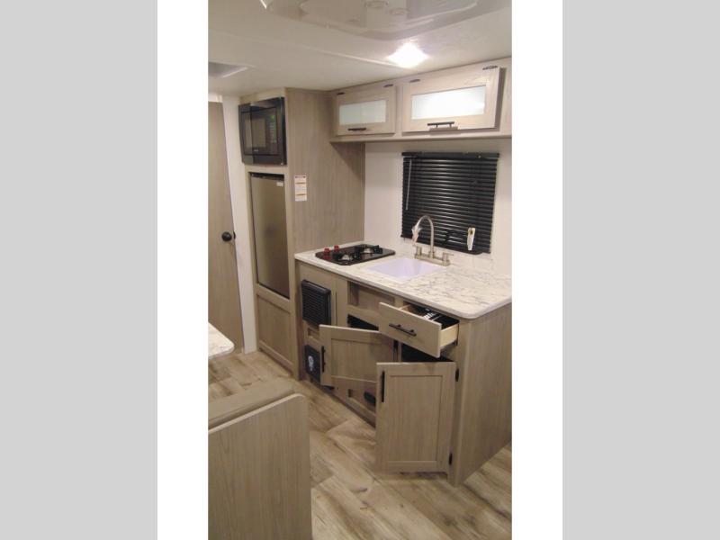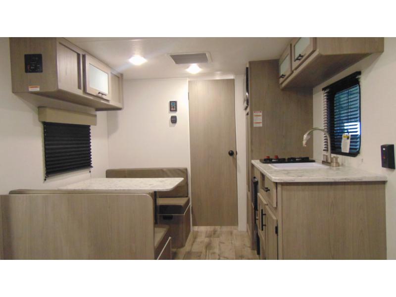 A perfect couples coach that could sleep one or two more, depending on size, using the booth dinette which can be converted at night This unit is cozy and convenient providing you just what you need to enjoy a little adventure away from home. For meals, there is a two burner cooktop and sink, plus a 3.3 cu. ft. refrigerator for your perishables. Overhead cabinetry can be found along both sides for your dishes and things. You will all appreciate the convenience of having your own private shower and toilet so that you don't need to use the campground facilities at night. You will also enjoy spending time outside with an 8' awning to provide even more living space outdoors!