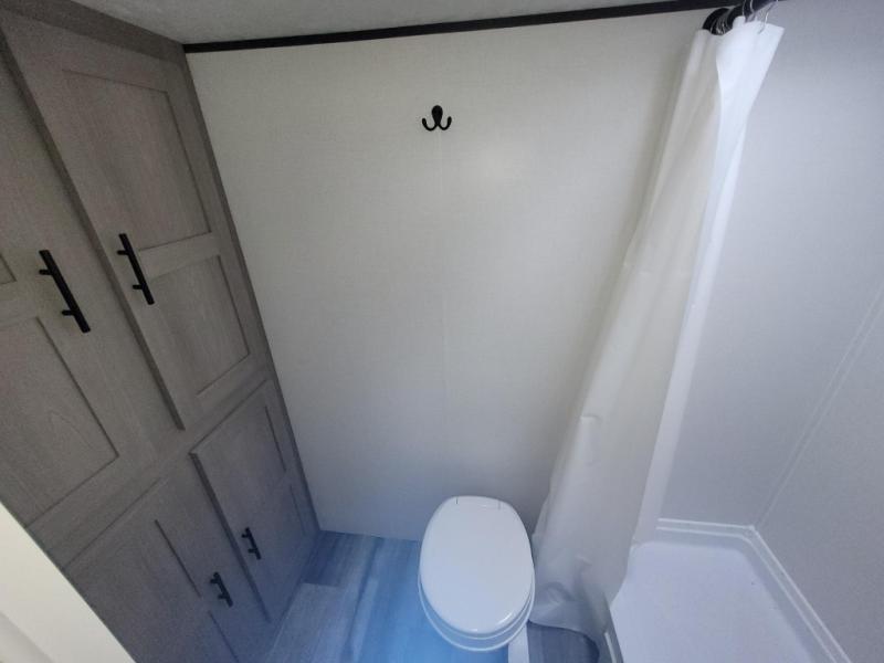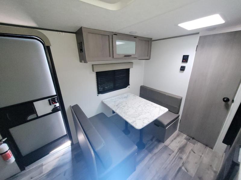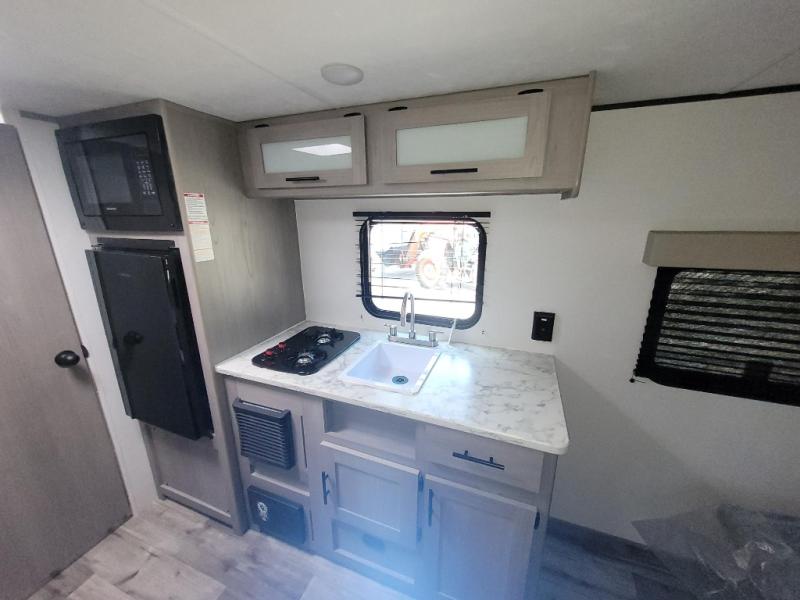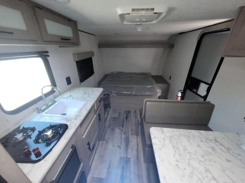A perfect couples coach that could sleep one or two more, depending on size, using the booth dinette which can be converted at night This unit is cozy and convenient providing you just what you need to enjoy a little adventure away from home. For meals, there is a two burner cooktop and sink, plus a 3.3 cu. ft. refrigerator for your perishables. Overhead cabinetry can be found along both sides for your dishes and things. You will all appreciate the convenience of having your own private shower and toilet so that you don't need to use the campground facilities at night. You will also enjoy spending time outside with an 8' awning to provide even more living space outdoors!