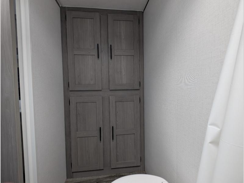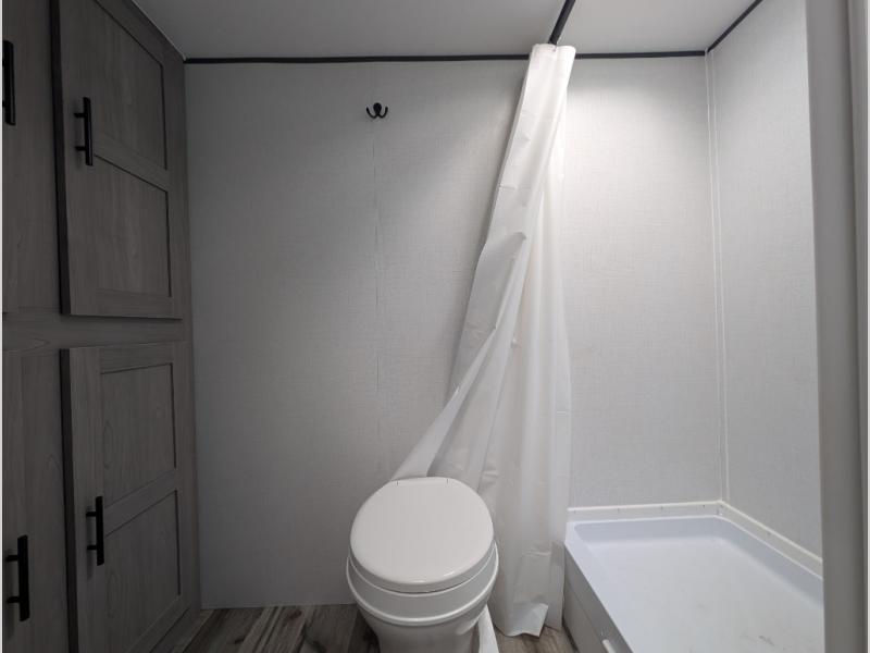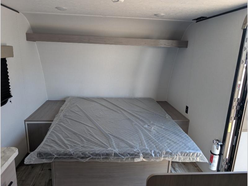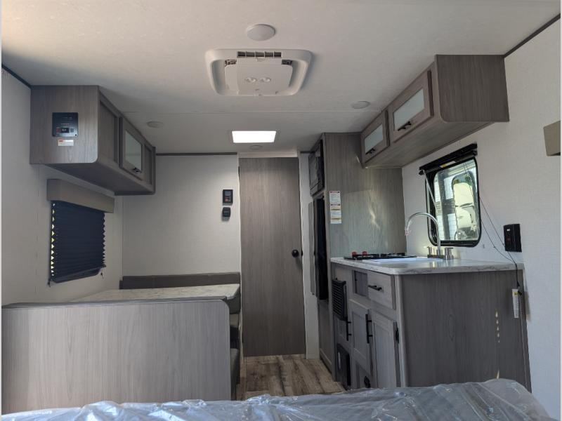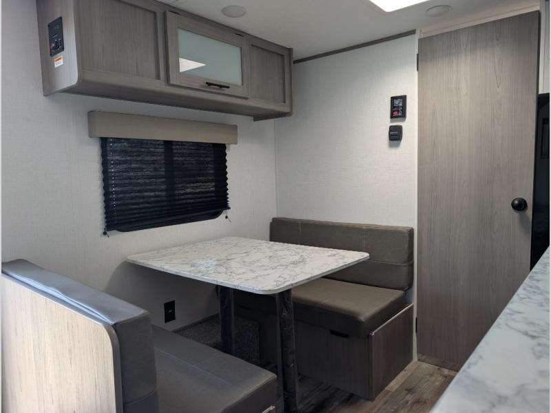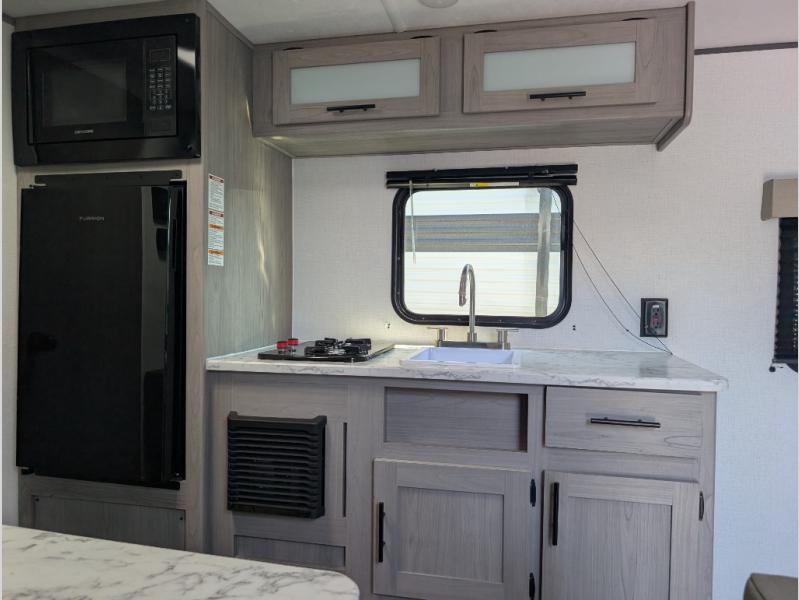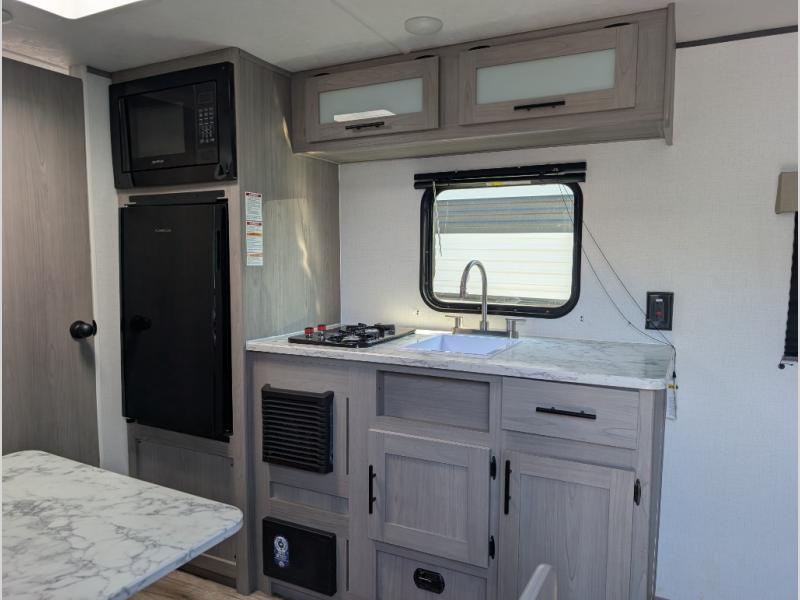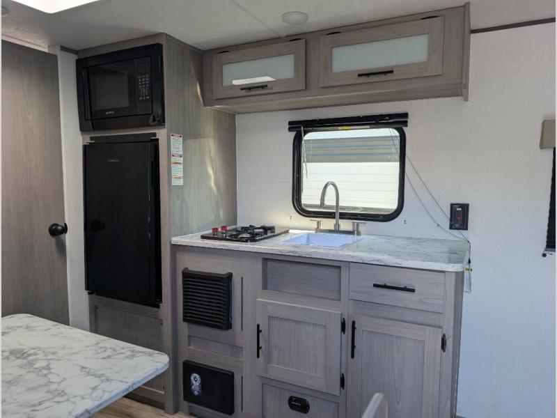 A perfect couples coach that could sleep one or two more, depending on size, using the booth dinette which can be converted at night This unit is cozy and convenient providing you just what you need to enjoy a little adventure away from home. For meals, there is a two burner cooktop and sink, plus a 3.3 cu. ft. refrigerator for your perishables. Overhead cabinetry can be found along both sides for your dishes and things. You will all appreciate the convenience of having your own private shower and toilet so that you don't need to use the campground facilities at night. You will also enjoy spending time outside with an 8' awning to provide even more living space outdoors!