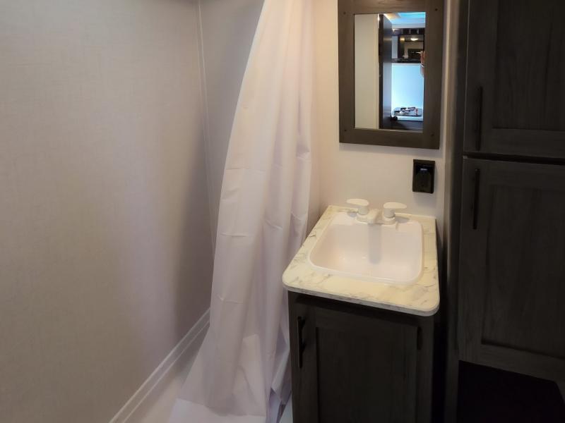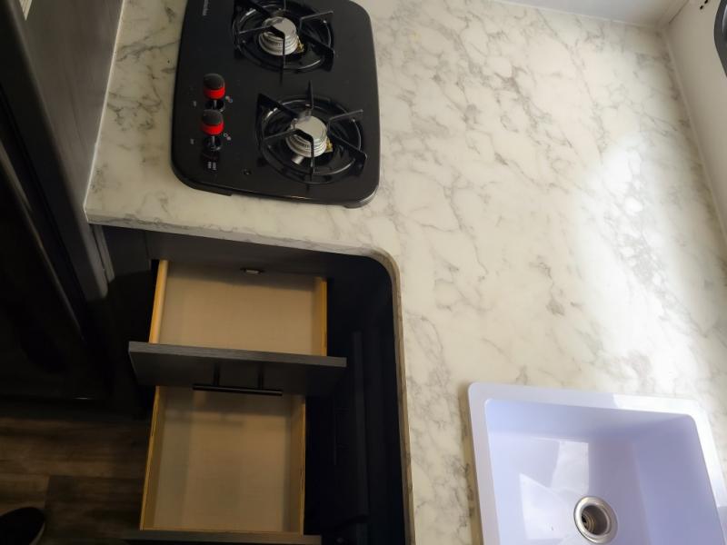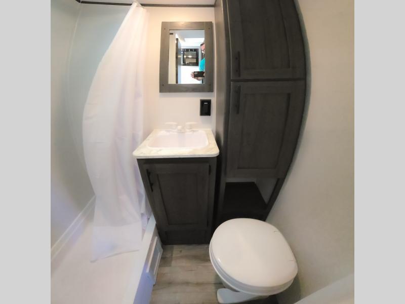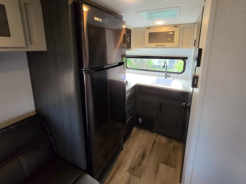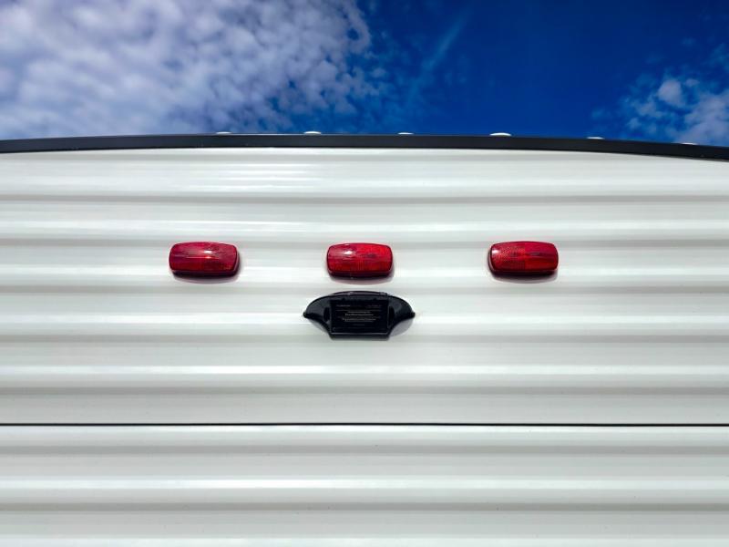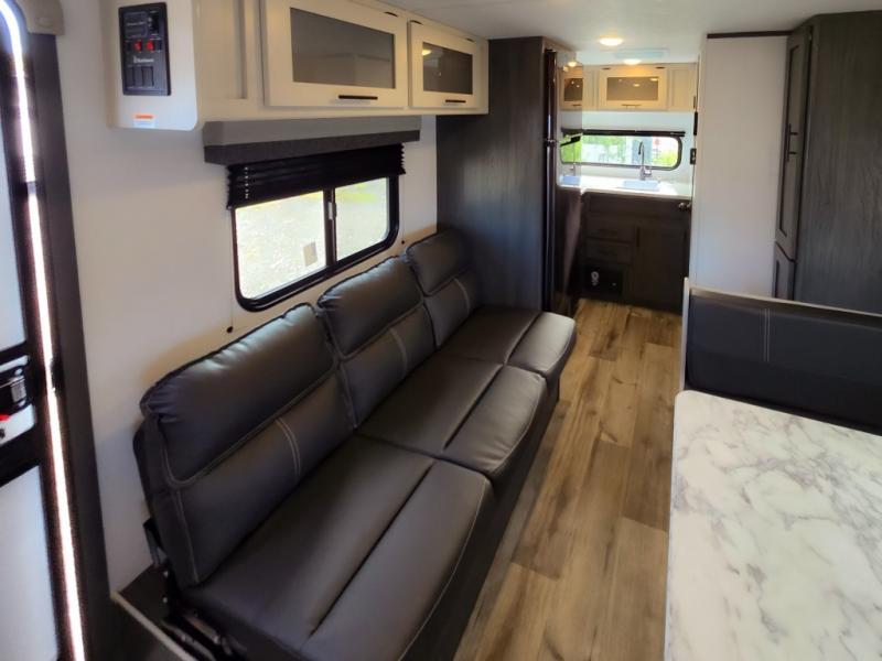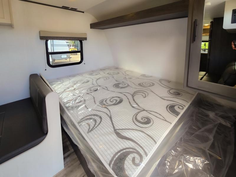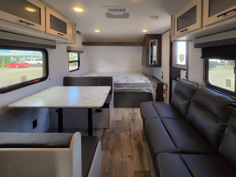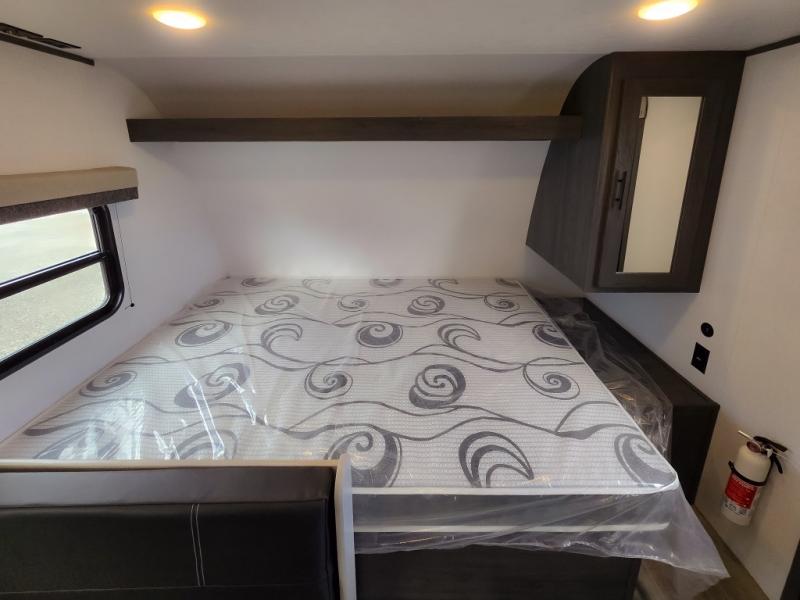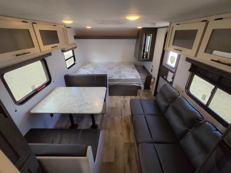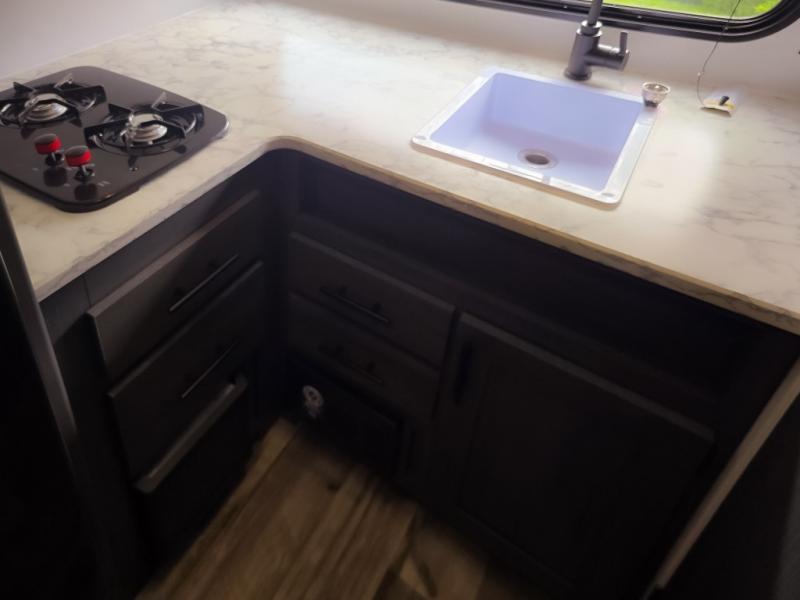 This cozy lightweight camper is waiting for you to enjoy a quiet retreat for two, or a few more if you like. This unit features sleeping for four to five with a queen bed up front, a booth dinette that can be converted, as well as a jack knife sofa opposite. A rear corner kitchen offers you a 10 cu. ft. 12V refrigerator for your perishables, and a pantry opposite for dry goods. There is a single sink for prep work and cleaning up, plus a two burner range top and microwave oven for cooking and warming leftovers up. A 10' awning creates added living space outside, and the front pass-through storage will hold all of your outside camping gear when not in use.