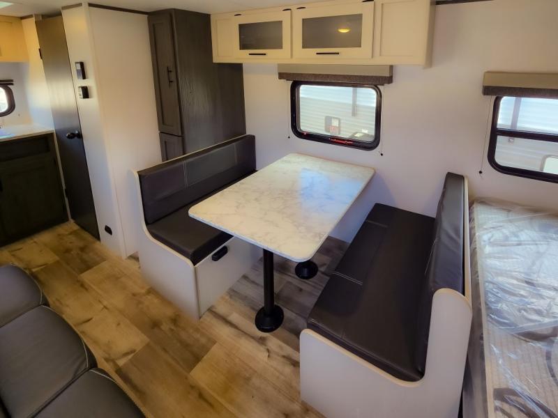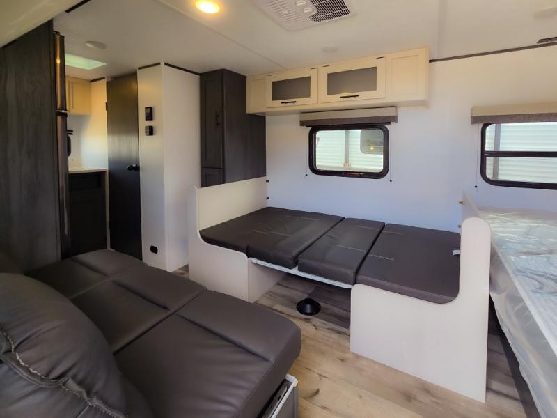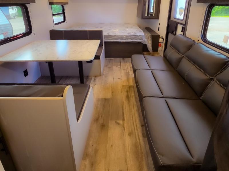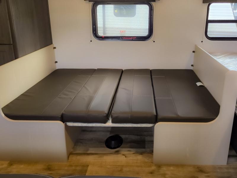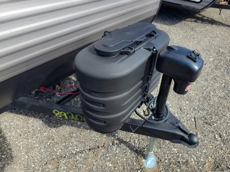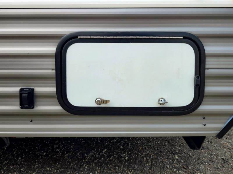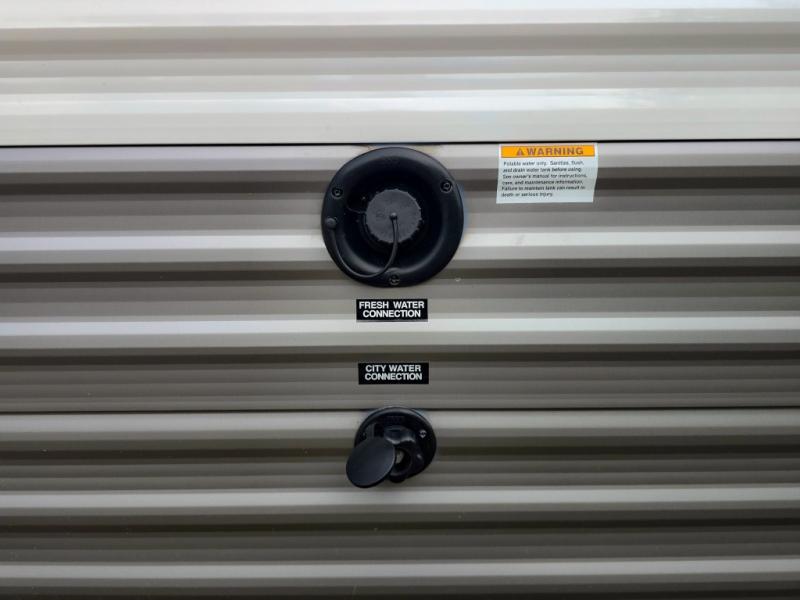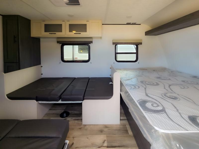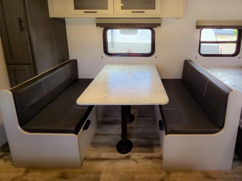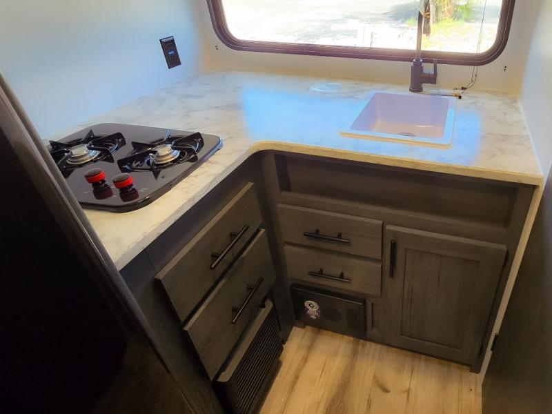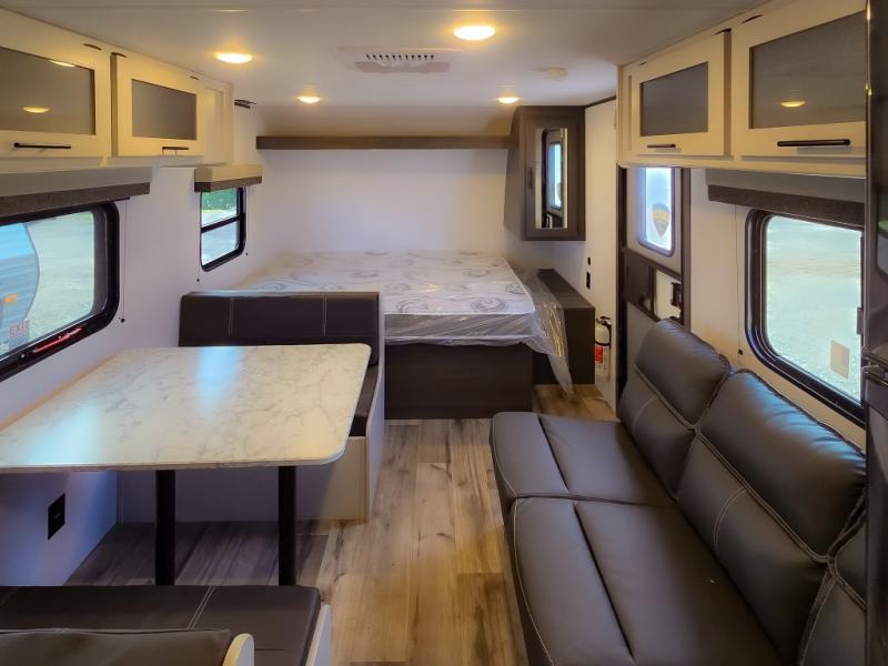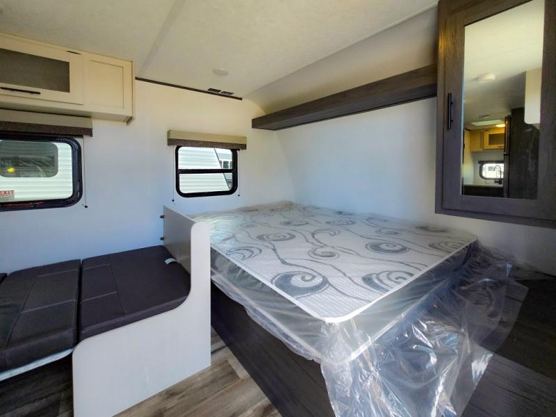 This cozy lightweight camper is waiting for you to enjoy a quiet retreat for two, or a few more if you like. This unit features sleeping for four to five with a queen bed up front, a booth dinette that can be converted, as well as a jack knife sofa opposite. A rear corner kitchen offers you a 10 cu. ft. 12V refrigerator for your perishables, and a pantry opposite for dry goods. There is a single sink for prep work and cleaning up, plus a two burner range top and microwave oven for cooking and warming leftovers up. A 10' awning creates added living space outside, and the front pass-through storage will hold all of your outside camping gear when not in use.