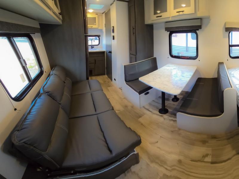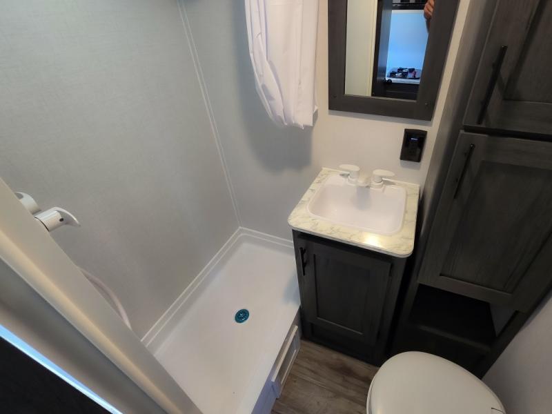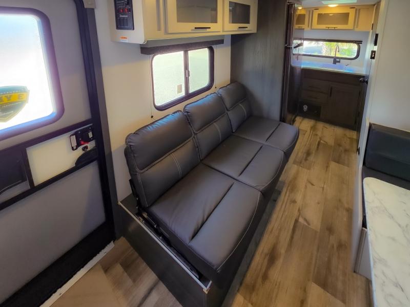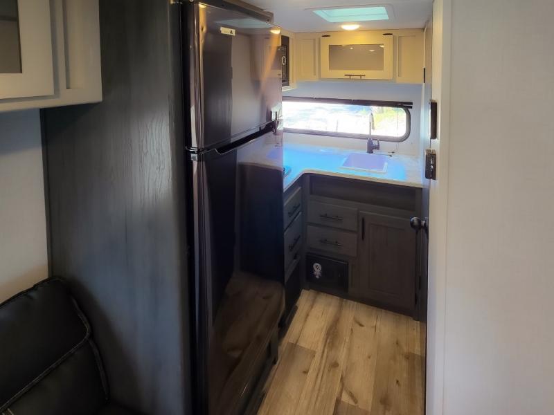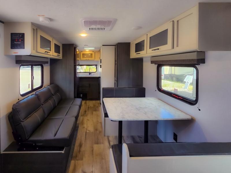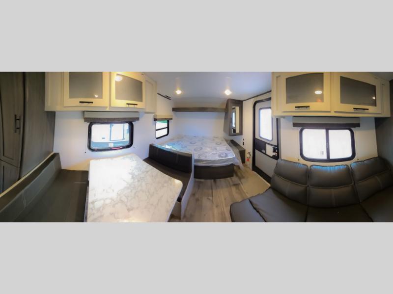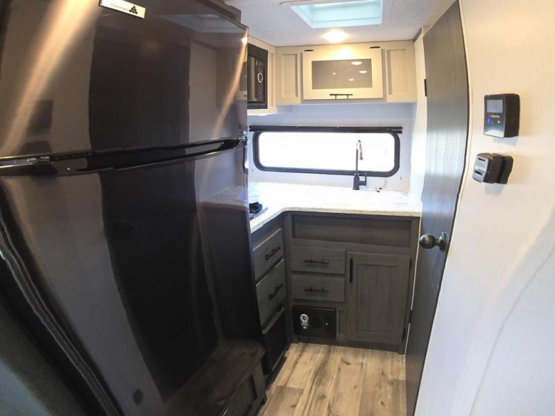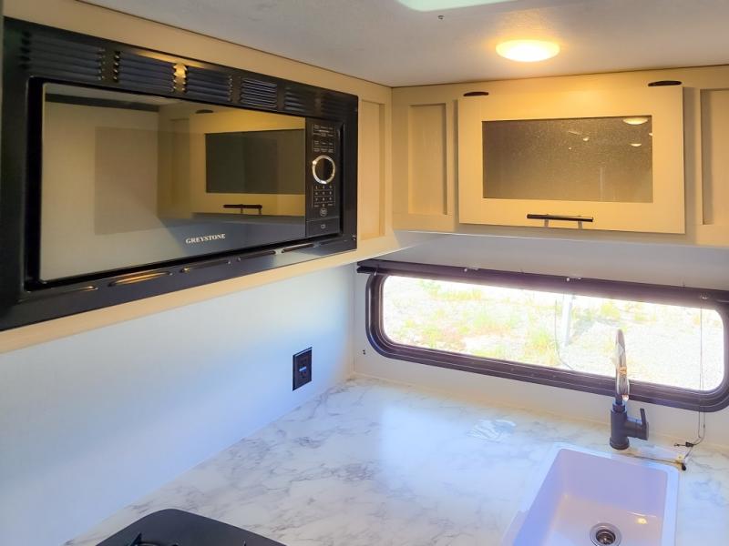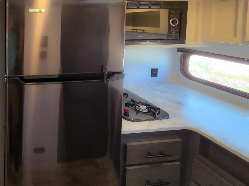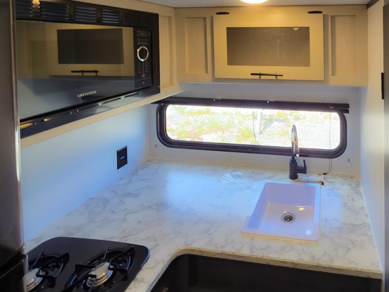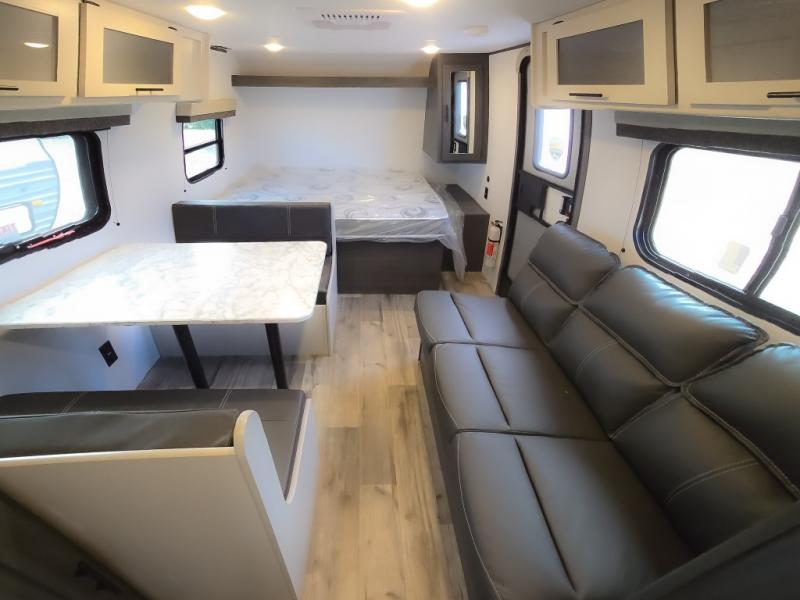 This cozy lightweight camper is waiting for you to enjoy a quiet retreat for two, or a few more if you like. This unit features sleeping for four to five with a queen bed up front, a booth dinette that can be converted, as well as a jack knife sofa opposite. A rear corner kitchen offers you a 10 cu. ft. 12V refrigerator for your perishables, and a pantry opposite for dry goods. There is a single sink for prep work and cleaning up, plus a two burner range top and microwave oven for cooking and warming leftovers up. A 10' awning creates added living space outside, and the front pass-through storage will hold all of your outside camping gear when not in use.