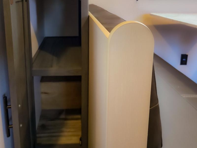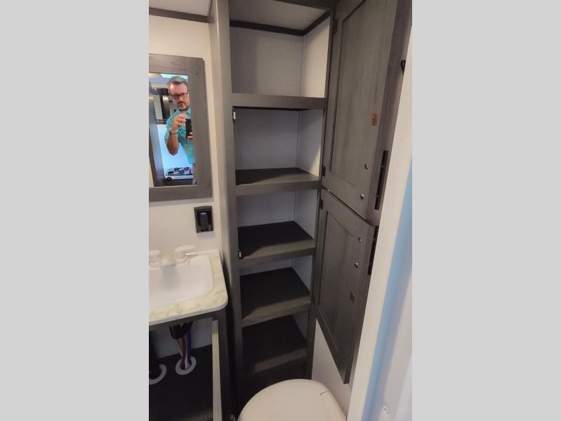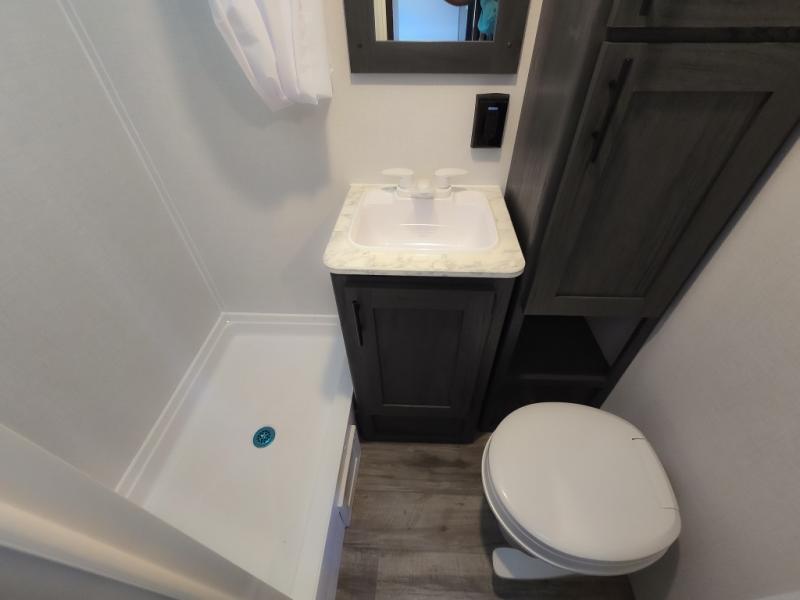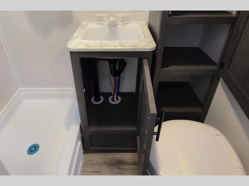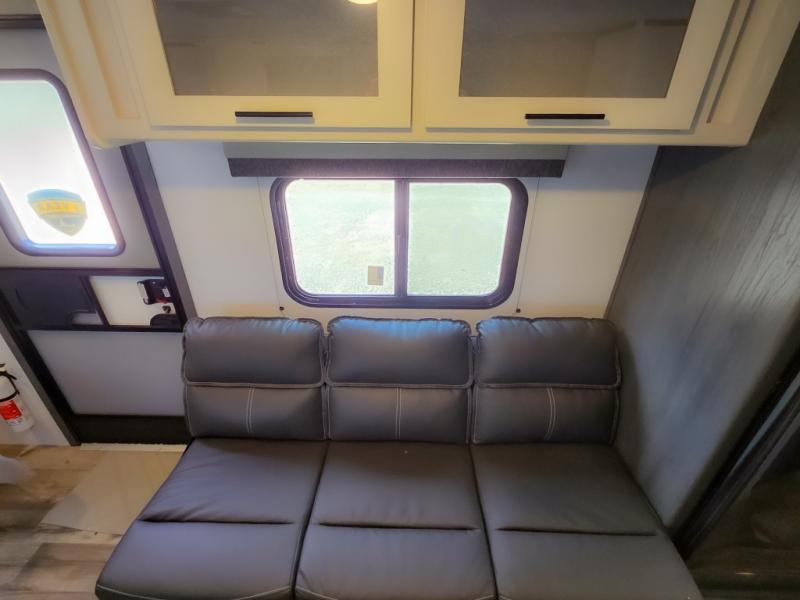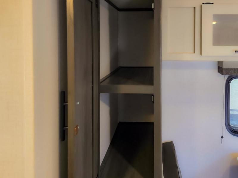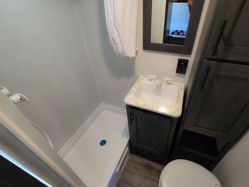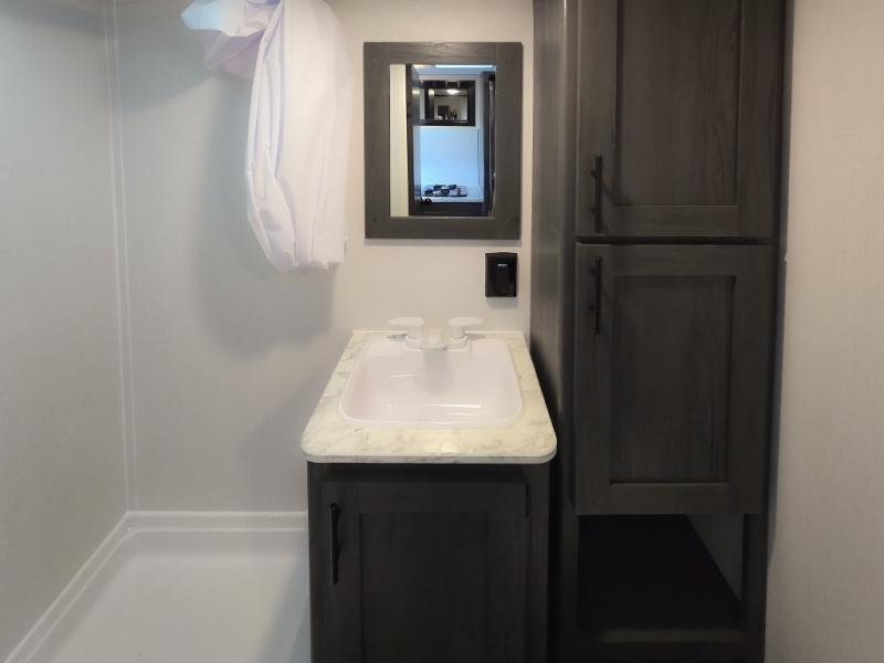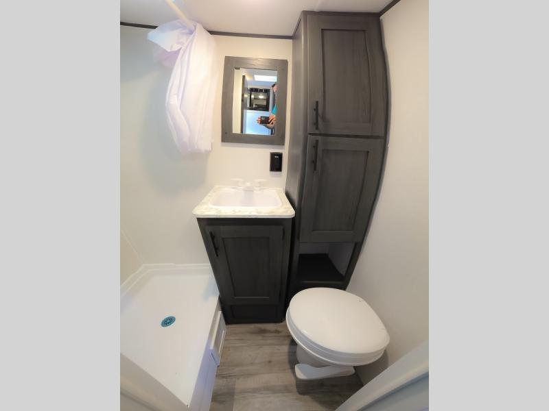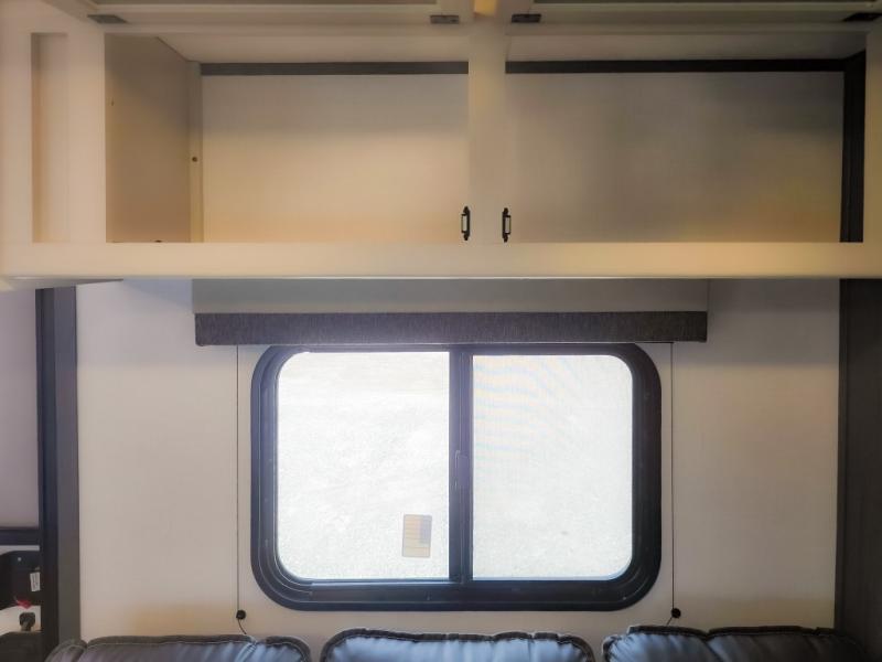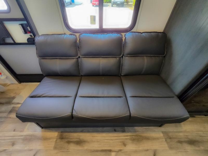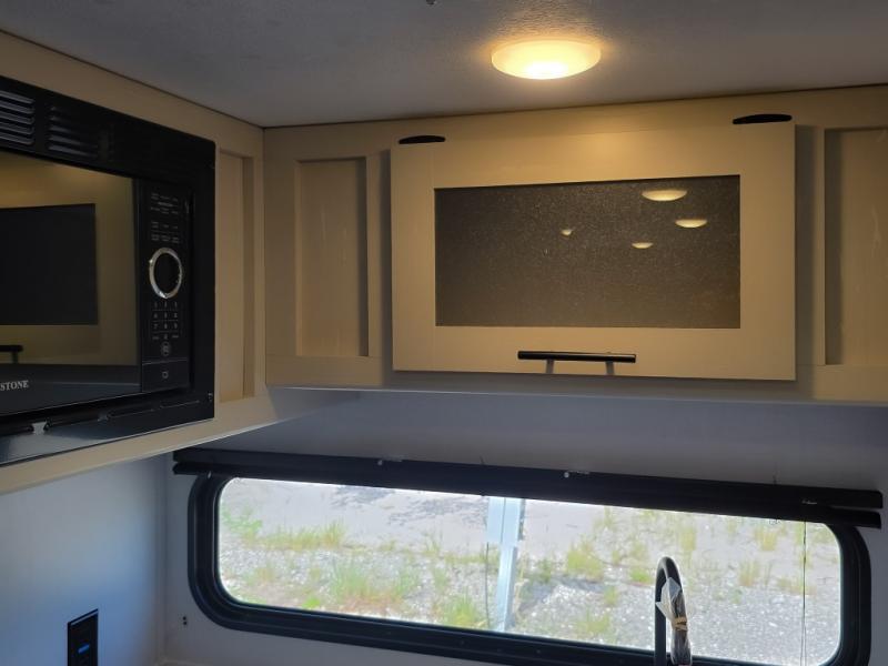 This cozy lightweight camper is waiting for you to enjoy a quiet retreat for two, or a few more if you like. This unit features sleeping for four to five with a queen bed up front, a booth dinette that can be converted, as well as a jack knife sofa opposite. A rear corner kitchen offers you a 10 cu. ft. 12V refrigerator for your perishables, and a pantry opposite for dry goods. There is a single sink for prep work and cleaning up, plus a two burner range top and microwave oven for cooking and warming leftovers up. A 10' awning creates added living space outside, and the front pass-through storage will hold all of your outside camping gear when not in use.