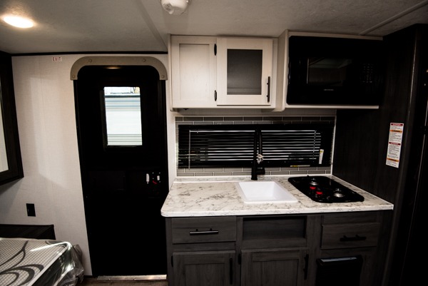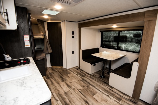 If you need space for seven or eight travelers, this Aspen Trail Mini might be it for you! There is a set of bunks in the rear curbside corner. Beneath this on the outside you will find an outdoor refrigerator that is perfect for drinks and snacks. A single slide features a booth dinette for all to enjoy meals and games at, and you will appreciate the added interior space inside as well. Up front, a queen bed with side closet at the foot of the bed, plus an overhead shelf across the front of the unit for your things. Along the curbside, your inside kitchen featuring a 10 cu. ft. 12V refrigerator, microwave oven, two-burner cooktop, and sink, plus overhead storage for your dishes and things. An outside 10' awning offers protection from the elements and also creates another outdoor living space for you to place camp chairs and a table, plus more.