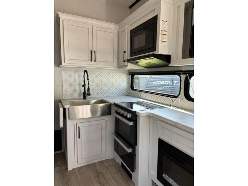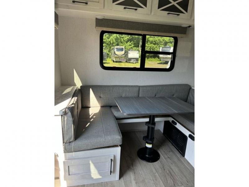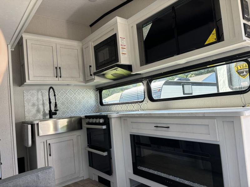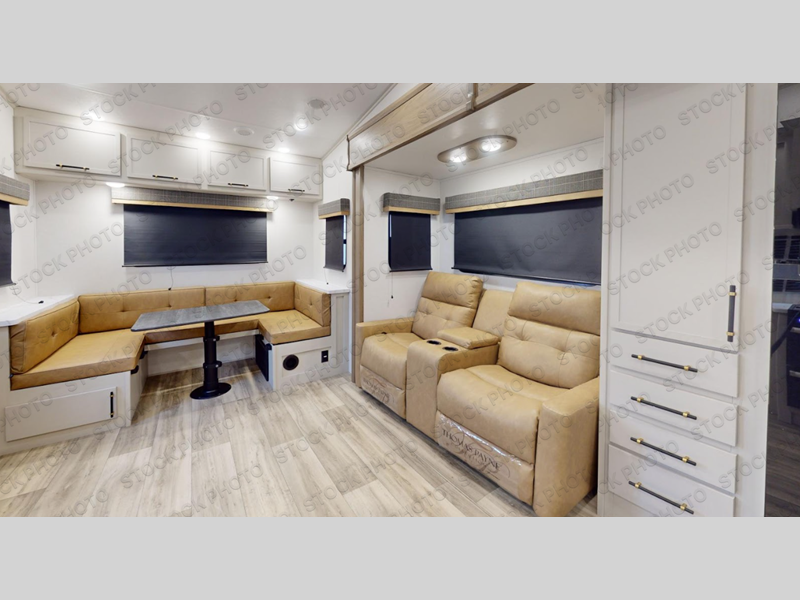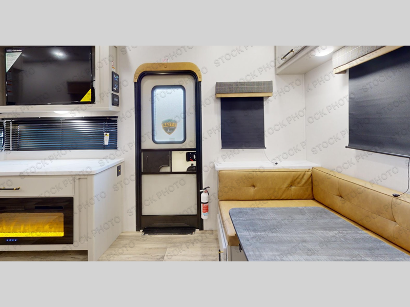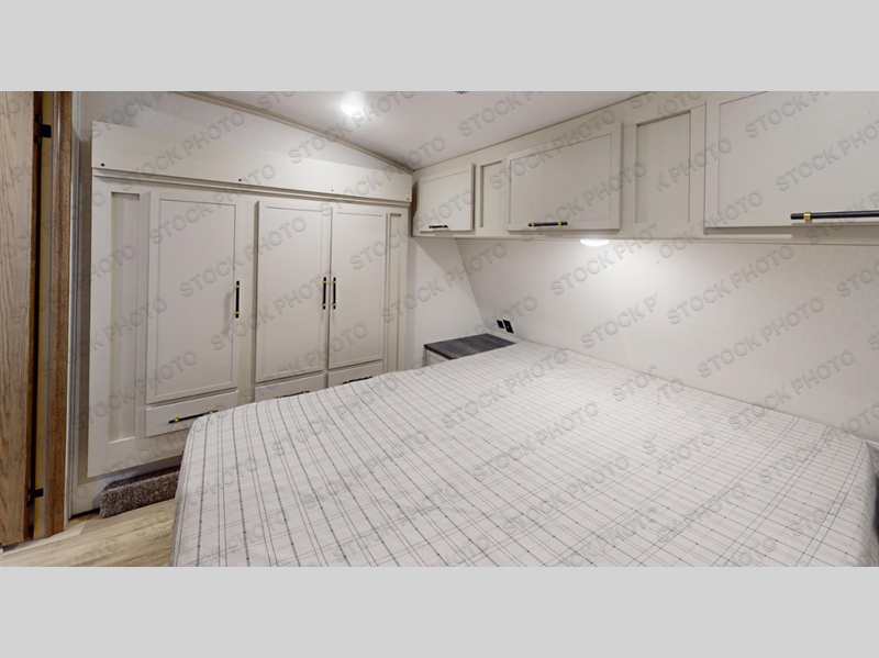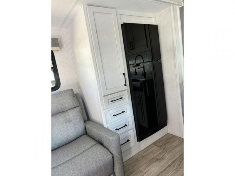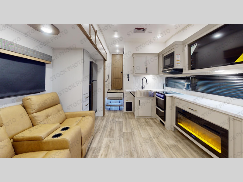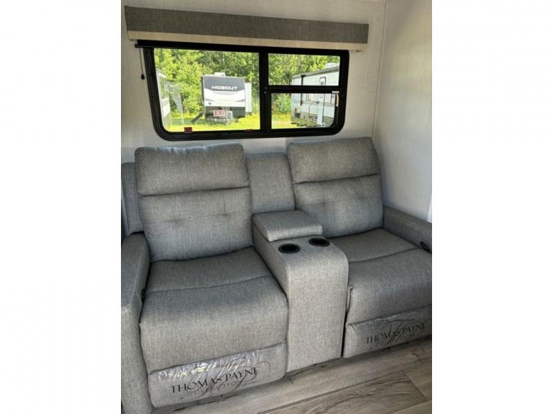 You will feel right at home in this fifth wheel! Enjoy your meals at the rear U-shaped dinette which can be prepared easier with the countertop extension or grill some burgers at the outdoor griddle. The theater seating offers a comfortable place to relax at night and is conveniently next to the pantry and 10 cu. ft. refrigerator so you don't have to go far for a refreshing beverage or snack. After a fun day at the beach head to the full bathroom to rinse the sand out of your hair in the walk-in shower with skylight for added natural lighting. The front private bedroom has a queen bed with closets on either side for your clothes, and there is even a closet with washer and dryer prep!