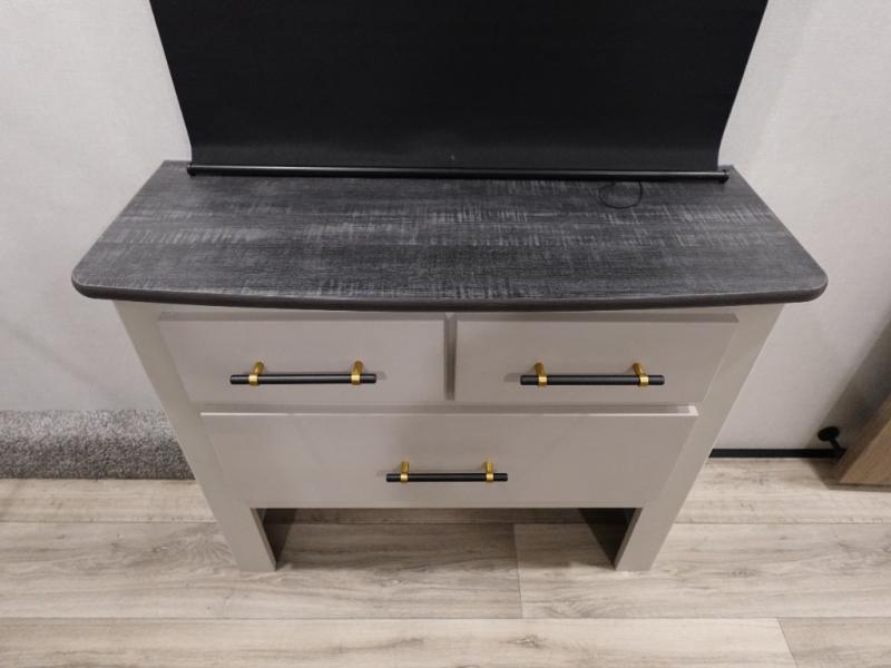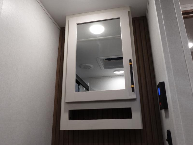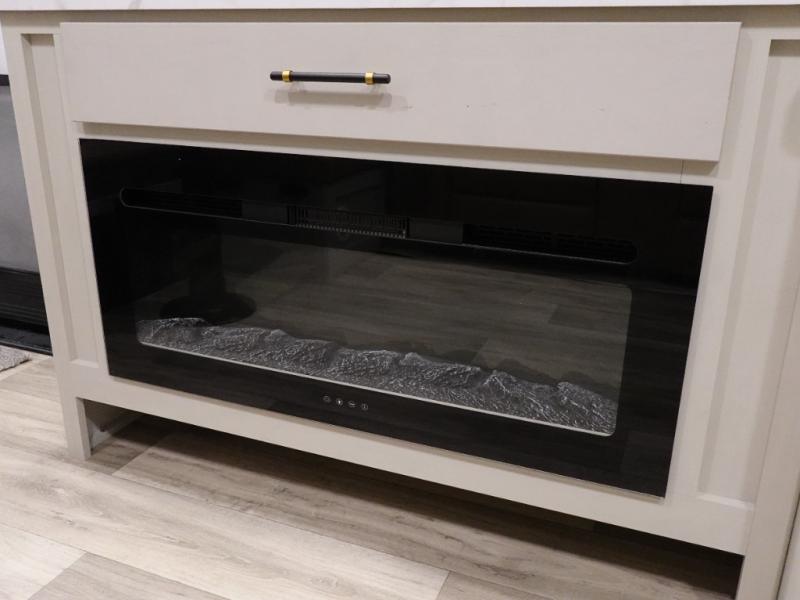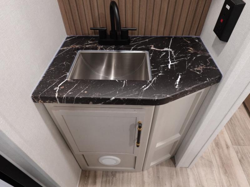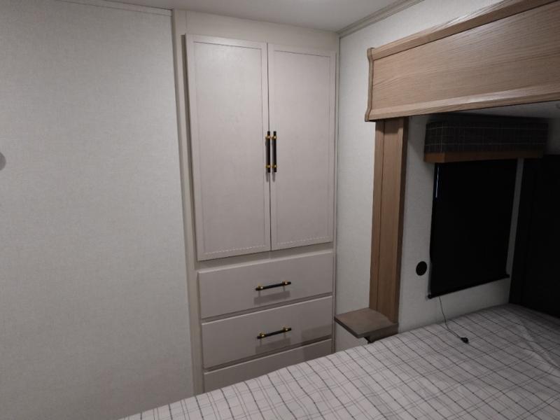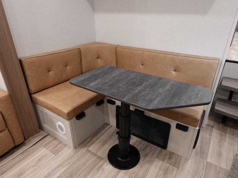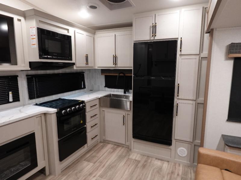 Plan to say awhile in this rear kitchen fifth wheel! You will fall in love with the front bedroom with a king bed slide out, large front closet, a dresser, plus a mounted TV for movies in bed. The rear kitchen includes plenty of space to prep meals, a farm style sink, plus a 10 cu. ft. 12V refrigerator and a pantry for food storage! You can get cozy on the theater seating slide out or at the cafe dinette, and the LED TV will ensure you'll never go bored on rainy days!