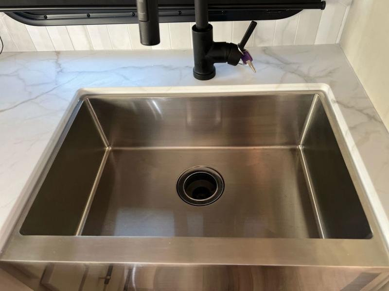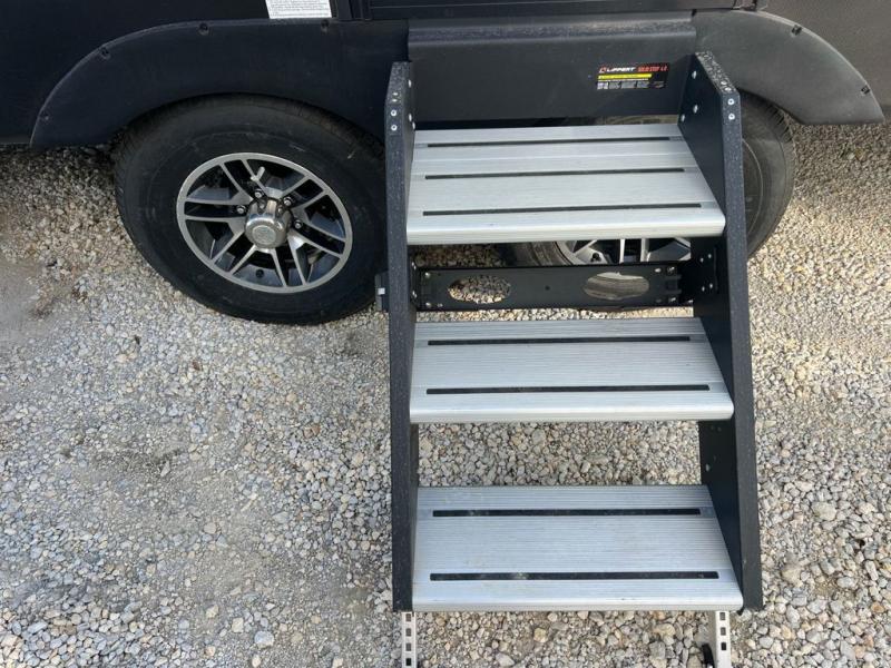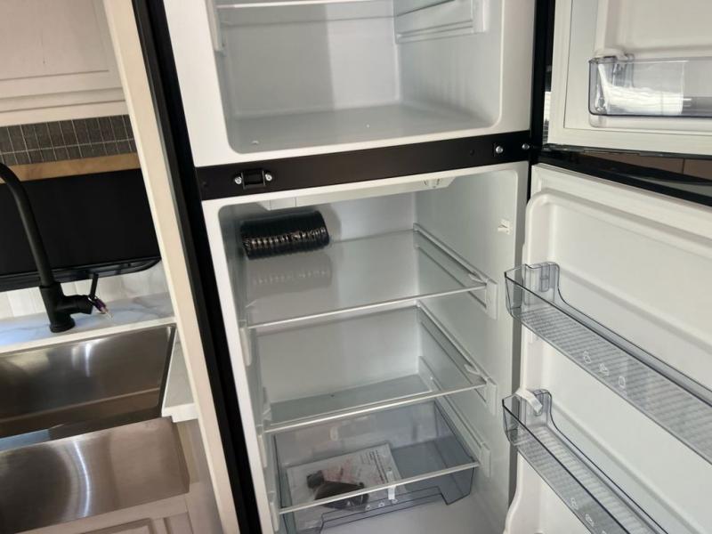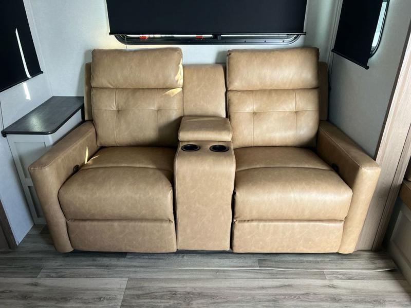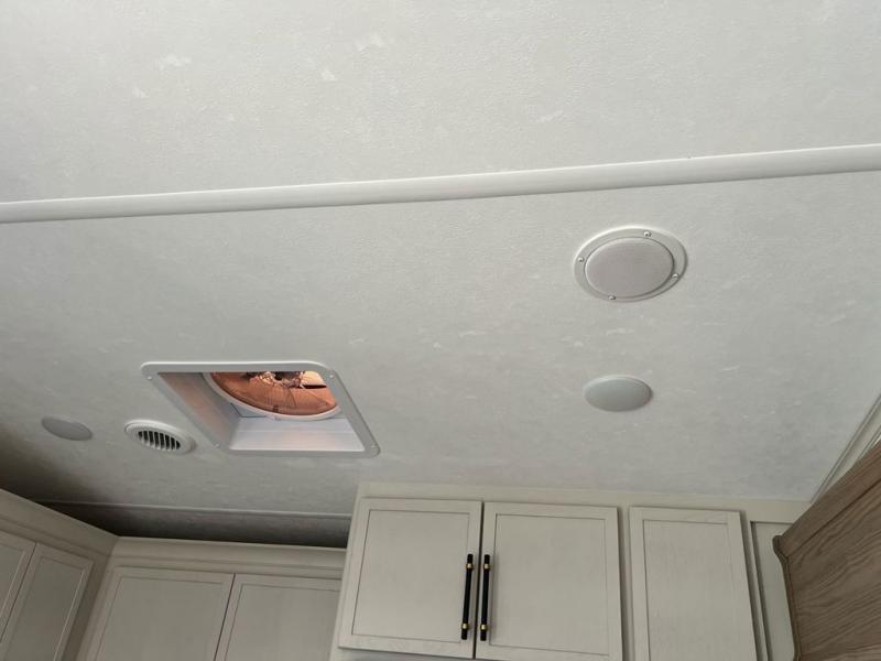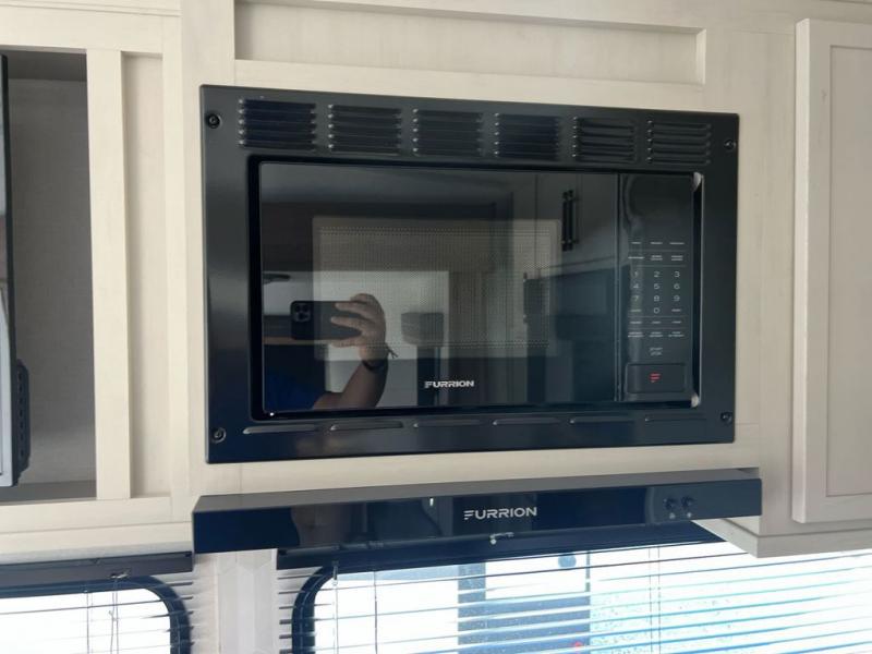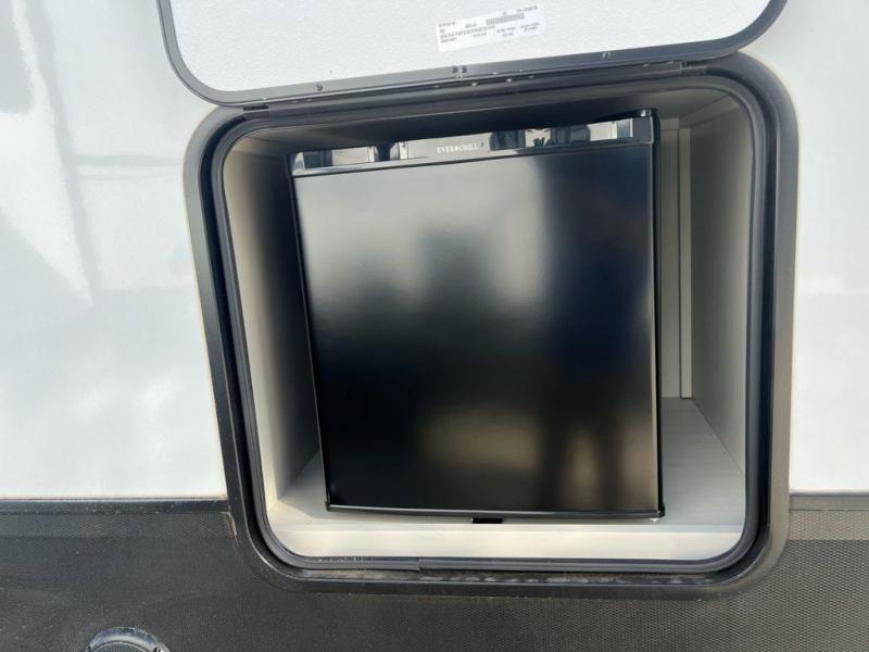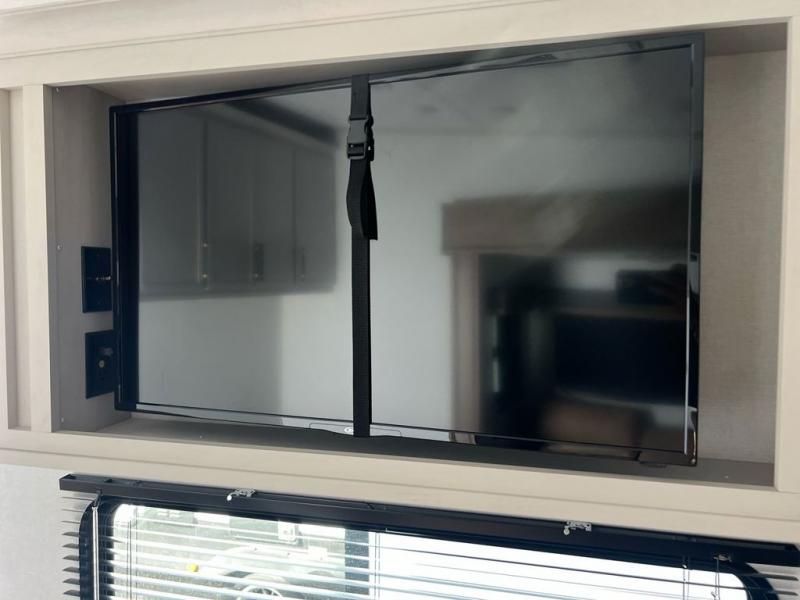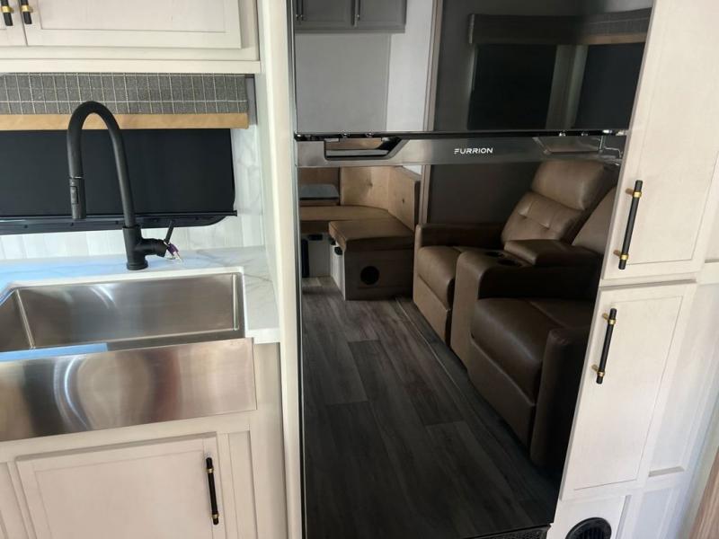 Plan to say awhile in this rear kitchen fifth wheel! You will fall in love with the front bedroom with a king bed slide out, large front closet, a dresser, plus a mounted TV for movies in bed. The rear kitchen includes plenty of space to prep meals, a farm style sink, plus a 10 cu. ft. 12V refrigerator and a pantry for food storage! You can get cozy on the theater seating slide out or at the cafe dinette, and the LED TV will ensure you'll never go bored on rainy days!