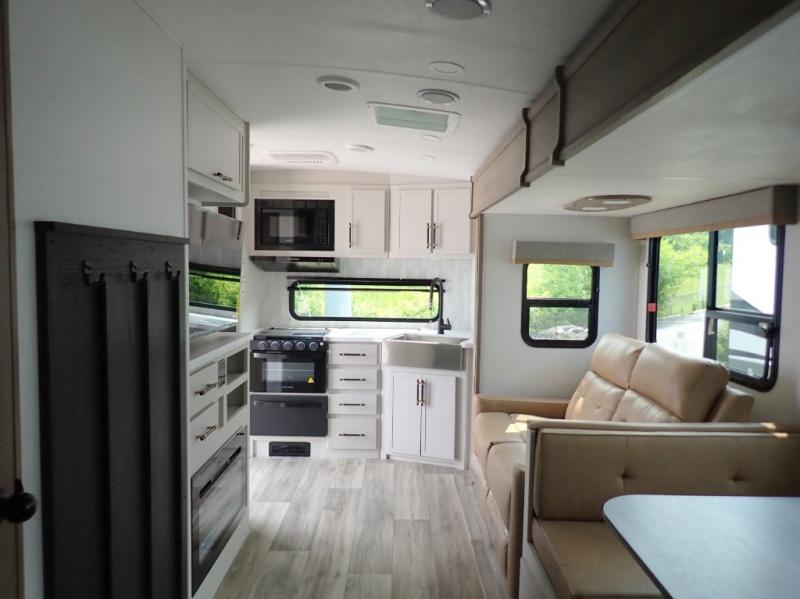 Step right in to this spacious rear kitchen travel trailer for unforgettable camping trips! The rear kitchen includes a three burner cooktop with an oven and glass cover, a microwave oven, and a 10 cu. ft. 12V refrigerator for perishables. Within the large slide out, you can dine at the booth dinette and relax on the theater seats after dinner. There is also an HD LED TV across from the sofa for easy viewing. The second slide out is found in the front bedroom, along with a king bed, storage space, and a front seating space. You'll also find plenty of storage throughout, including exterior storage and an entry closet to keep jackets, food, and more!