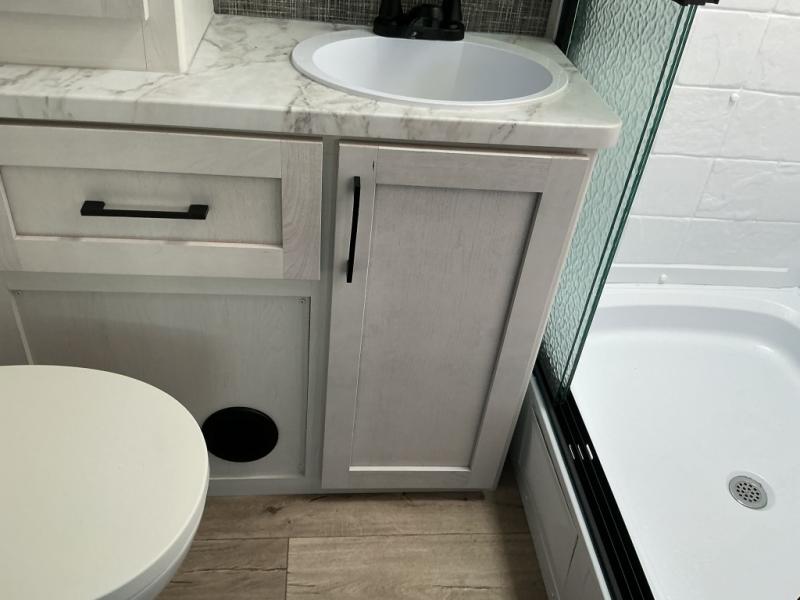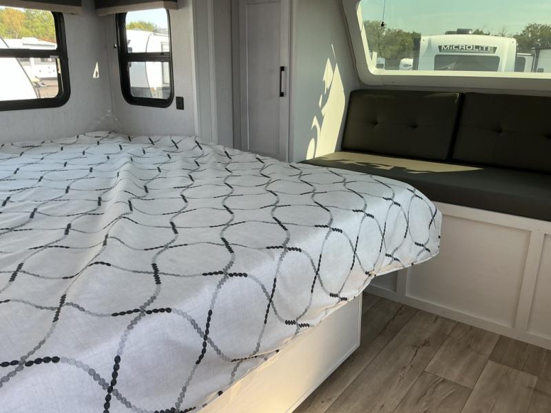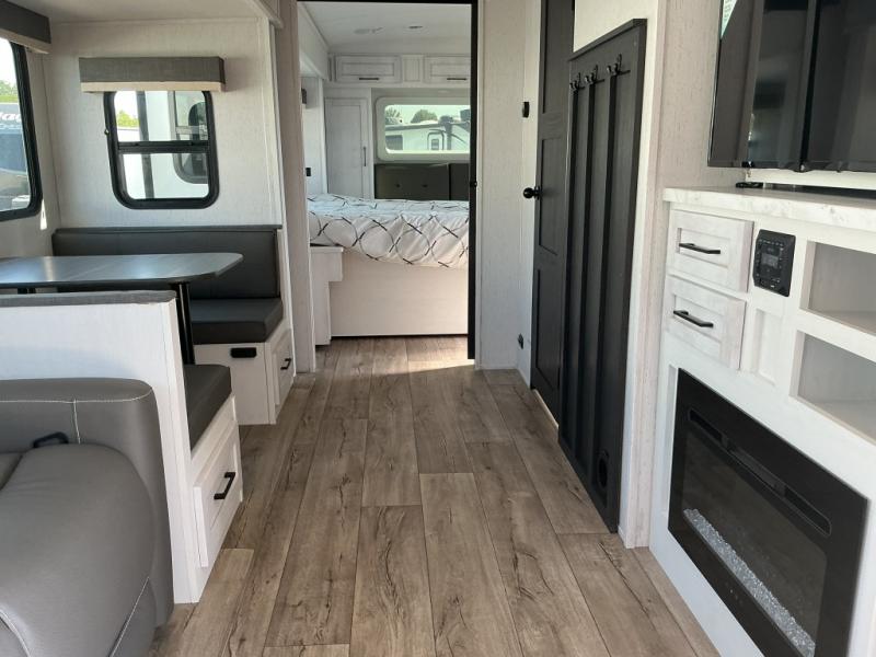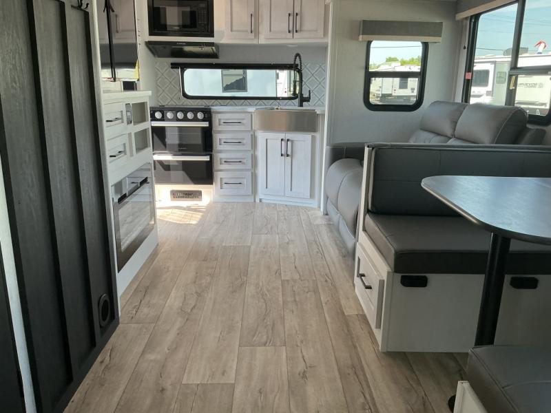 Step right in to this spacious rear kitchen travel trailer for unforgettable camping trips! The rear kitchen includes a three burner cooktop with an oven and glass cover, a microwave oven, and a 10 cu. ft. 12V refrigerator for perishables. Within the large slide out, you can dine at the booth dinette and relax on the theater seats after dinner. There is also an HD LED TV across from the sofa for easy viewing. The second slide out is found in the front bedroom, along with a king bed, storage space, and a front seating space. You'll also find plenty of storage throughout, including exterior storage and an entry closet to keep jackets, food, and more!