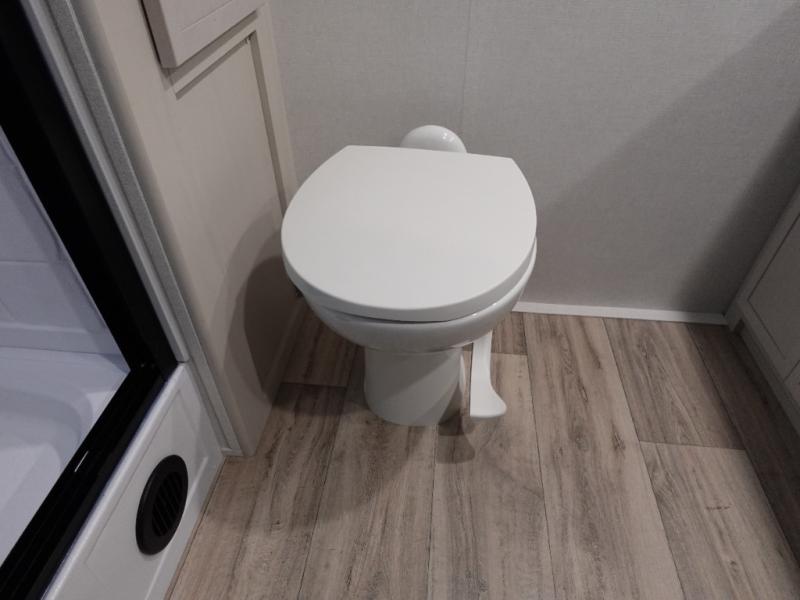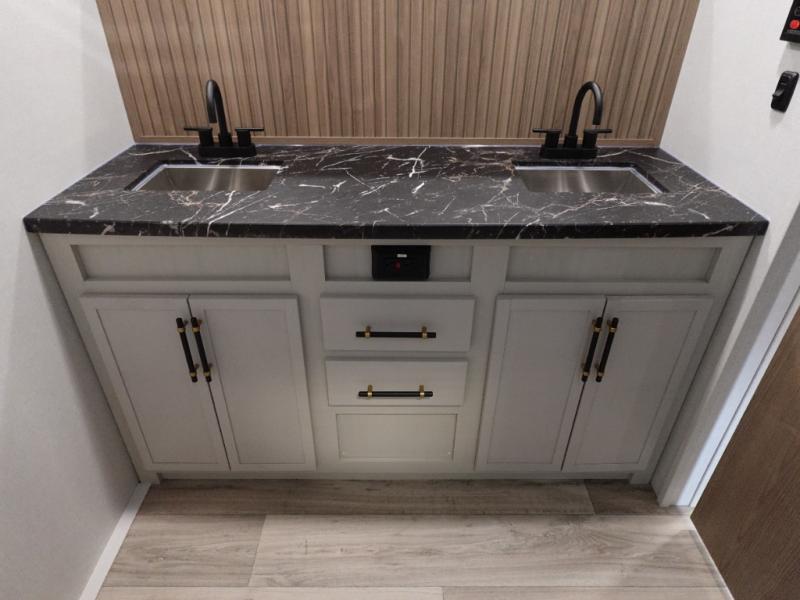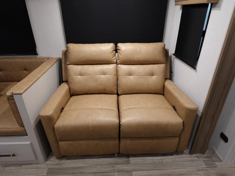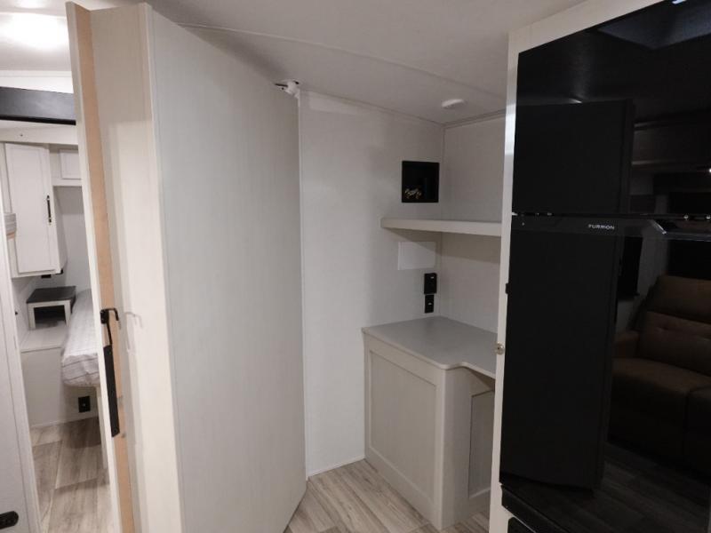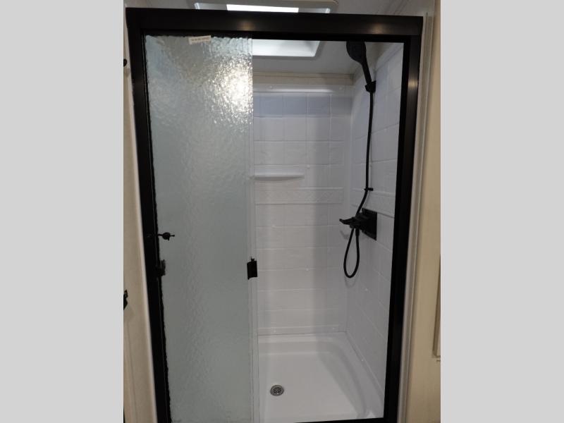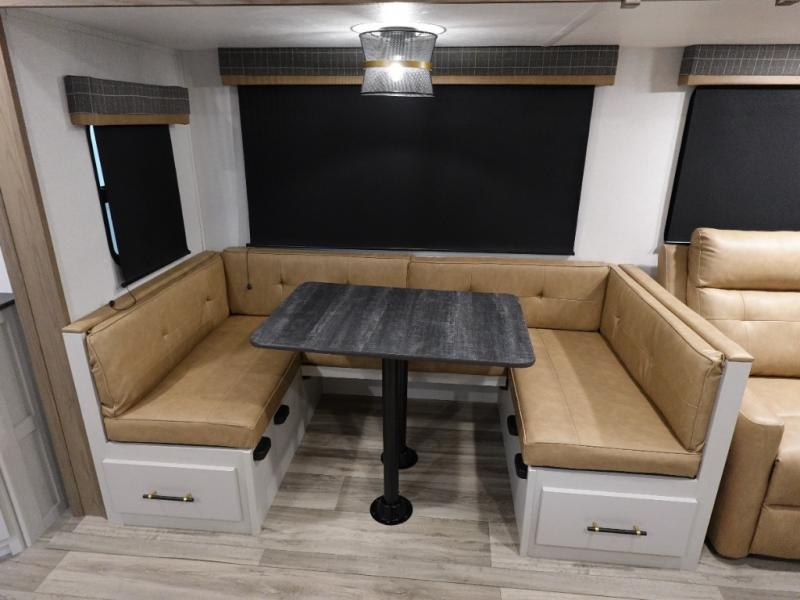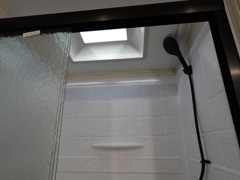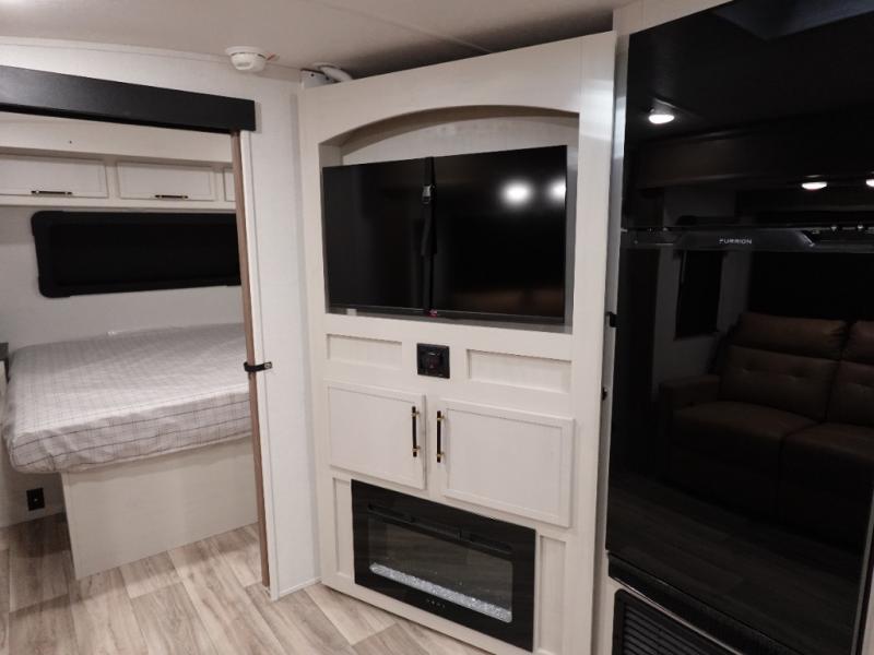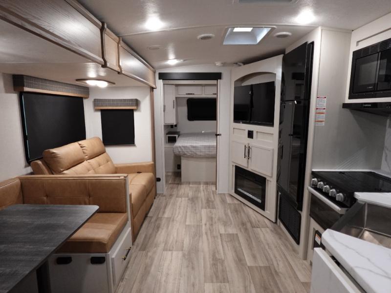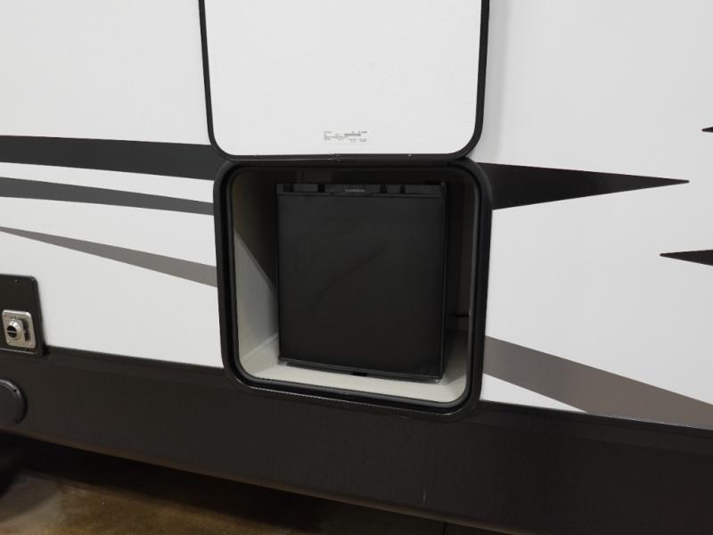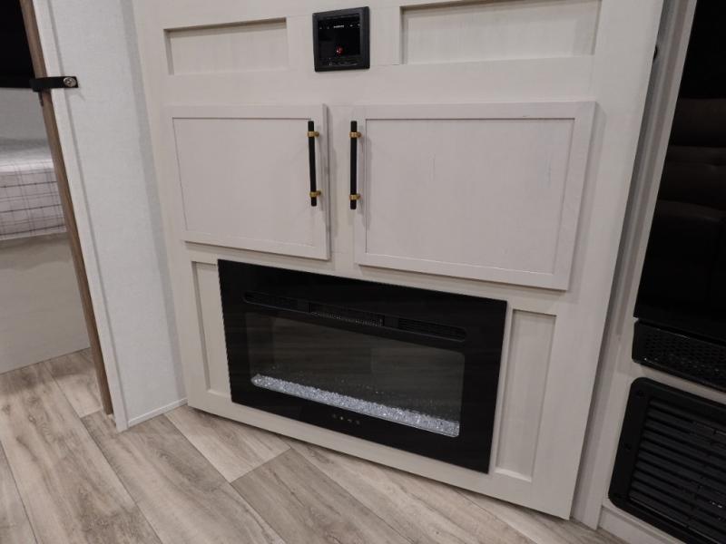 Enjoy relaxing weekends at the campground in this cozy travel trailer for five to six. The large slide will provide a spacious living area, and there is a U-shaped dinette and tri-fold sofa within the slide for seating and sleeping space. The hinged entertainment center hides the pantry, and the fireplace will make it feel more like home. Prepare home cooked meals on the three burner range, or use the microwave oven. You'll find the countertop extension will provide more space to prep meals, and the 10 cu. ft. double door refrigerator can store your perishables for the whole weekend. This model also includes a spacious full rear bath with dual bath sinks so two can get ready at the same time, and you'll love the front private bedroom with a king bed for all-around comfort!