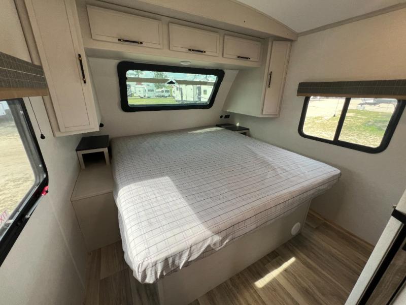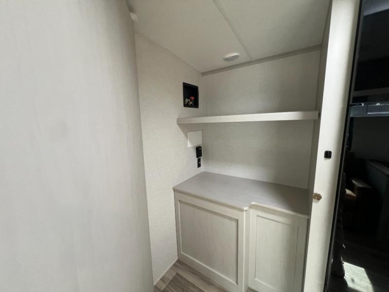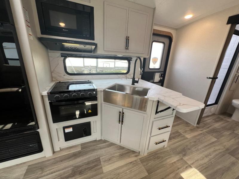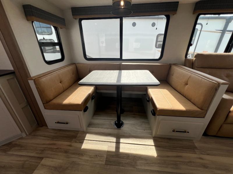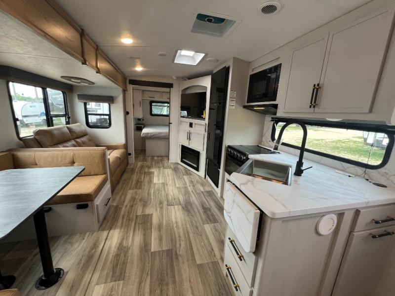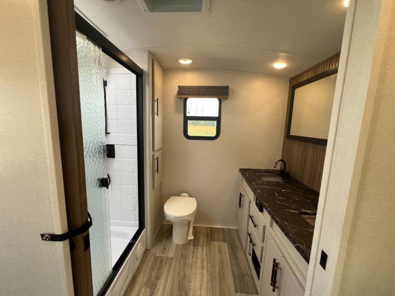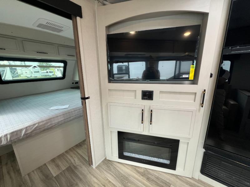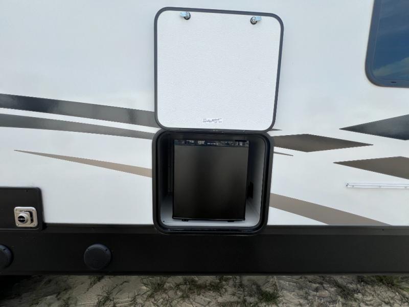 Enjoy relaxing weekends at the campground in this cozy travel trailer for five to six. The large slide will provide a spacious living area, and there is a U-shaped dinette and tri-fold sofa within the slide for seating and sleeping space. The hinged entertainment center hides the pantry, and the fireplace will make it feel more like home. Prepare home cooked meals on the three burner range, or use the microwave oven. You'll find the countertop extension will provide more space to prep meals, and the 10 cu. ft. double door refrigerator can store your perishables for the whole weekend. This model also includes a spacious full rear bath with dual bath sinks so two can get ready at the same time, and you'll love the front private bedroom with a king bed for all-around comfort!