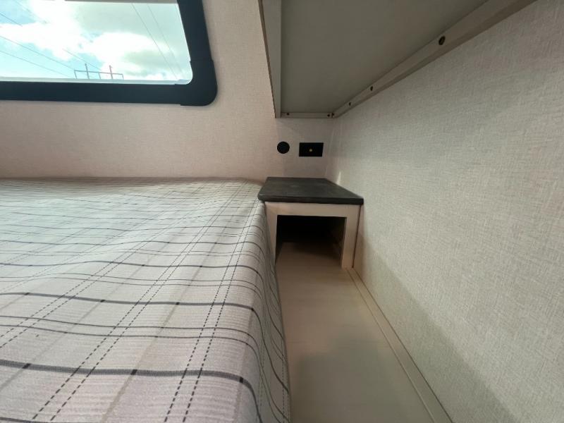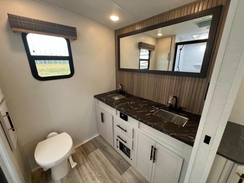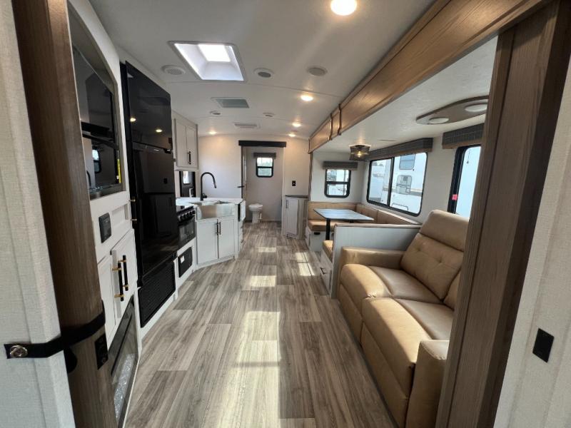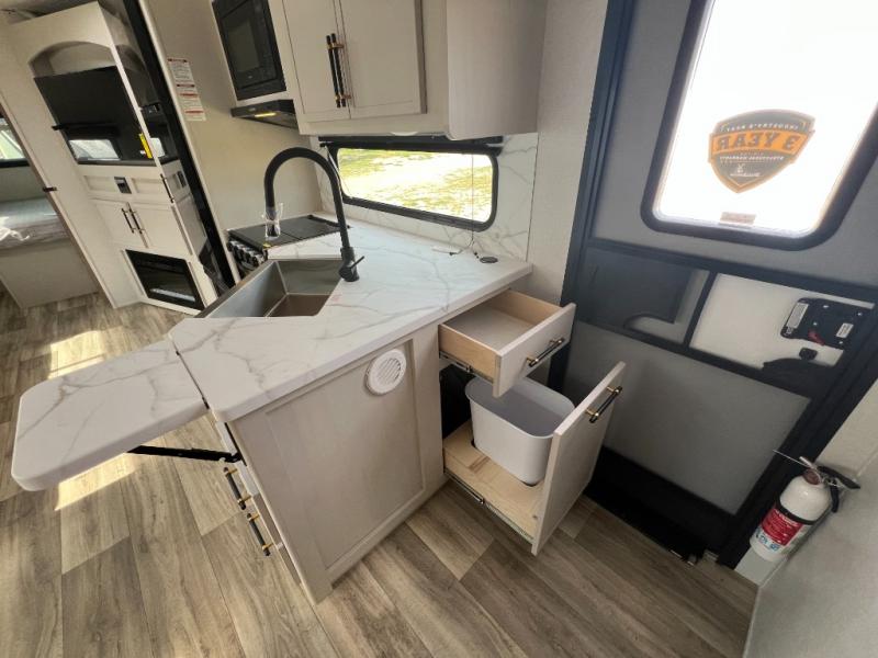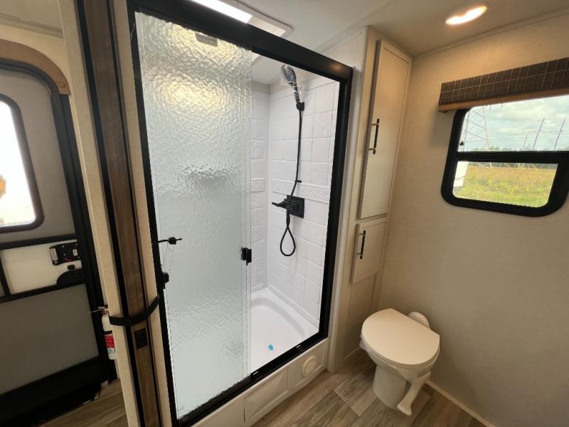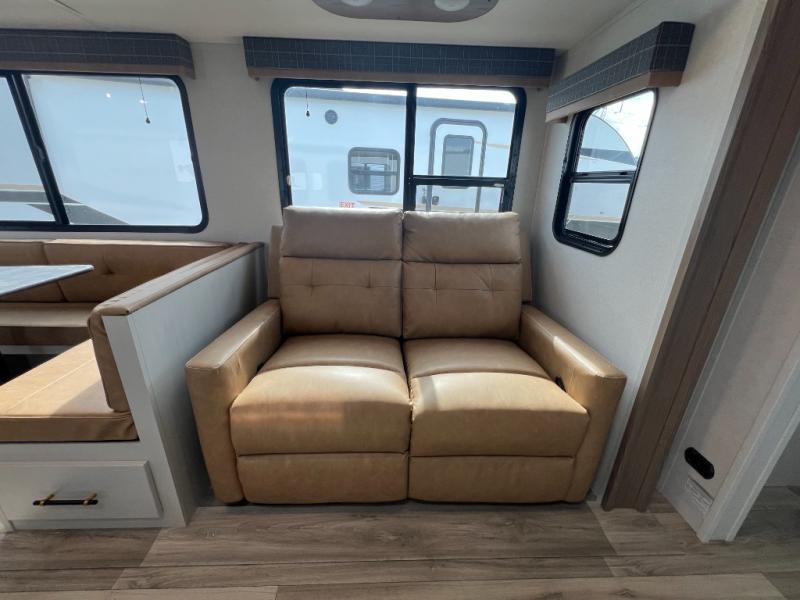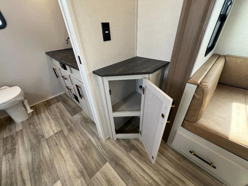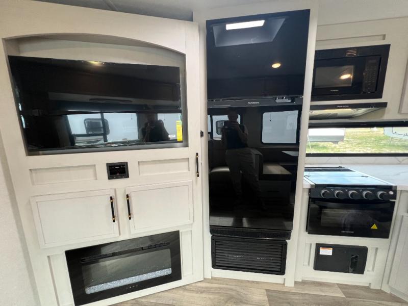 Enjoy relaxing weekends at the campground in this cozy travel trailer for five to six. The large slide will provide a spacious living area, and there is a U-shaped dinette and tri-fold sofa within the slide for seating and sleeping space. The hinged entertainment center hides the pantry, and the fireplace will make it feel more like home. Prepare home cooked meals on the three burner range, or use the microwave oven. You'll find the countertop extension will provide more space to prep meals, and the 10 cu. ft. double door refrigerator can store your perishables for the whole weekend. This model also includes a spacious full rear bath with dual bath sinks so two can get ready at the same time, and you'll love the front private bedroom with a king bed for all-around comfort!