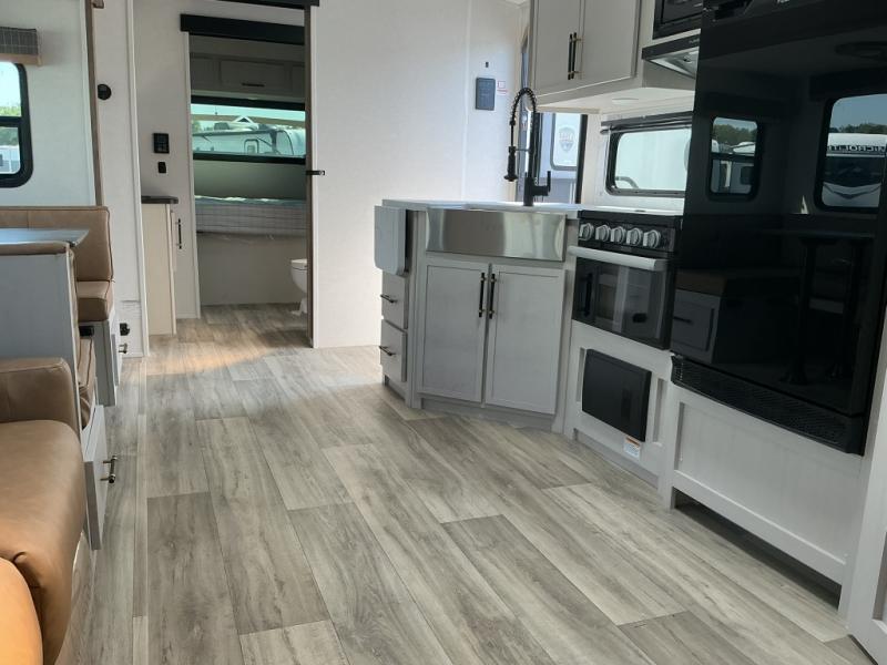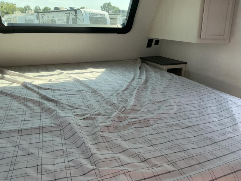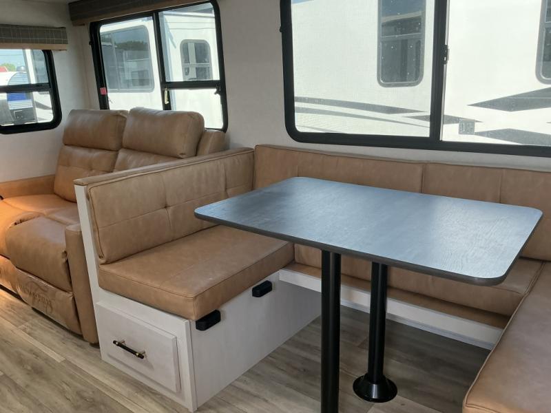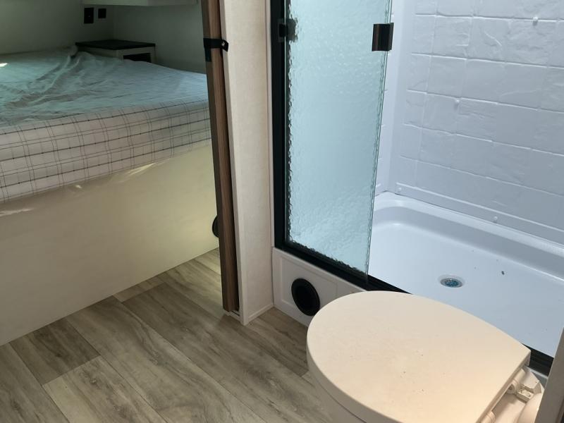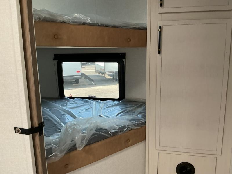 The family will love camping in this travel trailer! The kids can sleep in the rear private bunkhouse with the double-size bunk beds and store their clothes in the wardrobe. They can even bring a friend or two to sleep on the tri-fold sofa and U-shaped dinette slide once they are converted. You will enjoy your own privacy with the front bedroom which has a king bed with wardrobes/nightstands on either side and an entrance into the walk-through bathroom. You will easily be able to prepare your best meals in the kitchen with the countertop extension, the 10 cu. ft. double door refrigerator, and the glass top three burner cooktop with an oven, plus there is a pantry behind the hinged entertainment center which has an LED TV to watch your favorite movies!