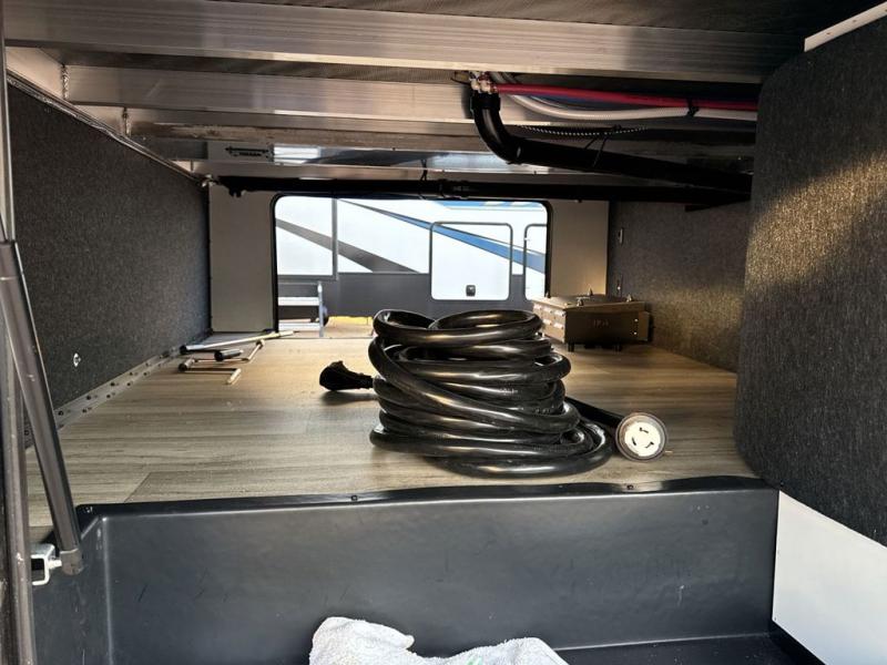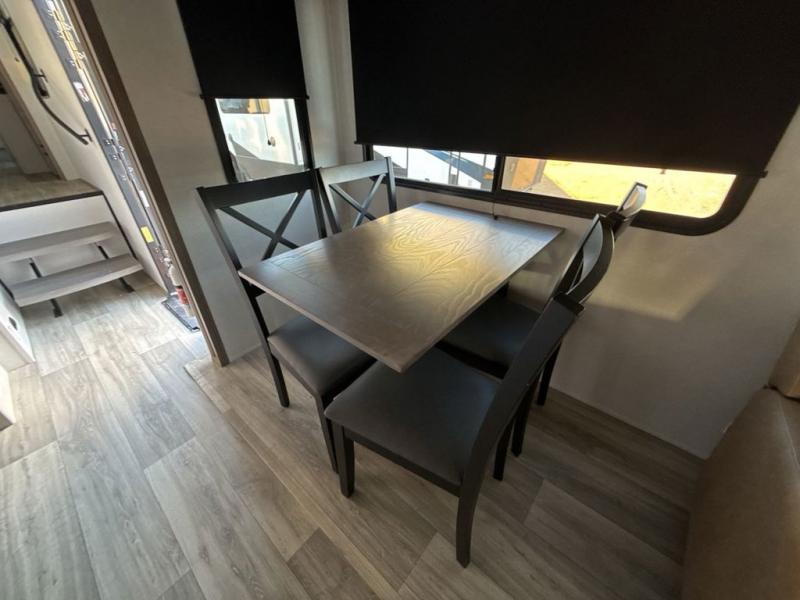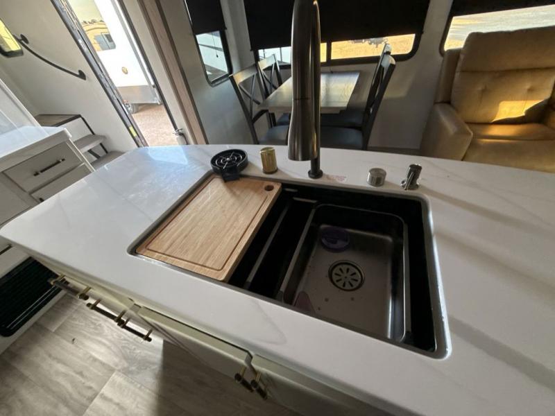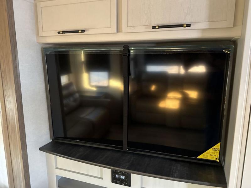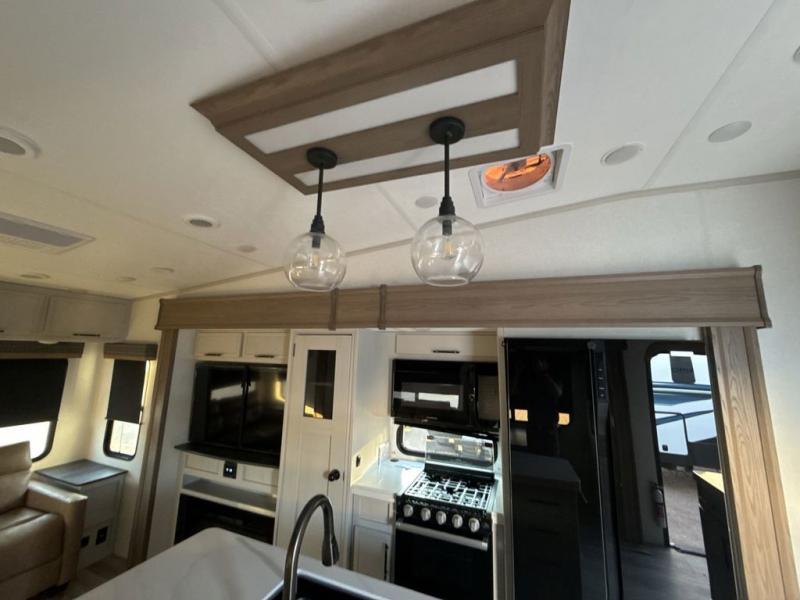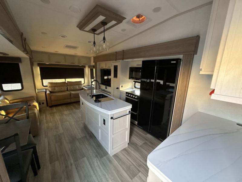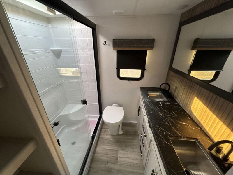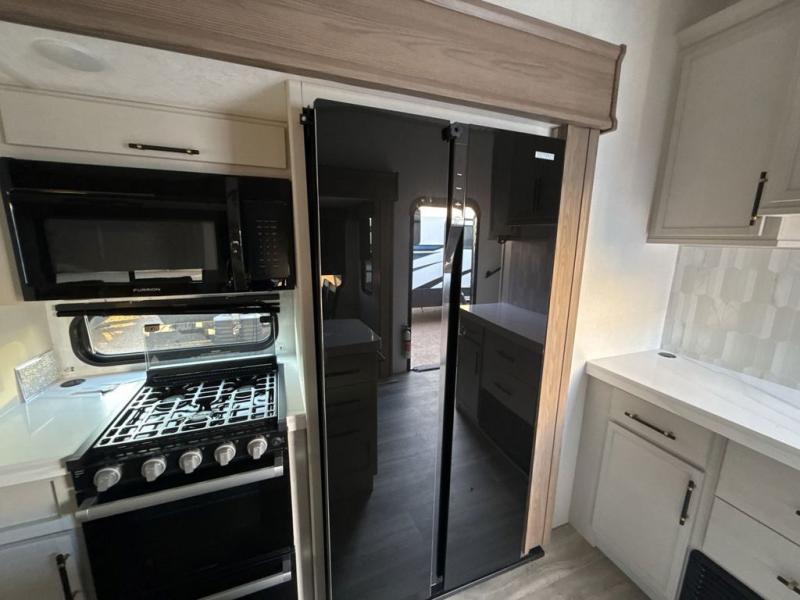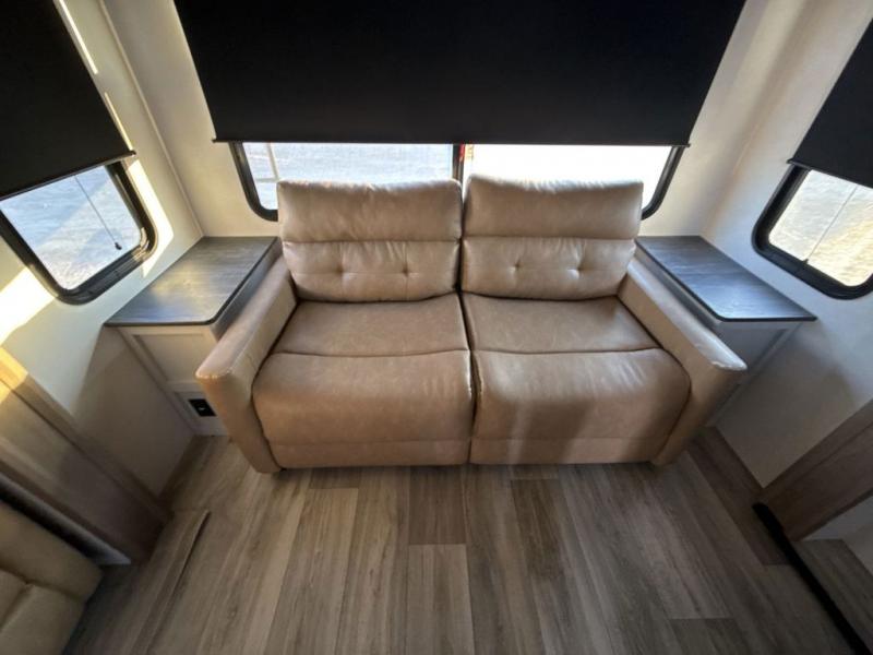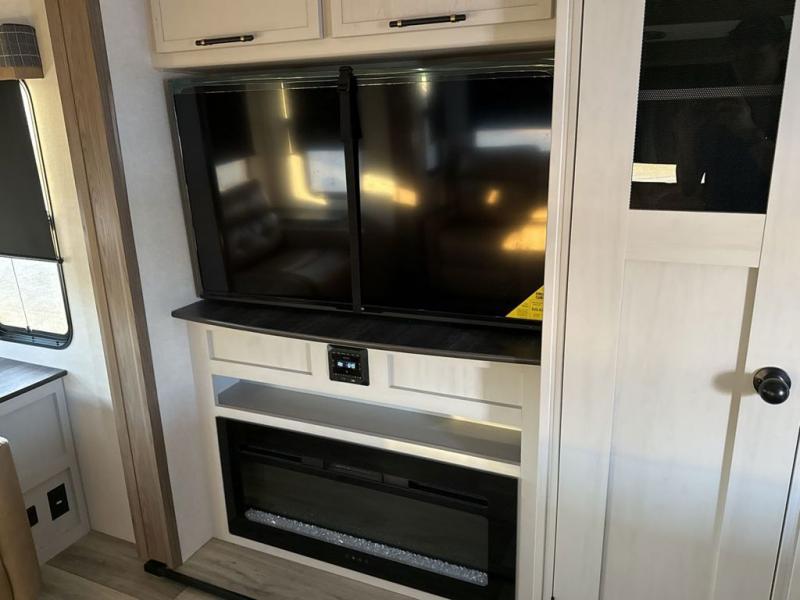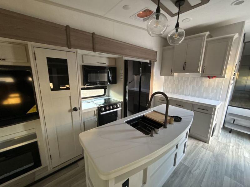 Two can get ready at once with a dual sink vanity in the full bathroom of this fifth wheel! Enjoy a good night's rest and interior space with the king bed slide in the front private bedroom which also has a front wardrobe to keep your clothes looking their best, and a closet with washer/dryer prep. The chef will have an easy time preparing meals in the kitchen with the island, the extra countertop space below the hutch, and the glass top three burner cooktop with the oven. The rear living area has a tri-fold sofa and theater seating across from an entertainment center with a fireplace and an HD LED TV!