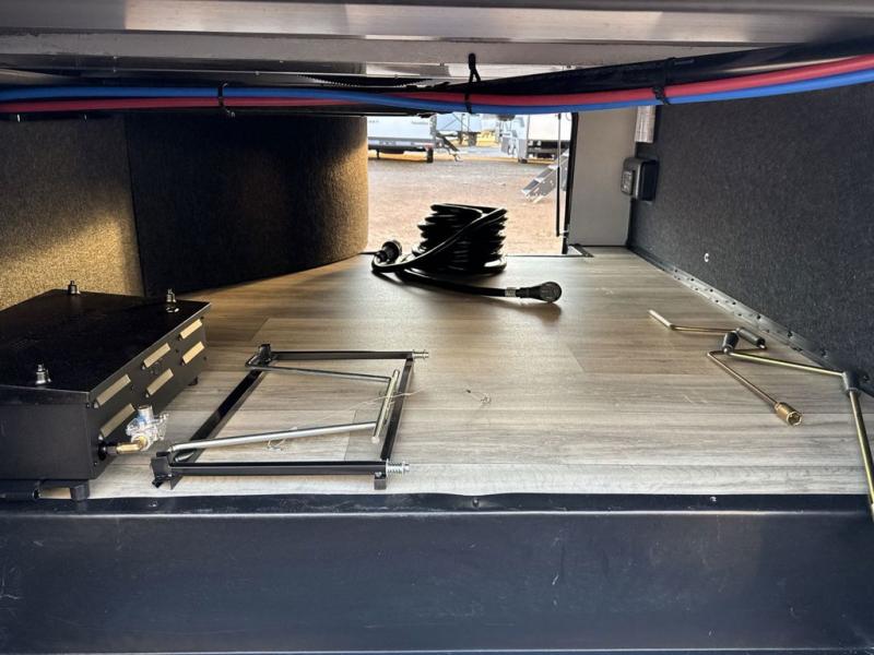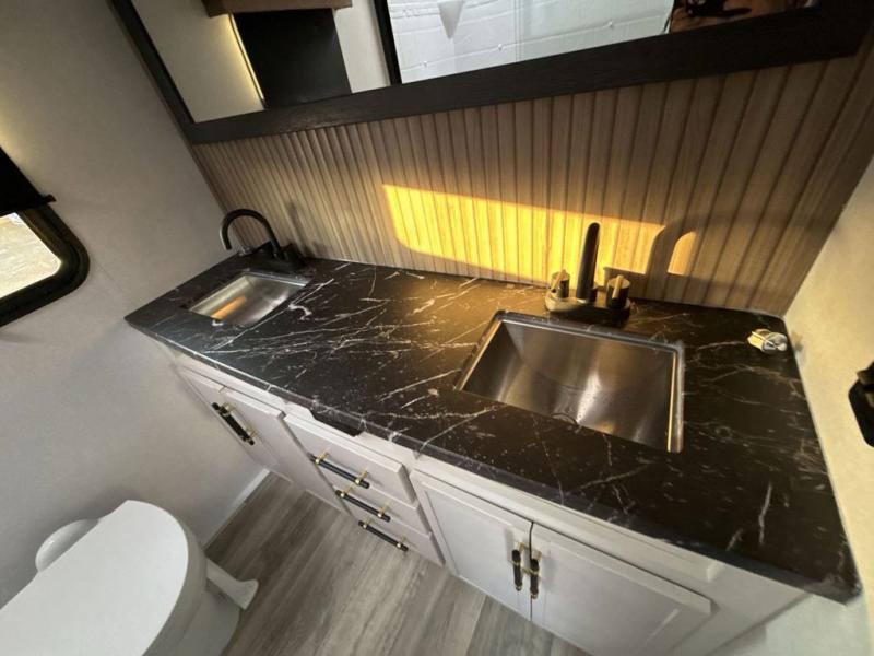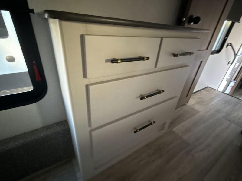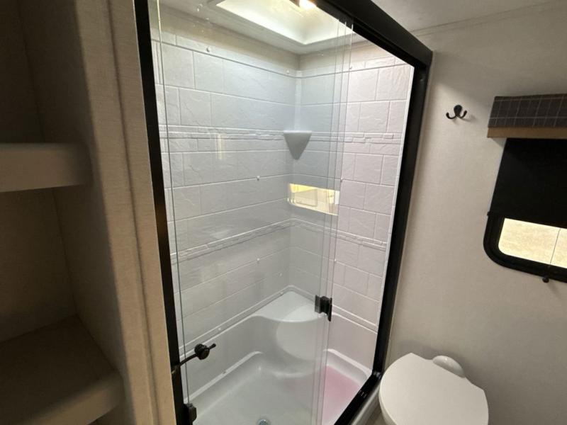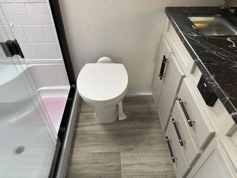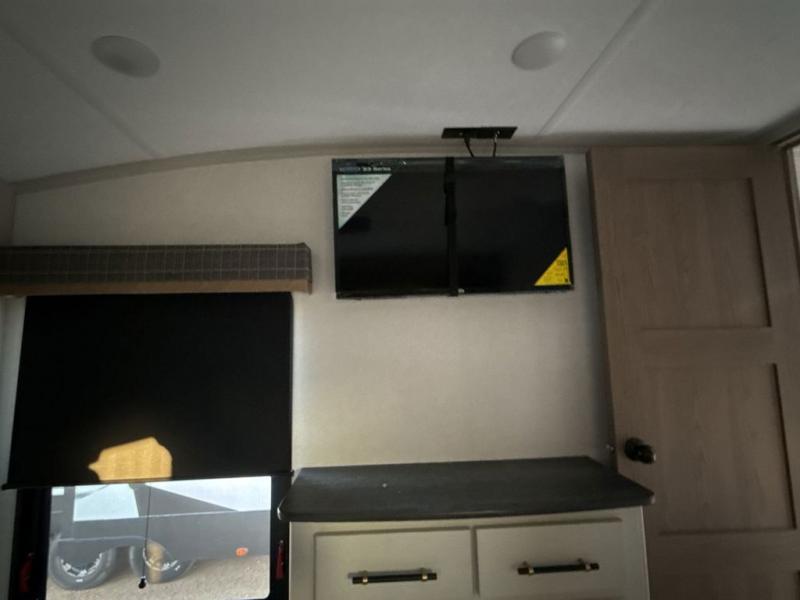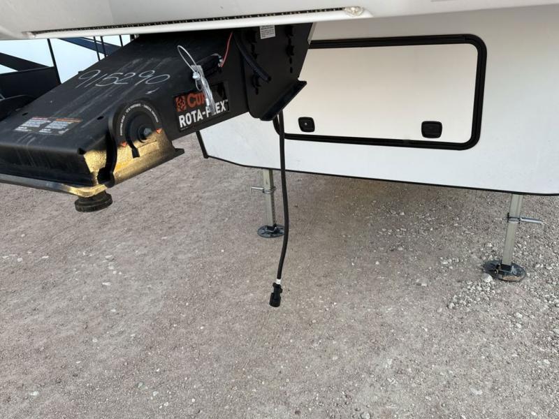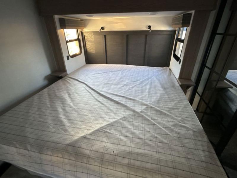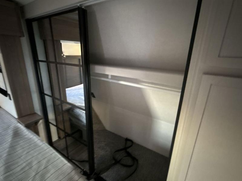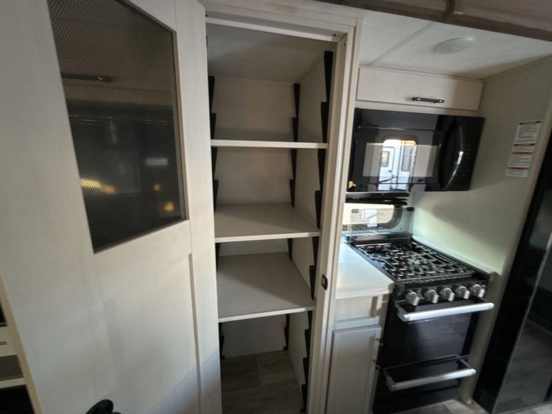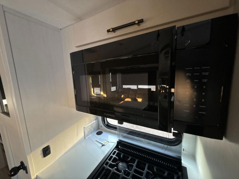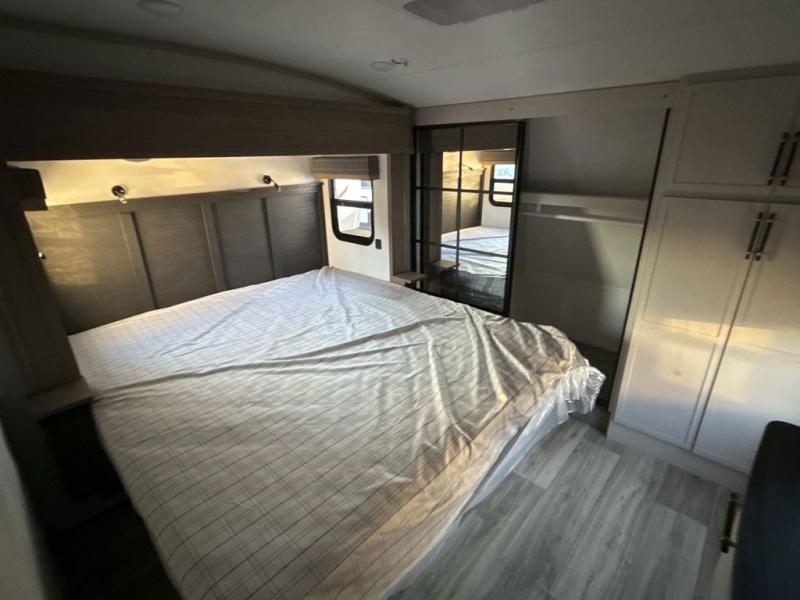 Two can get ready at once with a dual sink vanity in the full bathroom of this fifth wheel! Enjoy a good night's rest and interior space with the king bed slide in the front private bedroom which also has a front wardrobe to keep your clothes looking their best, and a closet with washer/dryer prep. The chef will have an easy time preparing meals in the kitchen with the island, the extra countertop space below the hutch, and the glass top three burner cooktop with the oven. The rear living area has a tri-fold sofa and theater seating across from an entertainment center with a fireplace and an HD LED TV!