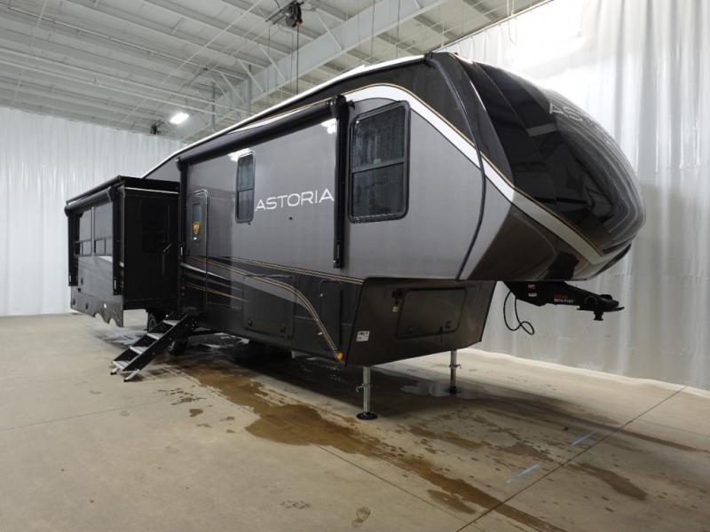 Each one of these Dutchmen RV Astoria Platinum fifth wheels feature a fiberglass exterior for added durability and an All Weather Thermal Package so you can camp all year long! There are also MorRyde Solid entry steps, slam latch baggage doors, and many more exterior conveniences. You'll enjoy a 200W solar panel for off-grid capabilities, an X1 back up camera for easy parking, and a power awning with LED lights for an inviting outdoor space. The interior is designed with bathroom backsplash, night shades throughout the living area, and Thomas Payne furniture collection. The on-demand tankless water heater will provide endless hot showers, and the dual ducted A/C will keep you cool all summer long.