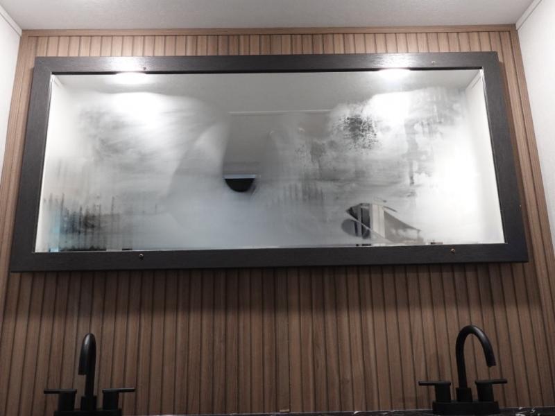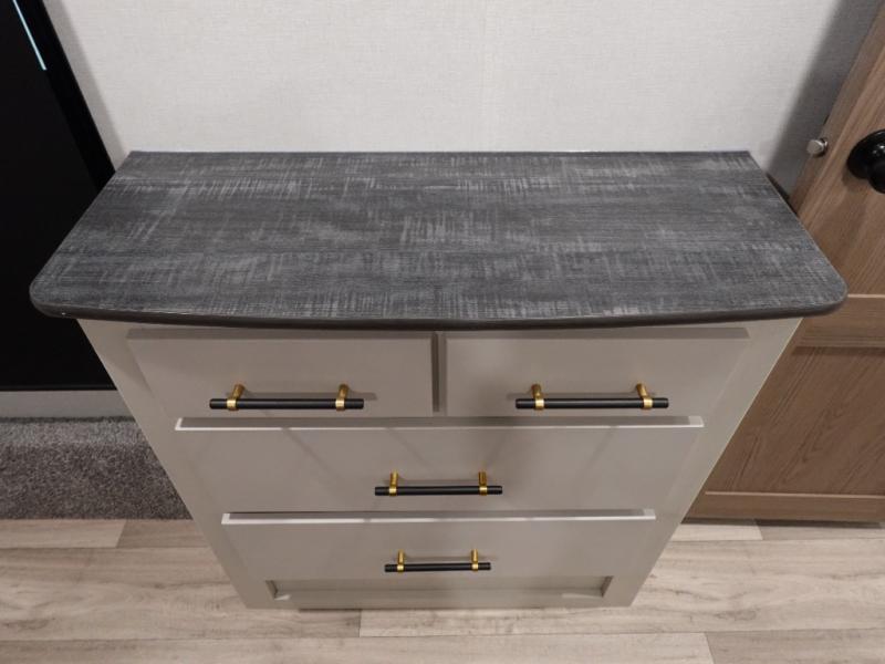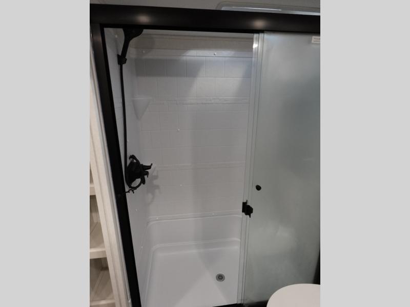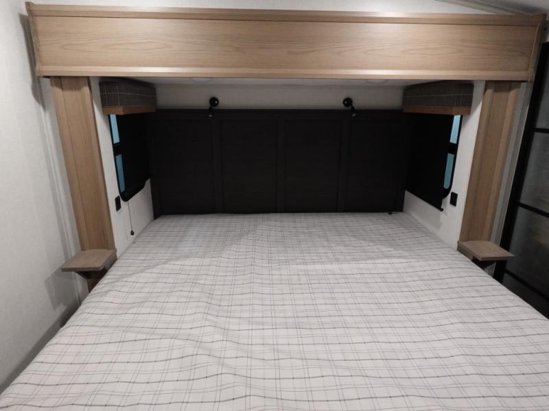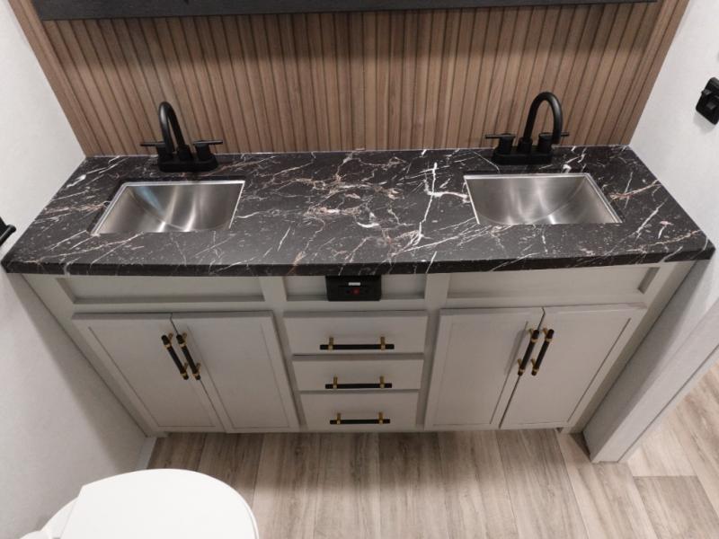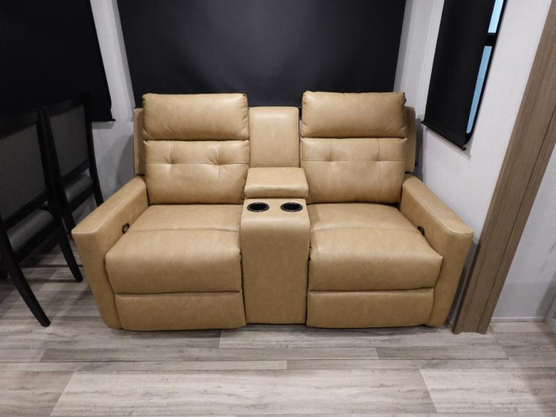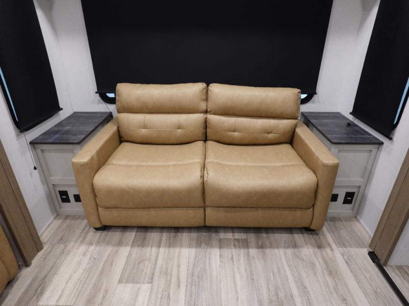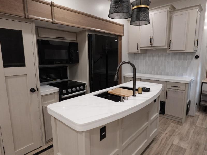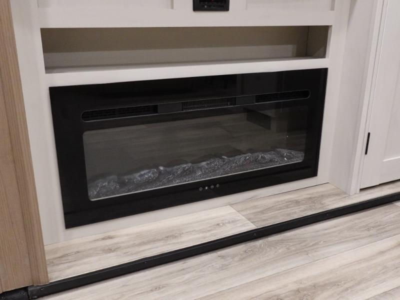 Two can get ready at once with a dual sink vanity in the full bathroom of this fifth wheel! Enjoy a good night's rest and interior space with the king bed slide in the front private bedroom which also has a front wardrobe to keep your clothes looking their best, and a closet with washer/dryer prep. The chef will have an easy time preparing meals in the kitchen with the island, the extra countertop space below the hutch, and the glass top three burner cooktop with the oven. The rear living area has a tri-fold sofa and theater seating across from an entertainment center with a fireplace and an HD LED TV!