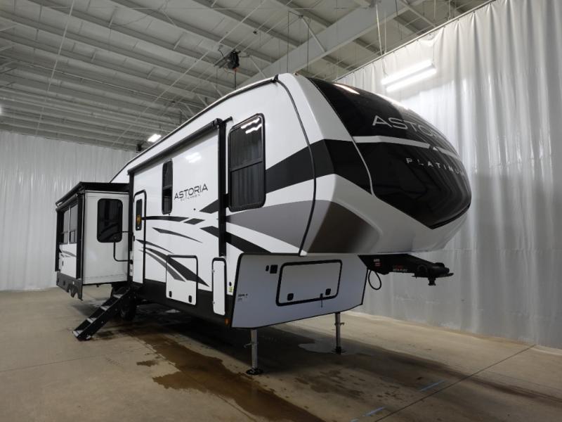 Each one of these Dutchmen RV Astoria Platinum fifth wheels feature a fiberglass exterior for added durability and an All Weather Thermal Package so you can camp all year long! There are also MorRyde Solid entry steps, slam latch baggage doors, and many more exterior conveniences. You'll enjoy a 200W solar panel for off-grid capabilities, an X1 back up camera for easy parking, and a power awning with LED lights for an inviting outdoor space. The interior is designed with bathroom backsplash, night shades throughout the living area, and Thomas Payne furniture collection. The on-demand tankless water heater will provide endless hot showers, and the dual ducted A/C will keep you cool all summer long.