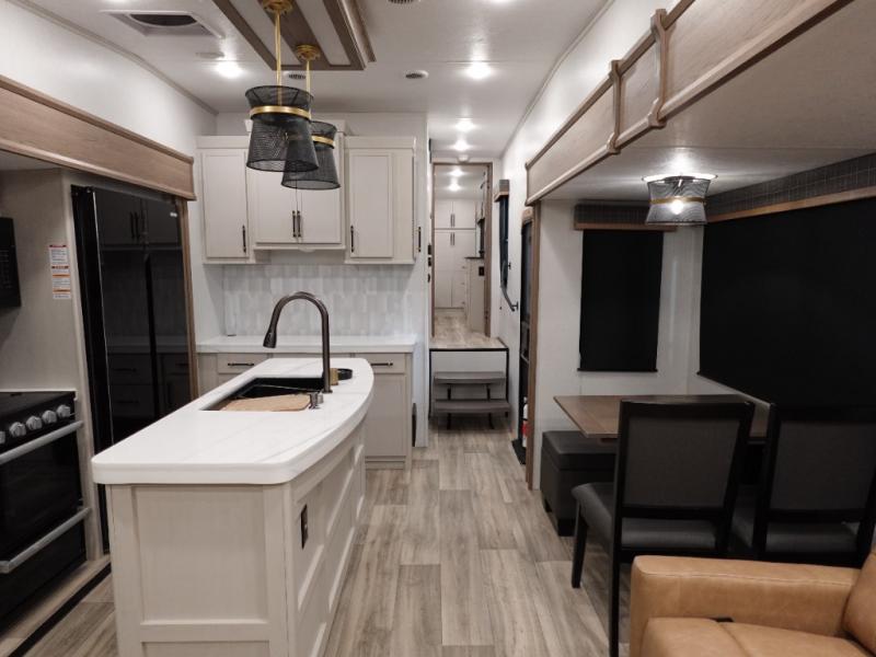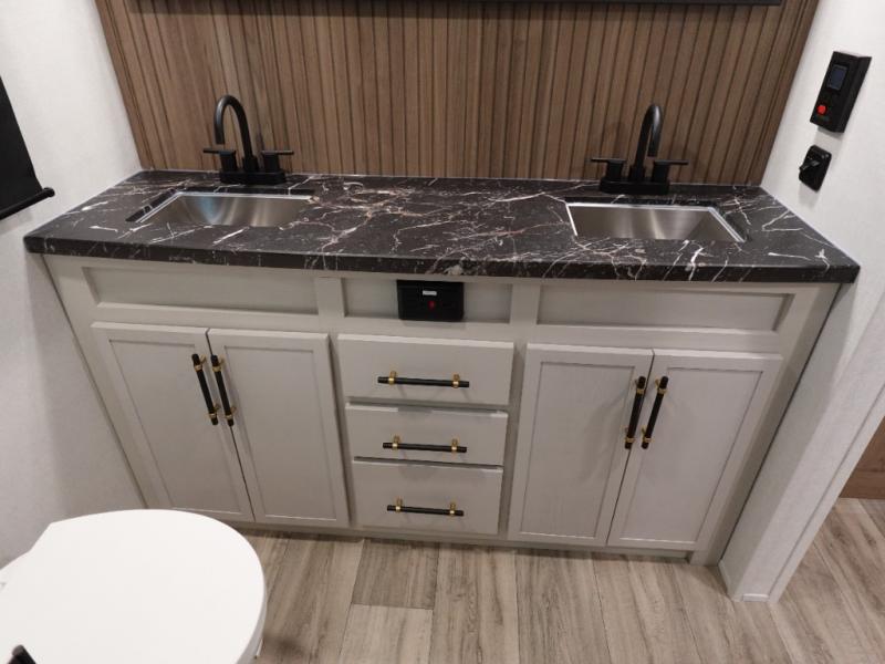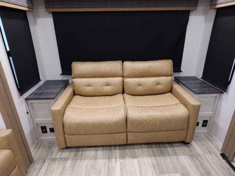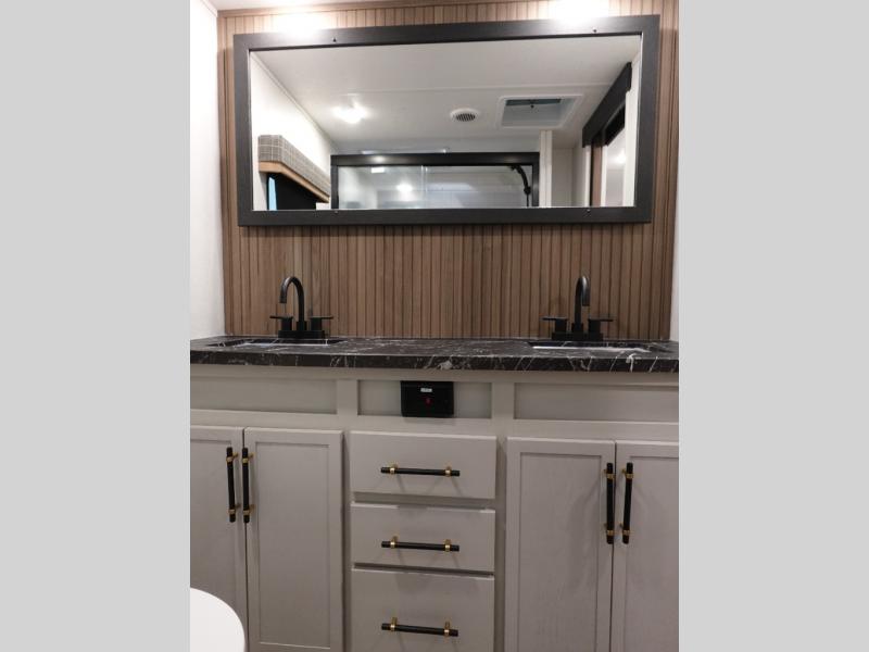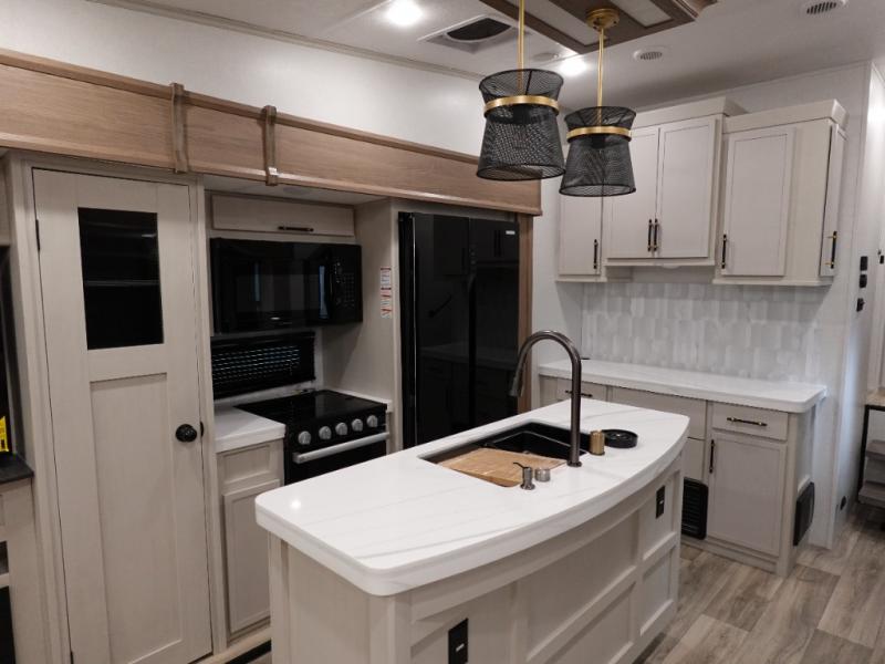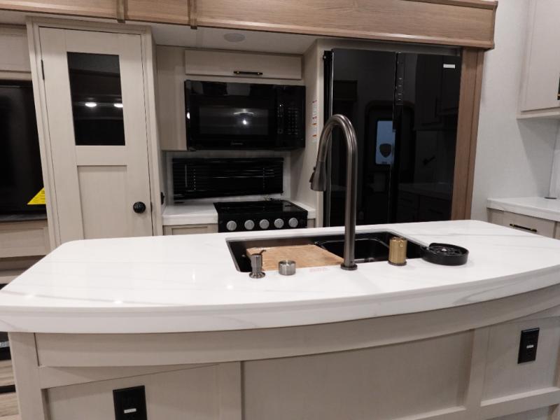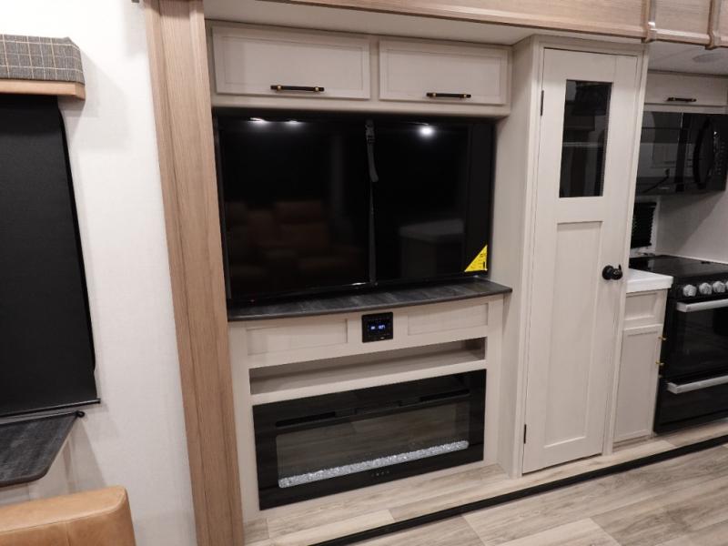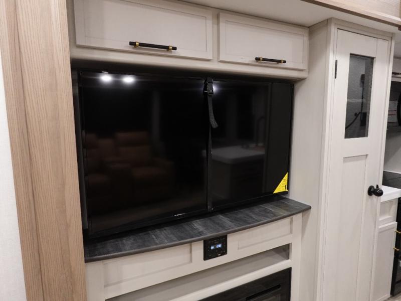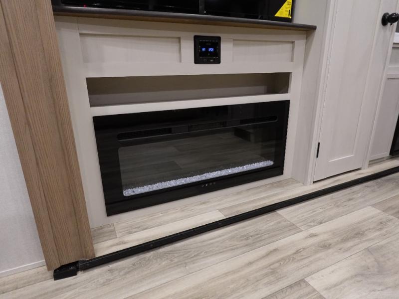 Two can get ready at once with a dual sink vanity in the full bathroom of this fifth wheel! Enjoy a good night's rest and interior space with the king bed slide in the front private bedroom which also has a front wardrobe to keep your clothes looking their best, and a closet with washer/dryer prep. The chef will have an easy time preparing meals in the kitchen with the island, the extra countertop space below the hutch, and the glass top three burner cooktop with the oven. The rear living area has a tri-fold sofa and theater seating across from an entertainment center with a fireplace and an HD LED TV!
