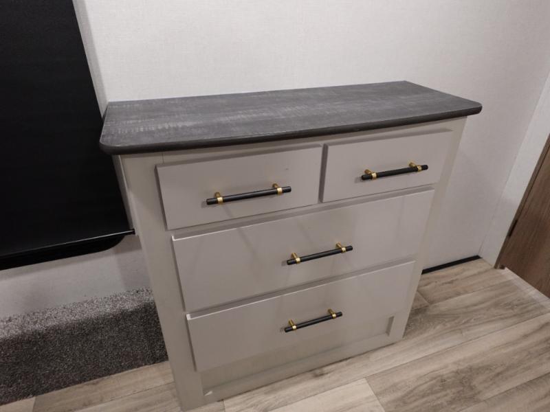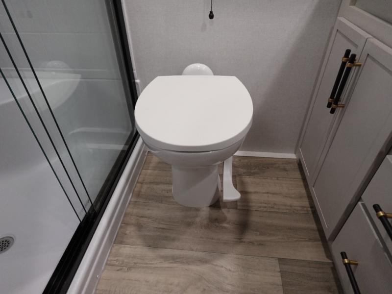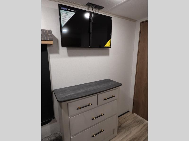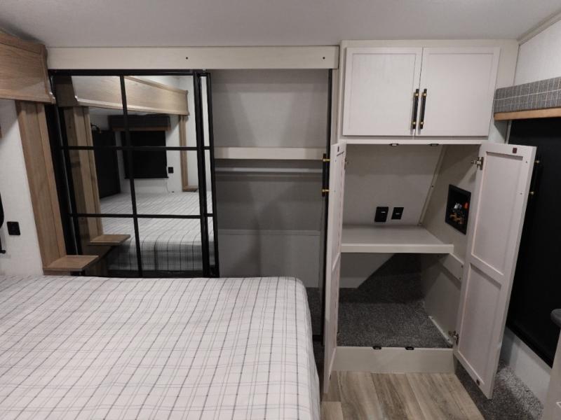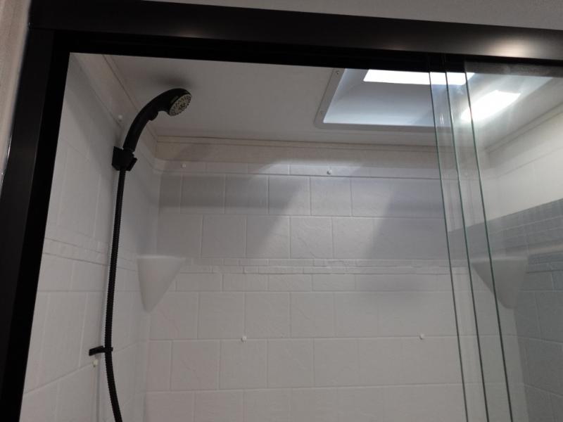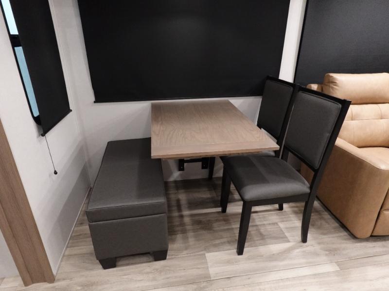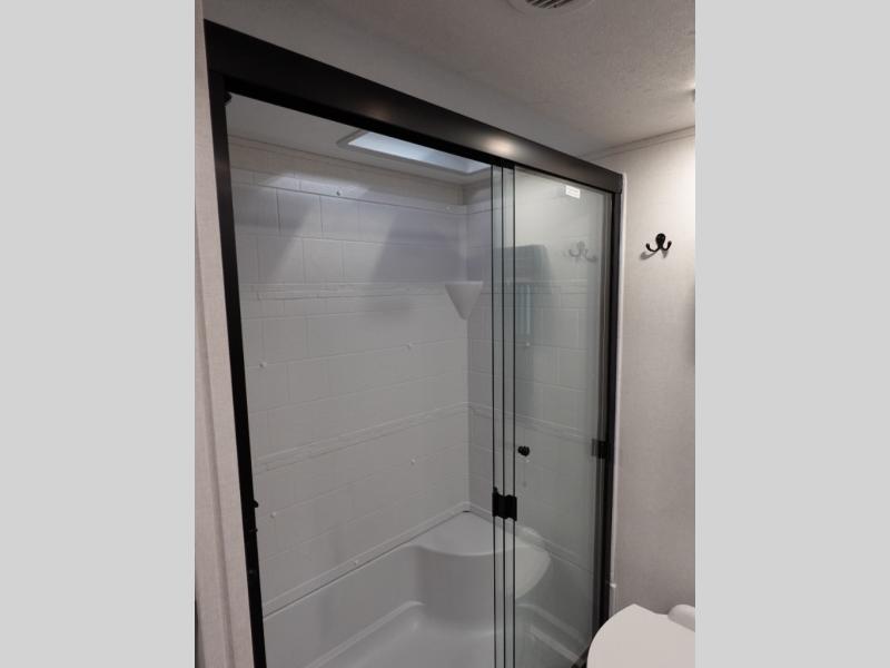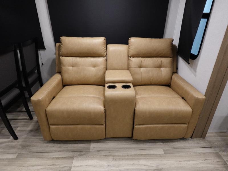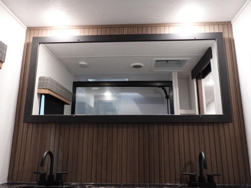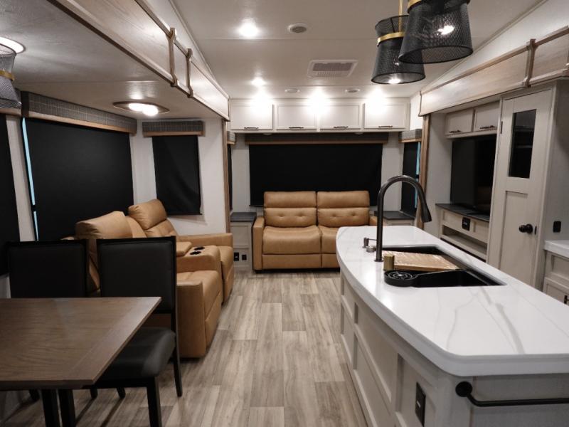 Two can get ready at once with a dual sink vanity in the full bathroom of this fifth wheel! Enjoy a good night's rest and interior space with the king bed slide in the front private bedroom which also has a front wardrobe to keep your clothes looking their best, and a closet with washer/dryer prep. The chef will have an easy time preparing meals in the kitchen with the island, the extra countertop space below the hutch, and the glass top three burner cooktop with the oven. The rear living area has a tri-fold sofa and theater seating across from an entertainment center with a fireplace and an HD LED TV!