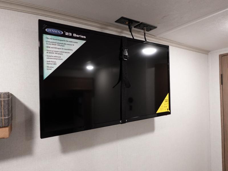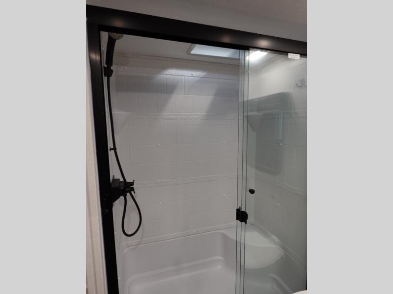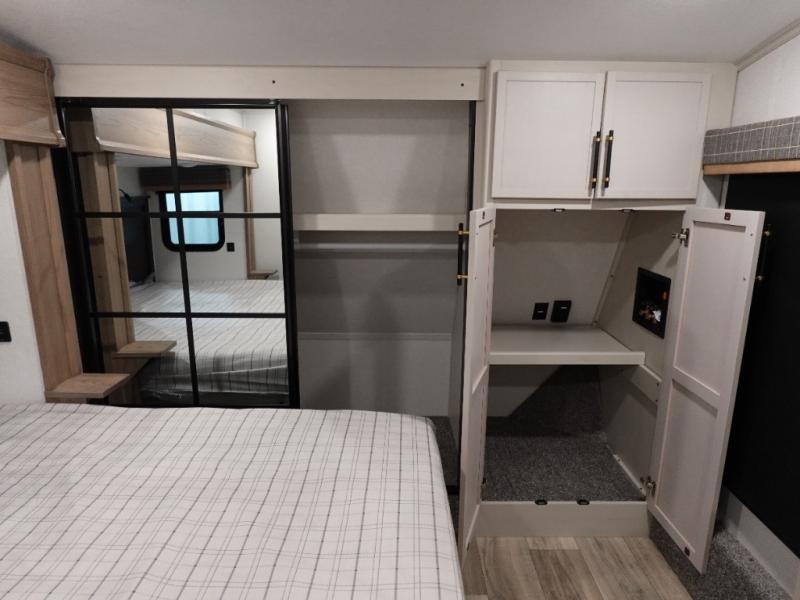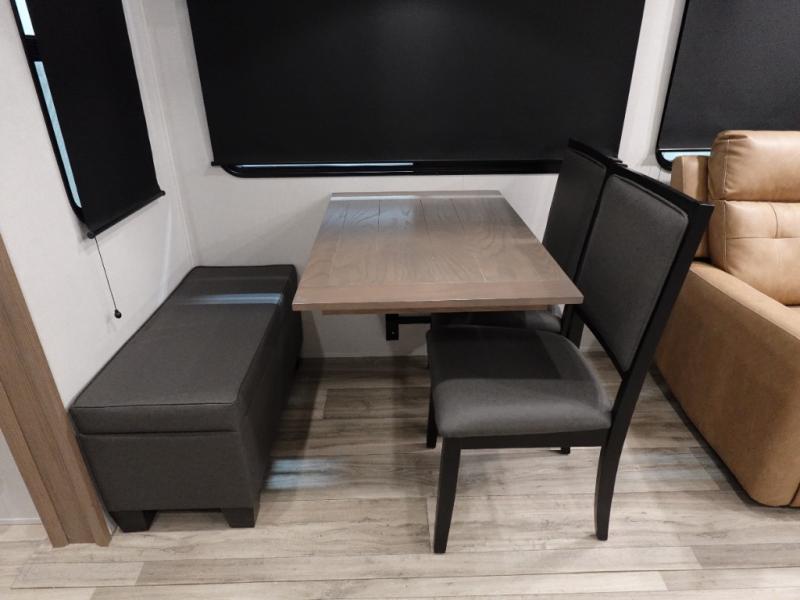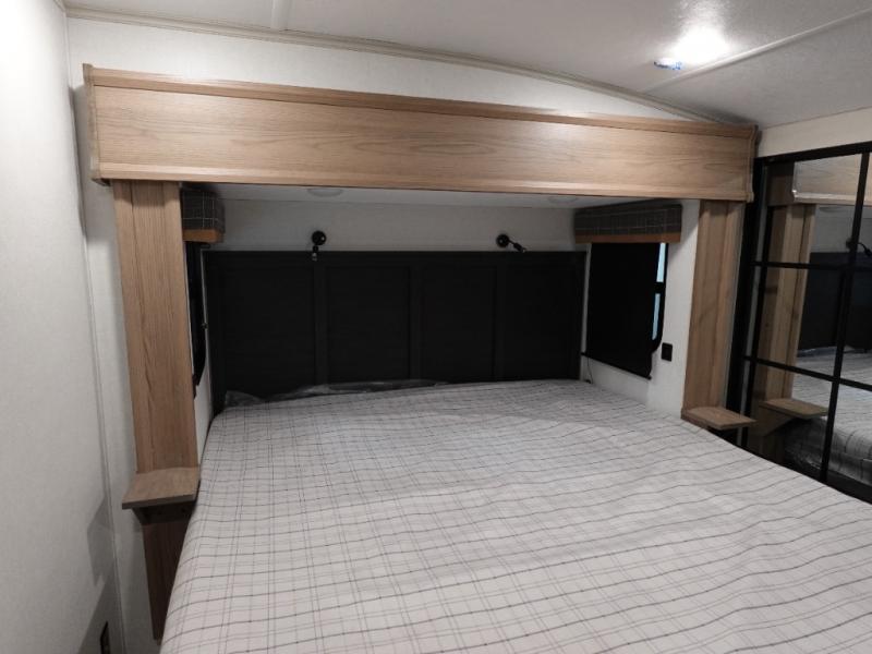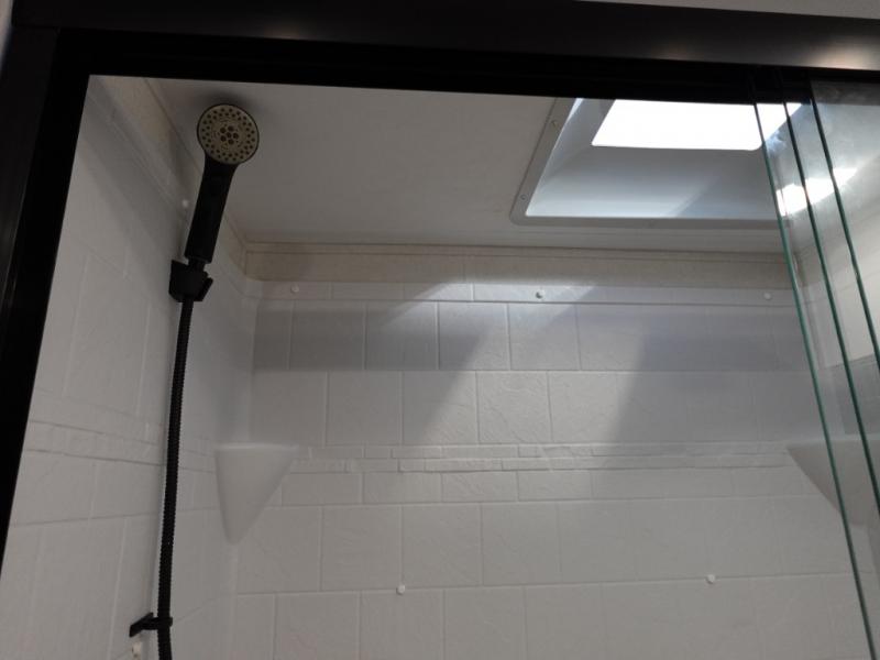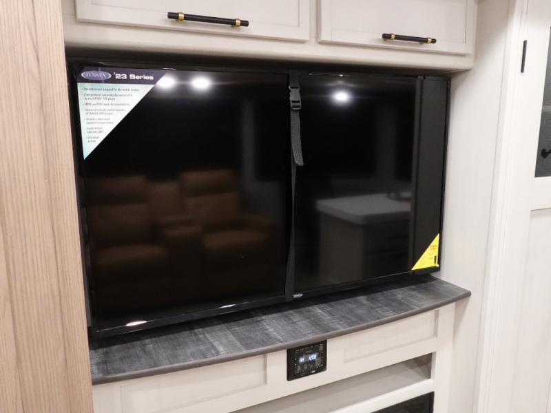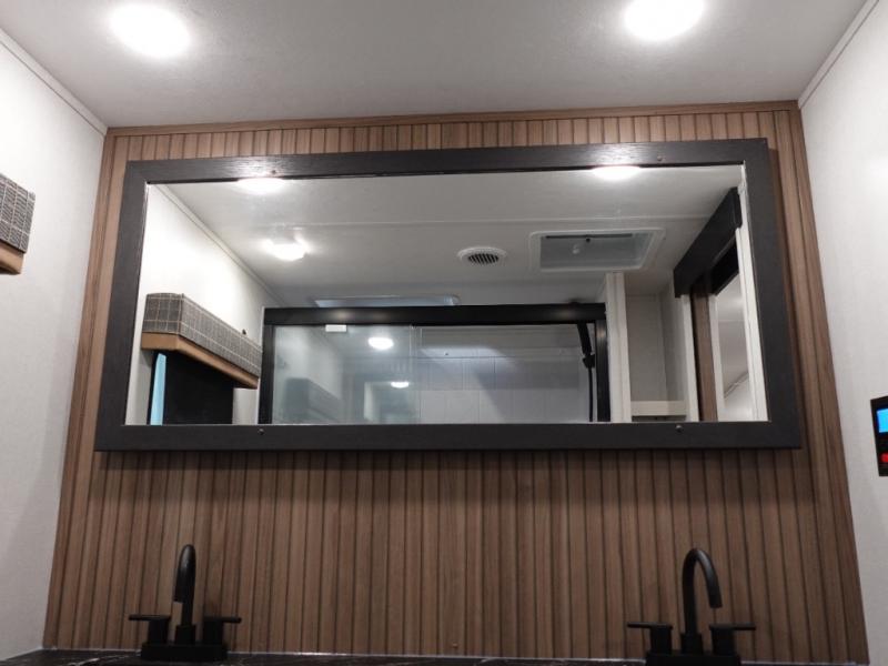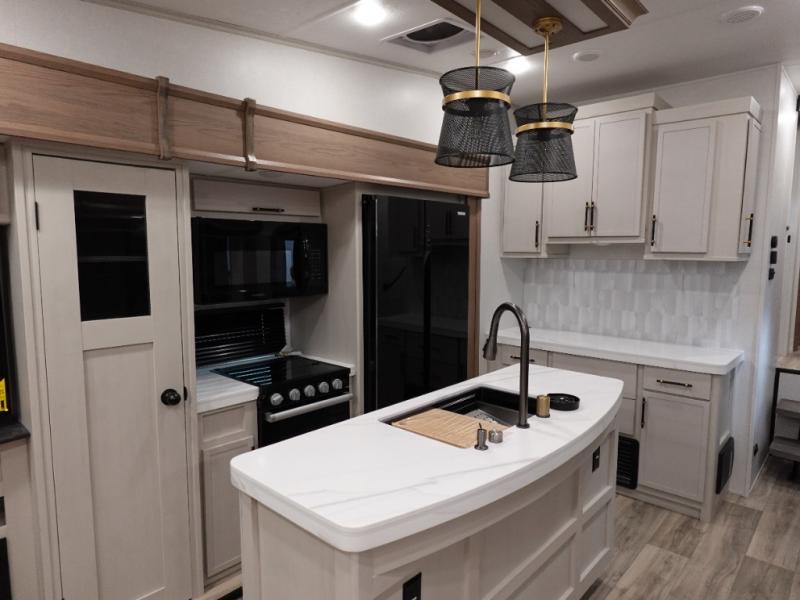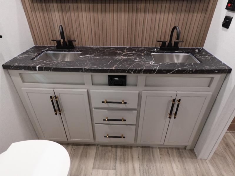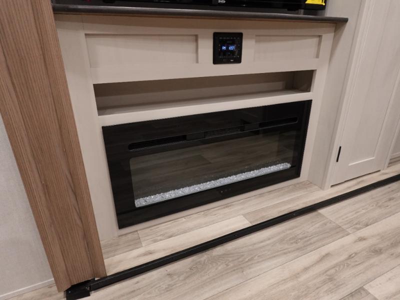 Two can get ready at once with a dual sink vanity in the full bathroom of this fifth wheel! Enjoy a good night's rest and interior space with the king bed slide in the front private bedroom which also has a front wardrobe to keep your clothes looking their best, and a closet with washer/dryer prep. The chef will have an easy time preparing meals in the kitchen with the island, the extra countertop space below the hutch, and the glass top three burner cooktop with the oven. The rear living area has a tri-fold sofa and theater seating across from an entertainment center with a fireplace and an HD LED TV!