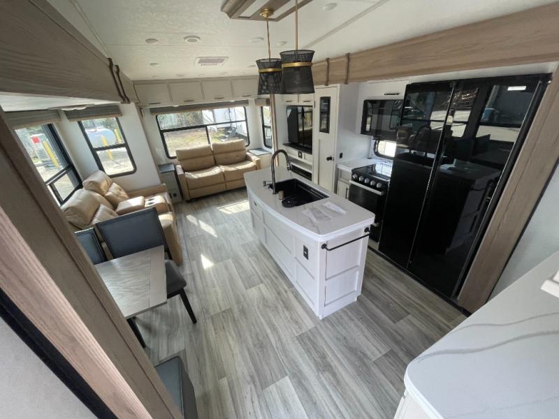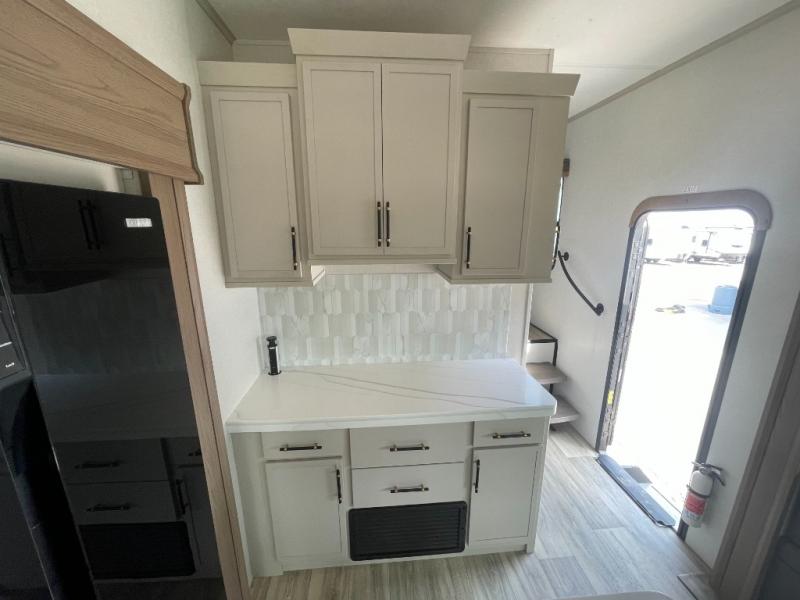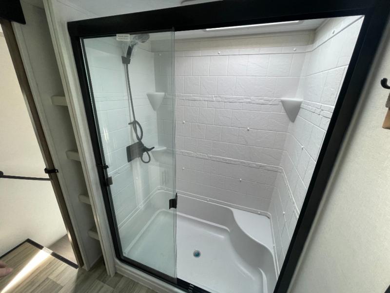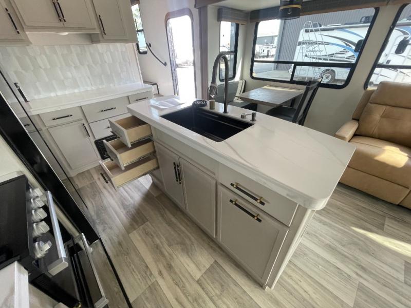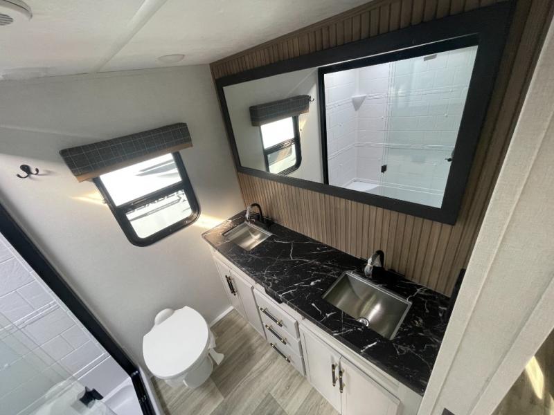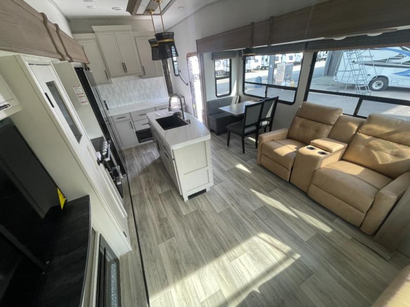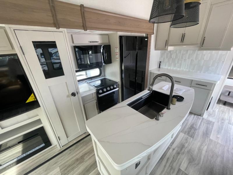 Two can get ready at once with a dual sink vanity in the full bathroom of this fifth wheel! Enjoy a good night's rest and interior space with the king bed slide in the front private bedroom which also has a front wardrobe to keep your clothes looking their best, and a closet with washer/dryer prep. The chef will have an easy time preparing meals in the kitchen with the island, the extra countertop space below the hutch, and the glass top three burner cooktop with the oven. The rear living area has a tri-fold sofa and theater seating across from an entertainment center with a fireplace and an HD LED TV!