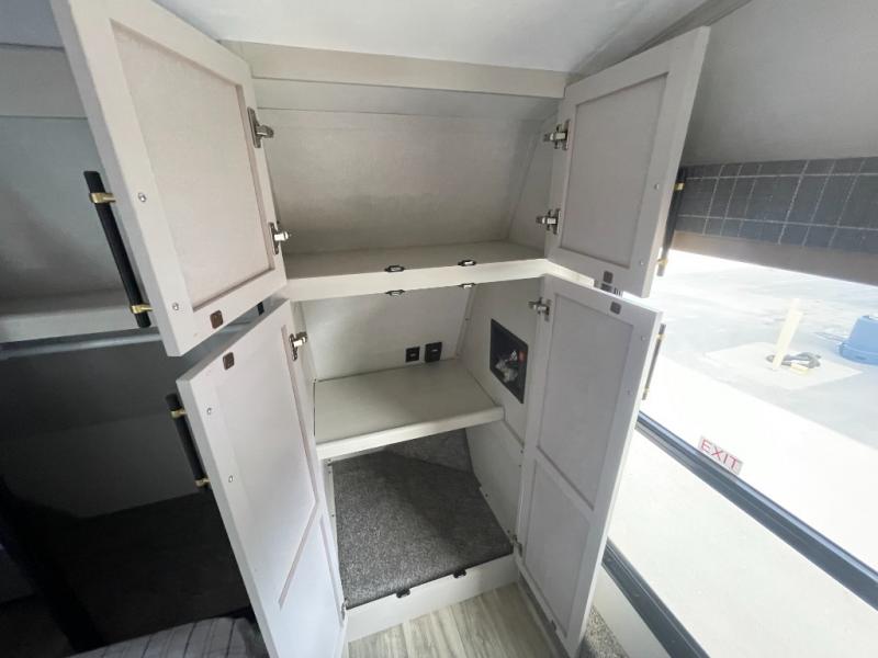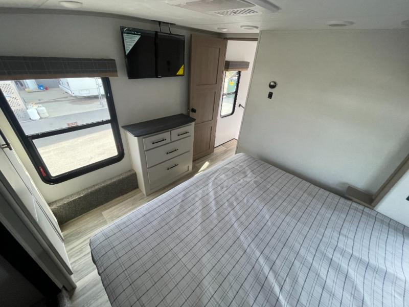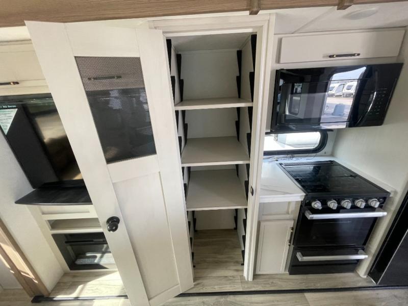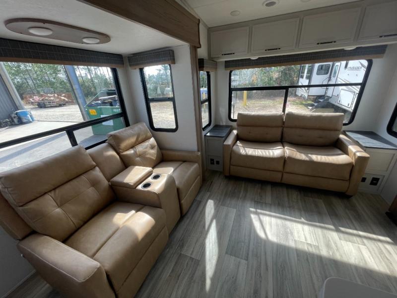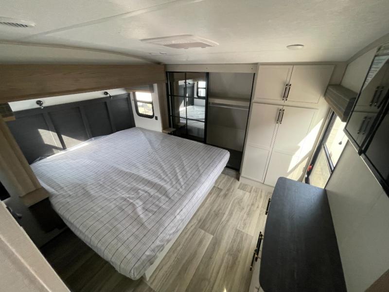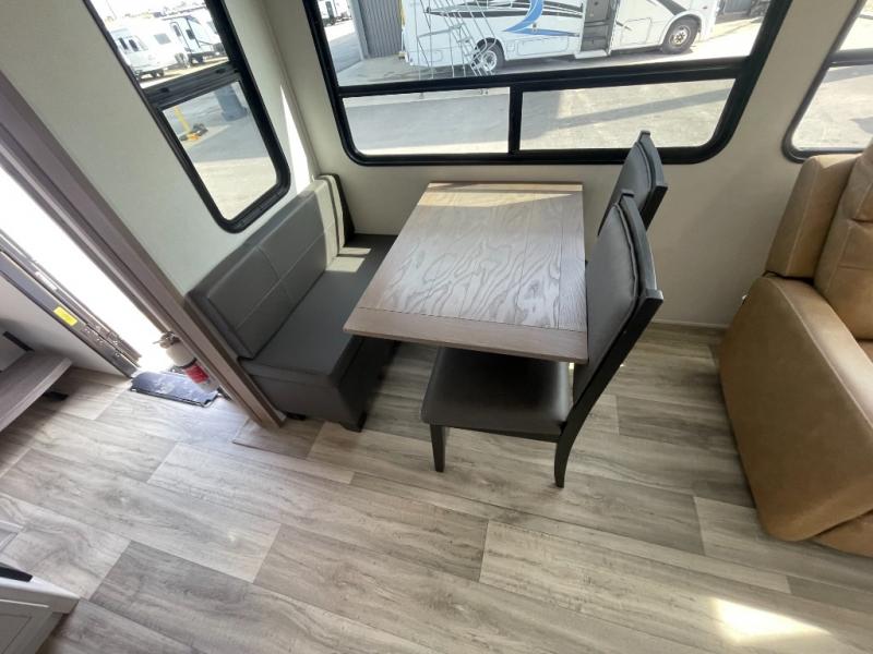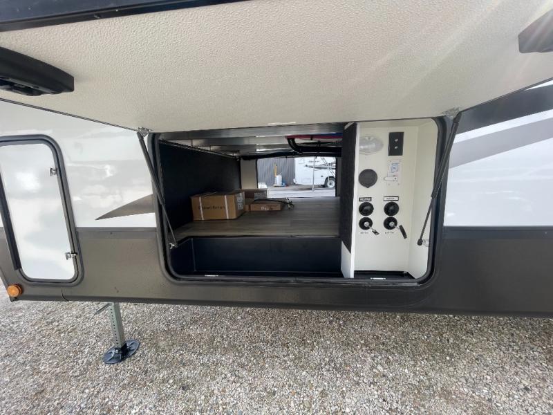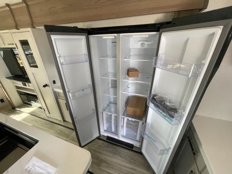 Two can get ready at once with a dual sink vanity in the full bathroom of this fifth wheel! Enjoy a good night's rest and interior space with the king bed slide in the front private bedroom which also has a front wardrobe to keep your clothes looking their best, and a closet with washer/dryer prep. The chef will have an easy time preparing meals in the kitchen with the island, the extra countertop space below the hutch, and the glass top three burner cooktop with the oven. The rear living area has a tri-fold sofa and theater seating across from an entertainment center with a fireplace and an HD LED TV!