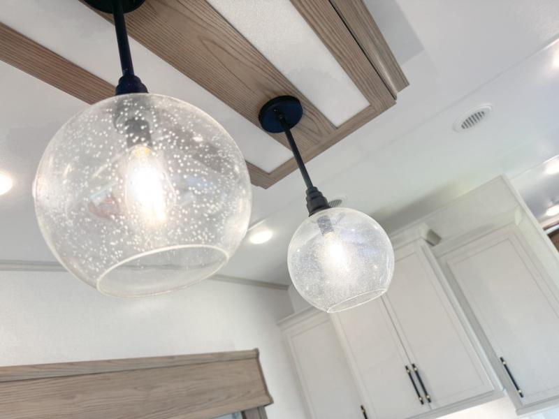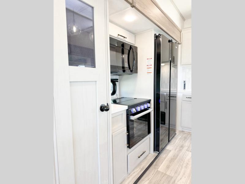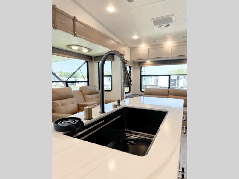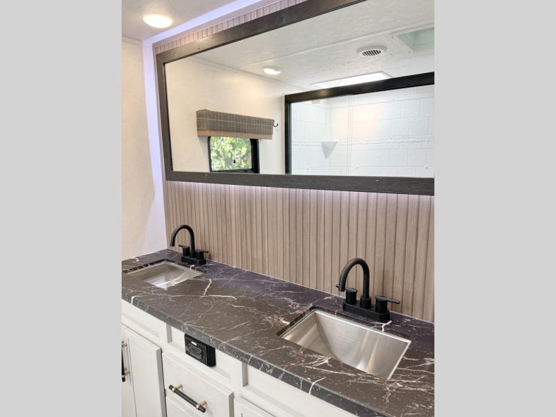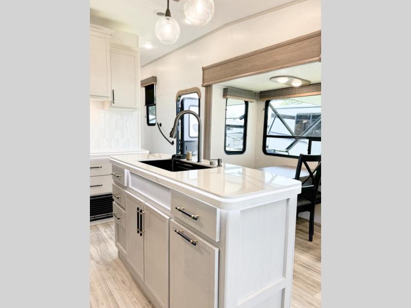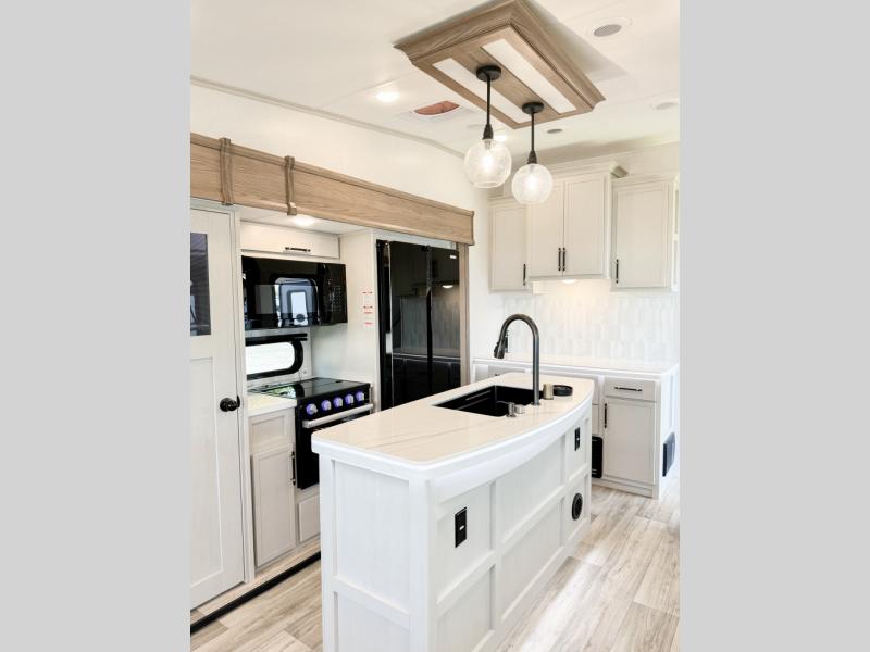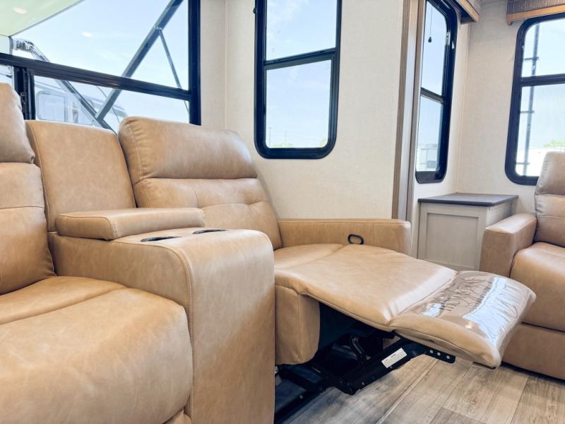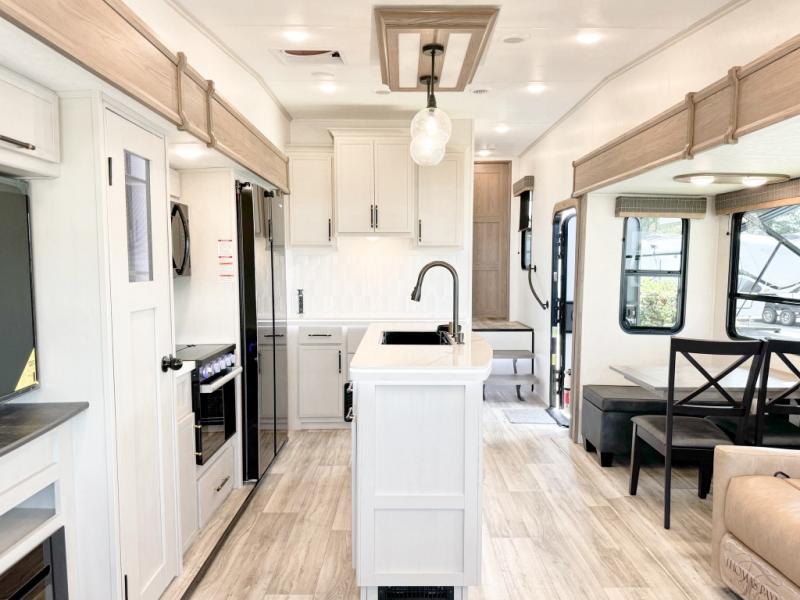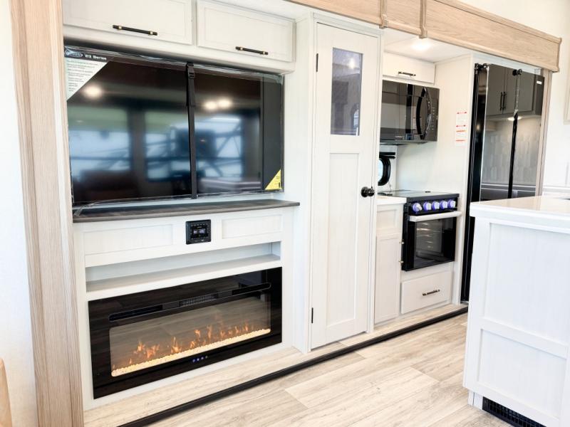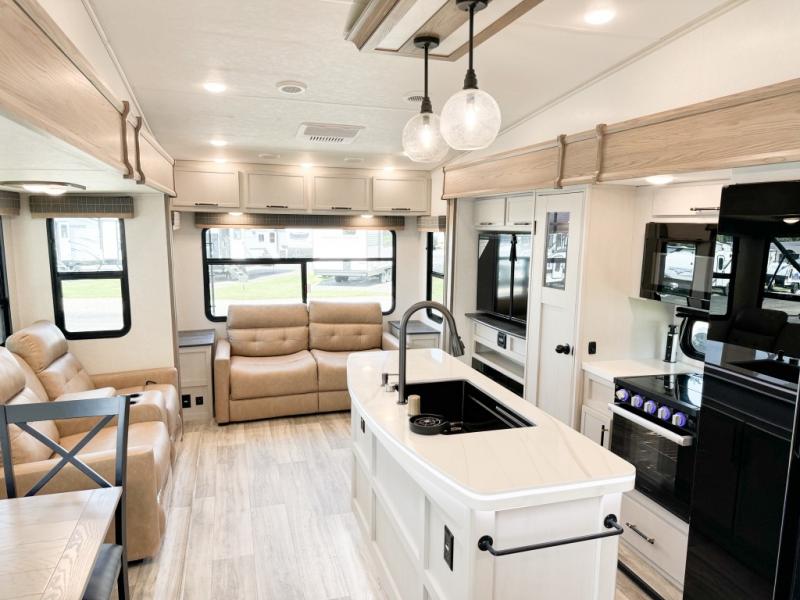 Two can get ready at once with a dual sink vanity in the full bathroom of this fifth wheel! Enjoy a good night's rest and interior space with the king bed slide in the front private bedroom which also has a front wardrobe to keep your clothes looking their best, and a closet with washer/dryer prep. The chef will have an easy time preparing meals in the kitchen with the island, the extra countertop space below the hutch, and the glass top three burner cooktop with the oven. The rear living area has a tri-fold sofa and theater seating across from an entertainment center with a fireplace and an HD LED TV!