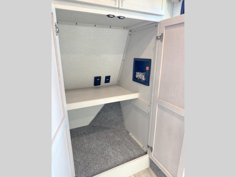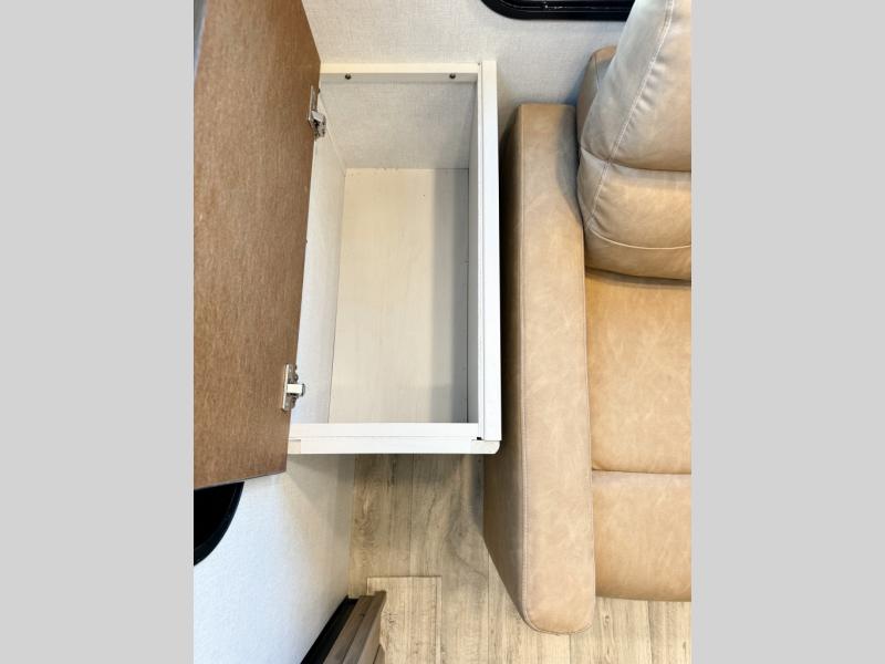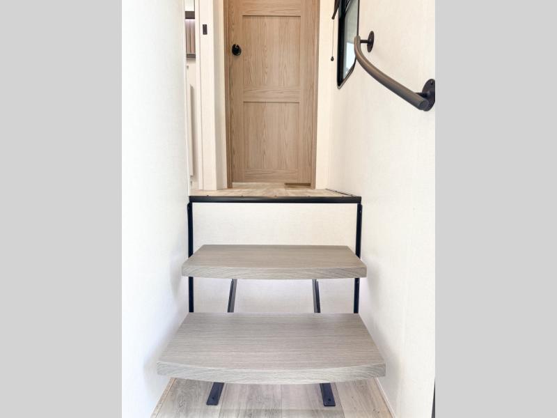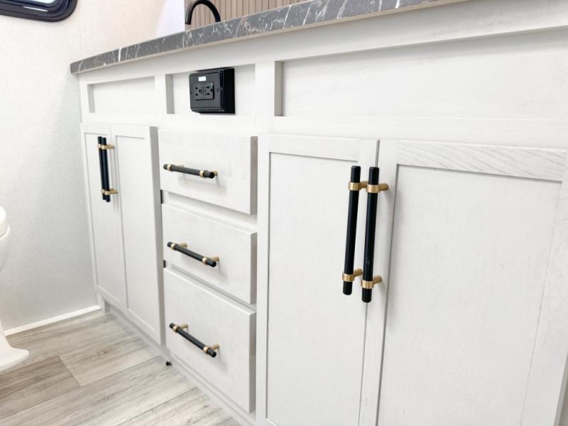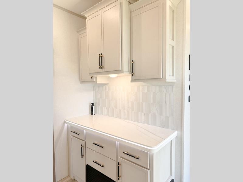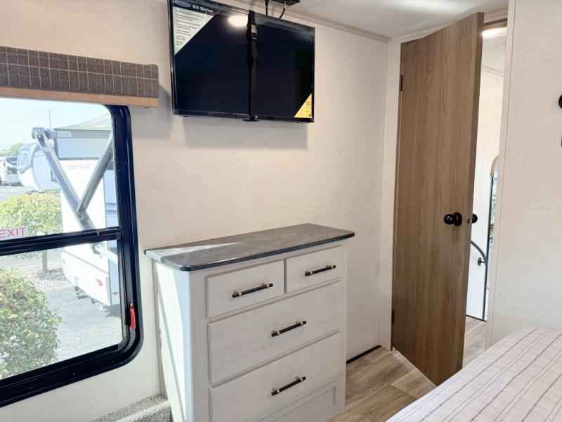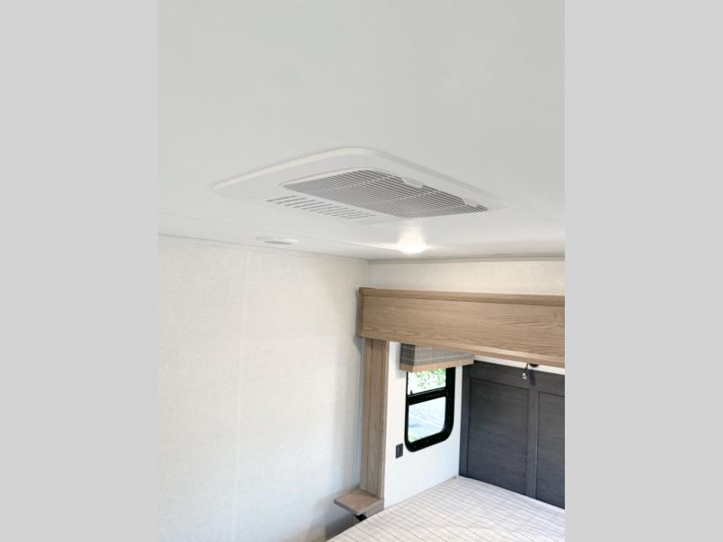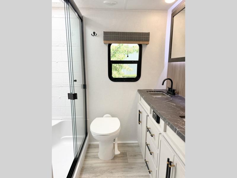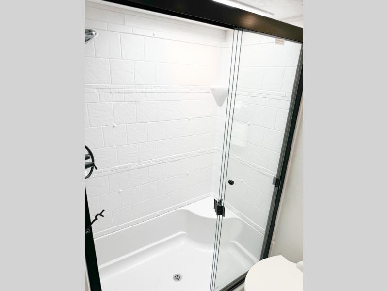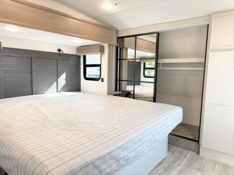 Two can get ready at once with a dual sink vanity in the full bathroom of this fifth wheel! Enjoy a good night's rest and interior space with the king bed slide in the front private bedroom which also has a front wardrobe to keep your clothes looking their best, and a closet with washer/dryer prep. The chef will have an easy time preparing meals in the kitchen with the island, the extra countertop space below the hutch, and the glass top three burner cooktop with the oven. The rear living area has a tri-fold sofa and theater seating across from an entertainment center with a fireplace and an HD LED TV!
