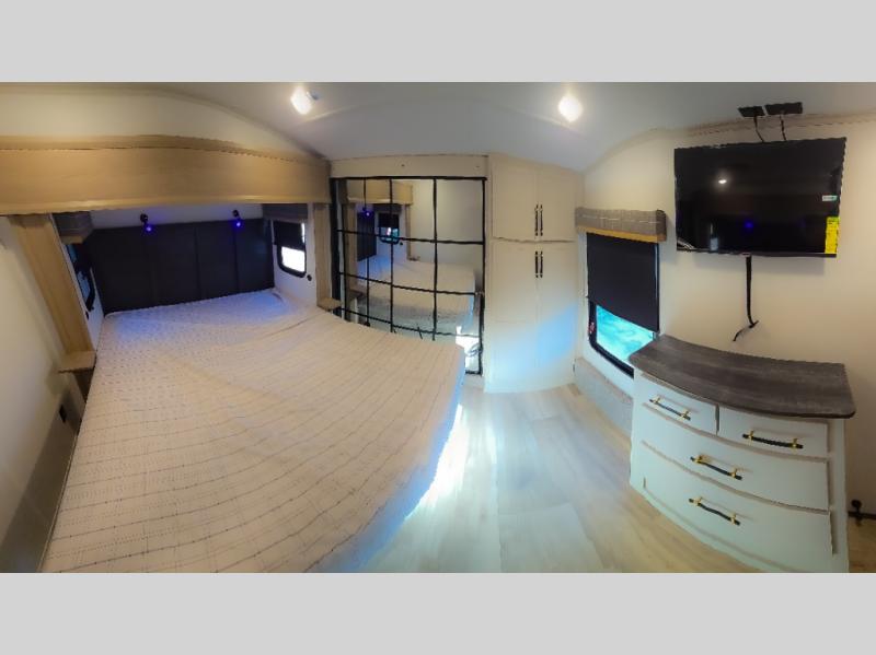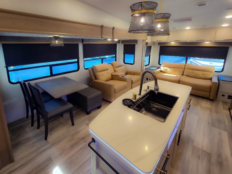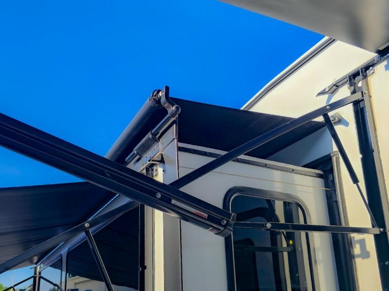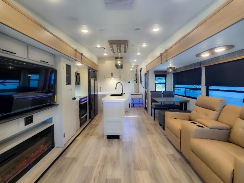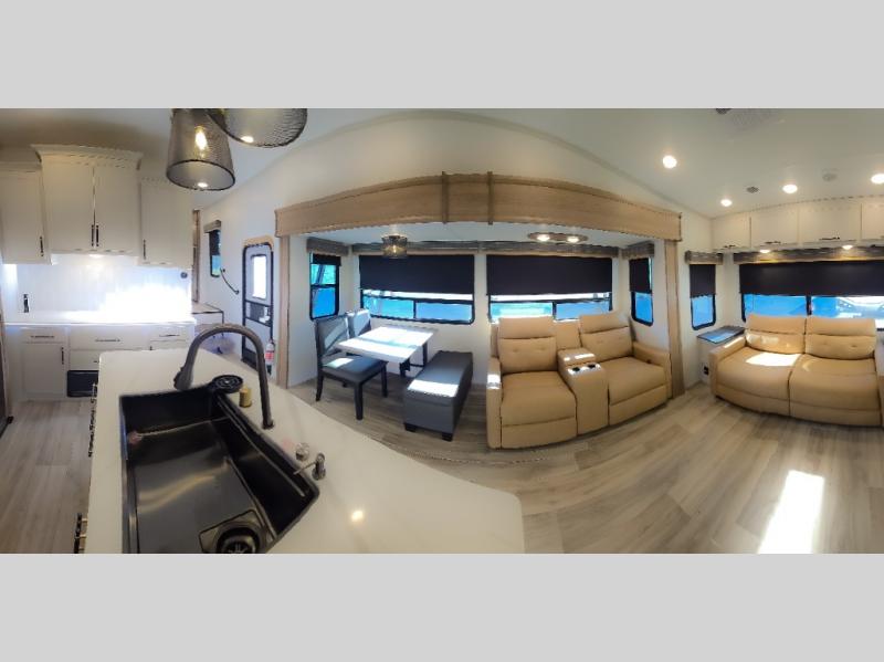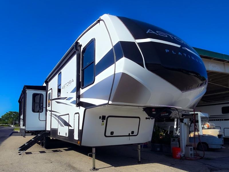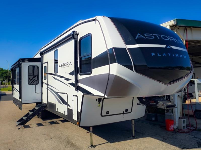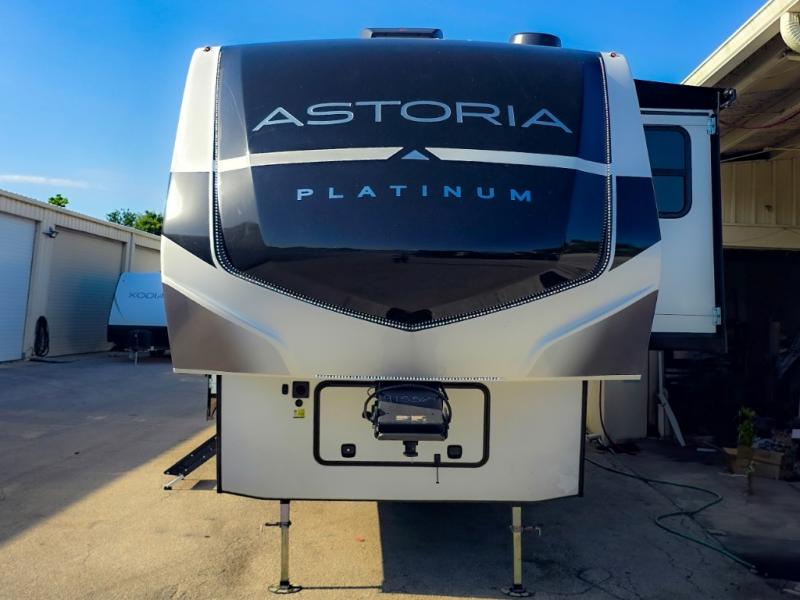 Each one of these Dutchmen RV Astoria Platinum fifth wheels feature a fiberglass exterior for added durability and an All Weather Thermal Package so you can camp all year long! There are also MorRyde Solid entry steps, slam latch baggage doors, and many more exterior conveniences. You'll enjoy a 200W solar panel for off-grid capabilities, an X1 back up camera for easy parking, and a power awning with LED lights for an inviting outdoor space. The interior is designed with bathroom backsplash, night shades throughout the living area, and Thomas Payne furniture collection. The on-demand tankless water heater will provide endless hot showers, and the dual ducted A/C will keep you cool all summer long.