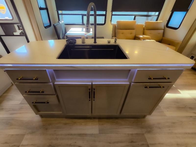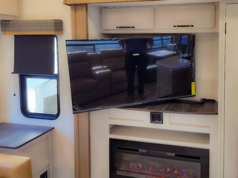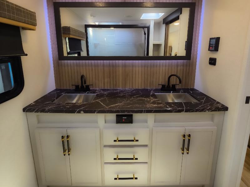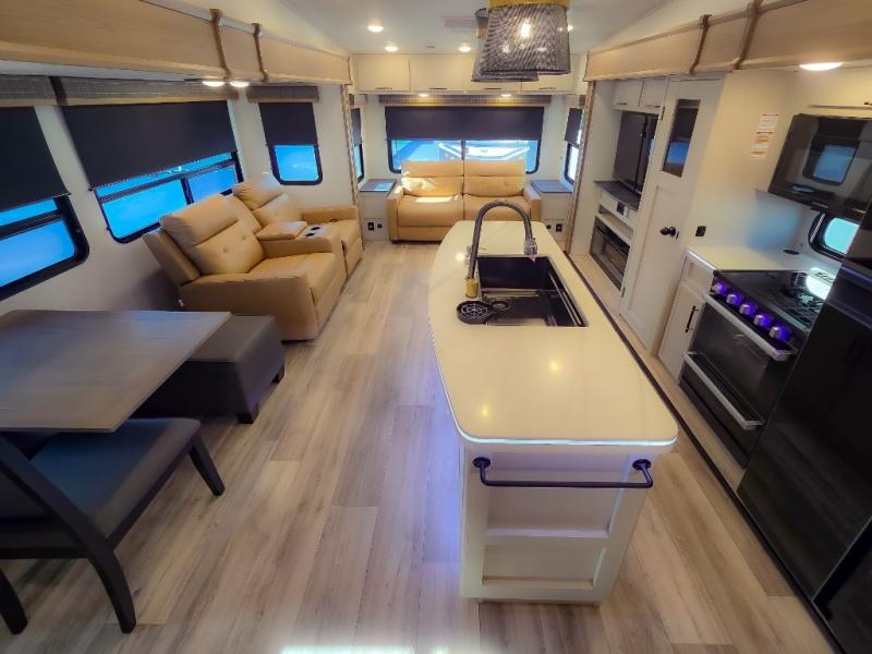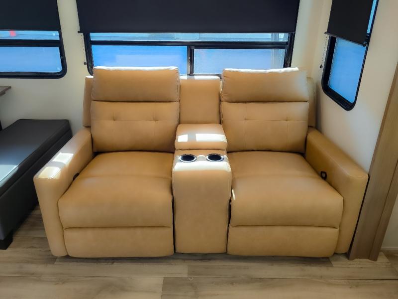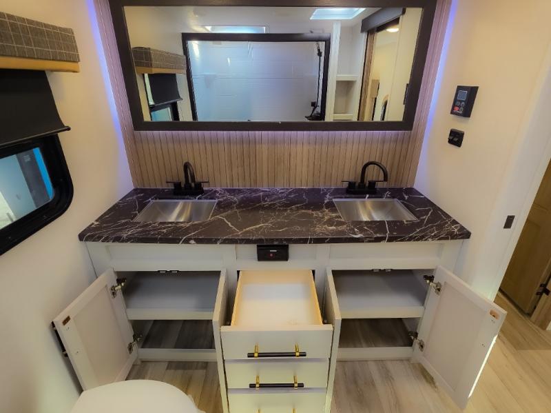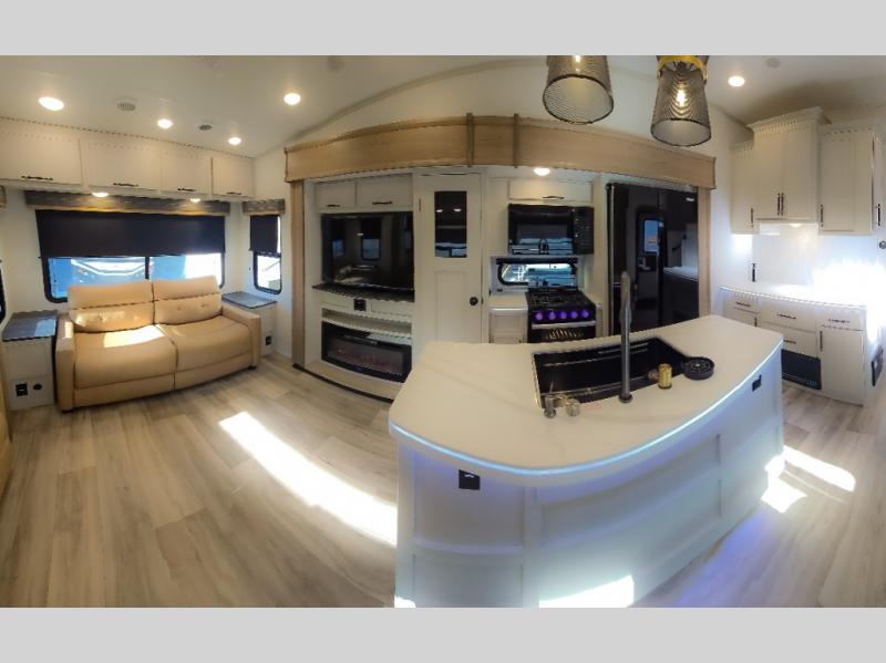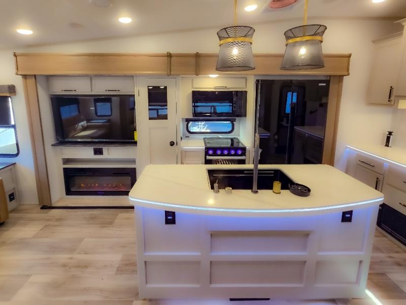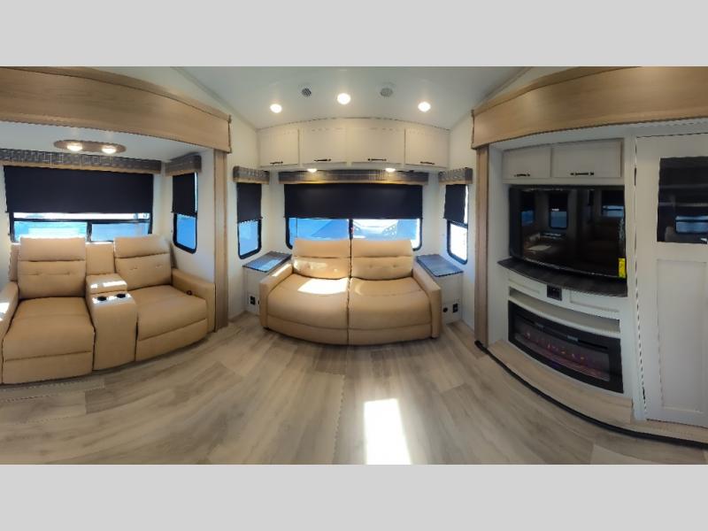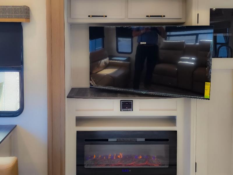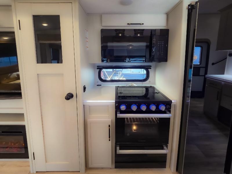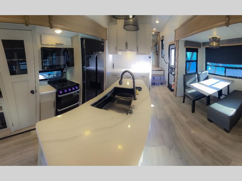 Two can get ready at once with a dual sink vanity in the full bathroom of this fifth wheel! Enjoy a good night's rest and interior space with the king bed slide in the front private bedroom which also has a front wardrobe to keep your clothes looking their best, and a closet with washer/dryer prep. The chef will have an easy time preparing meals in the kitchen with the island, the extra countertop space below the hutch, and the glass top three burner cooktop with the oven. The rear living area has a tri-fold sofa and theater seating across from an entertainment center with a fireplace and an HD LED TV!