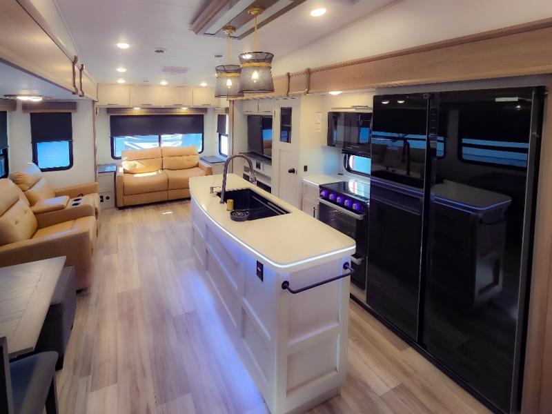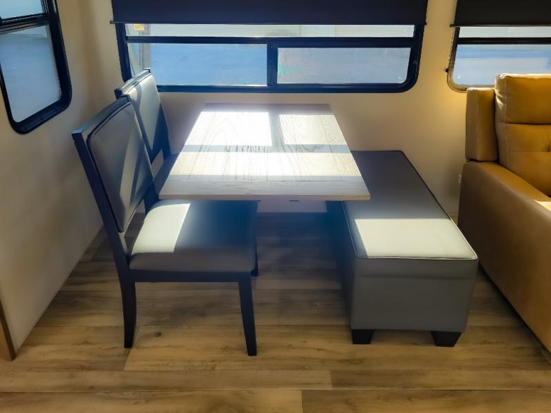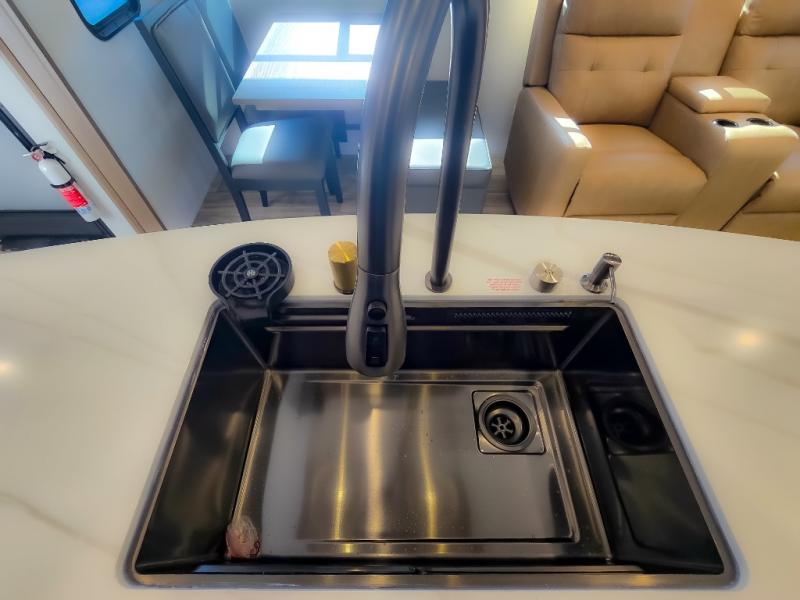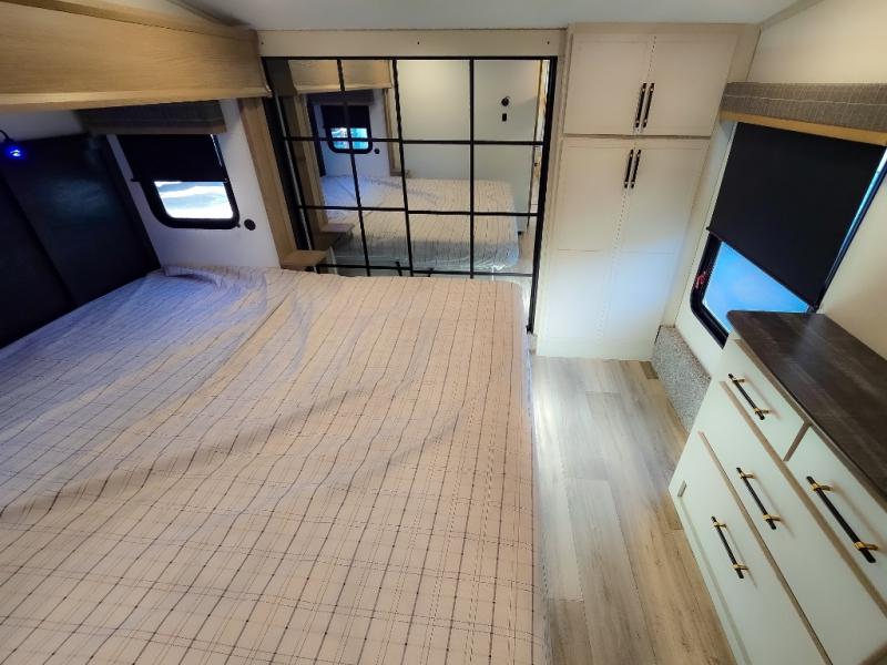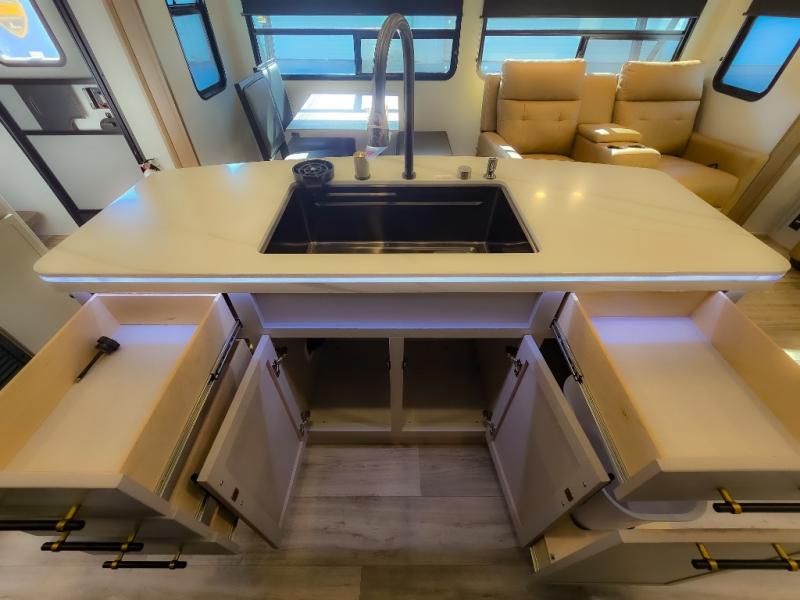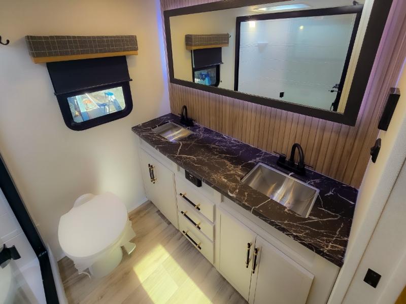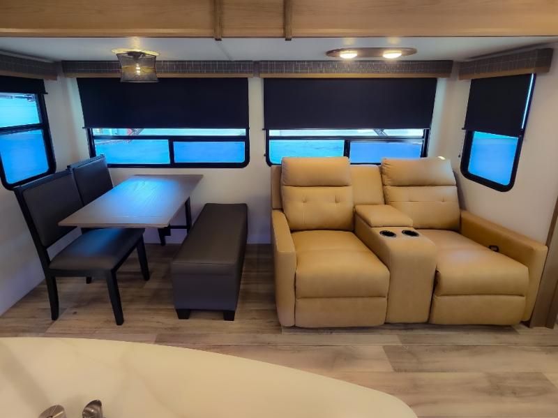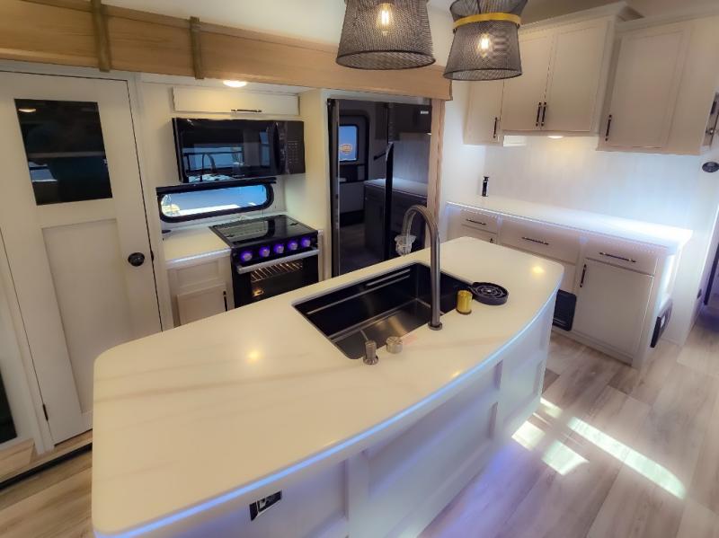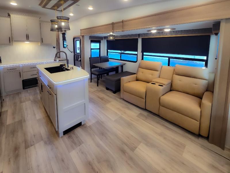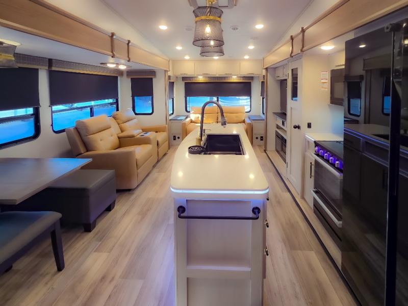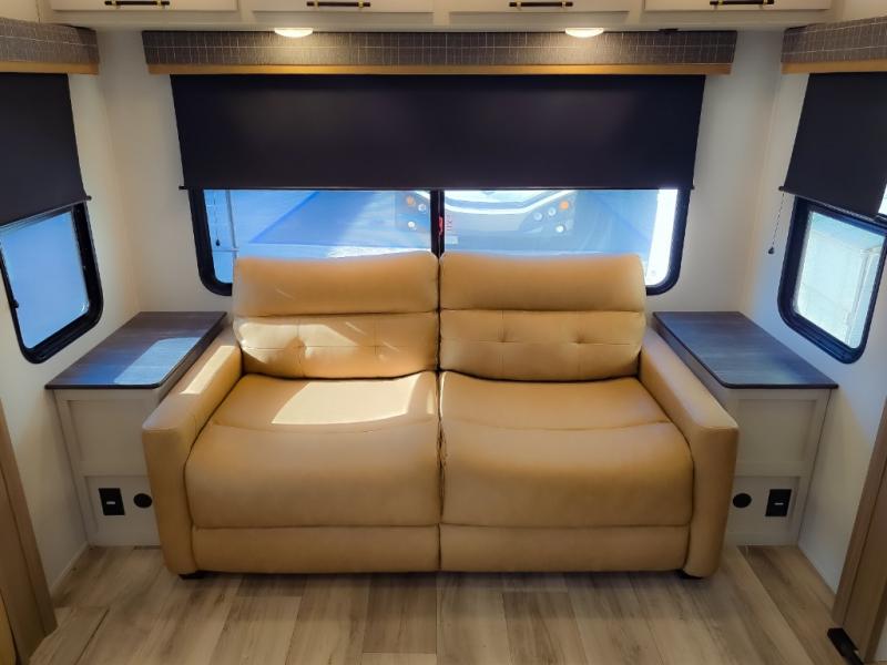 Two can get ready at once with a dual sink vanity in the full bathroom of this fifth wheel! Enjoy a good night's rest and interior space with the king bed slide in the front private bedroom which also has a front wardrobe to keep your clothes looking their best, and a closet with washer/dryer prep. The chef will have an easy time preparing meals in the kitchen with the island, the extra countertop space below the hutch, and the glass top three burner cooktop with the oven. The rear living area has a tri-fold sofa and theater seating across from an entertainment center with a fireplace and an HD LED TV!