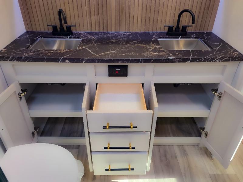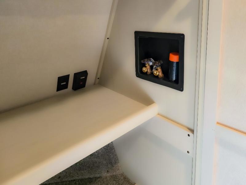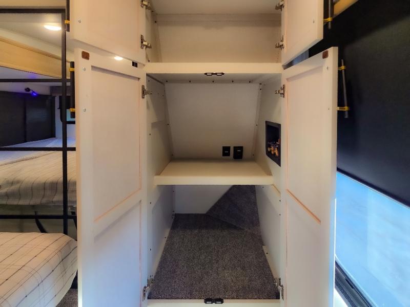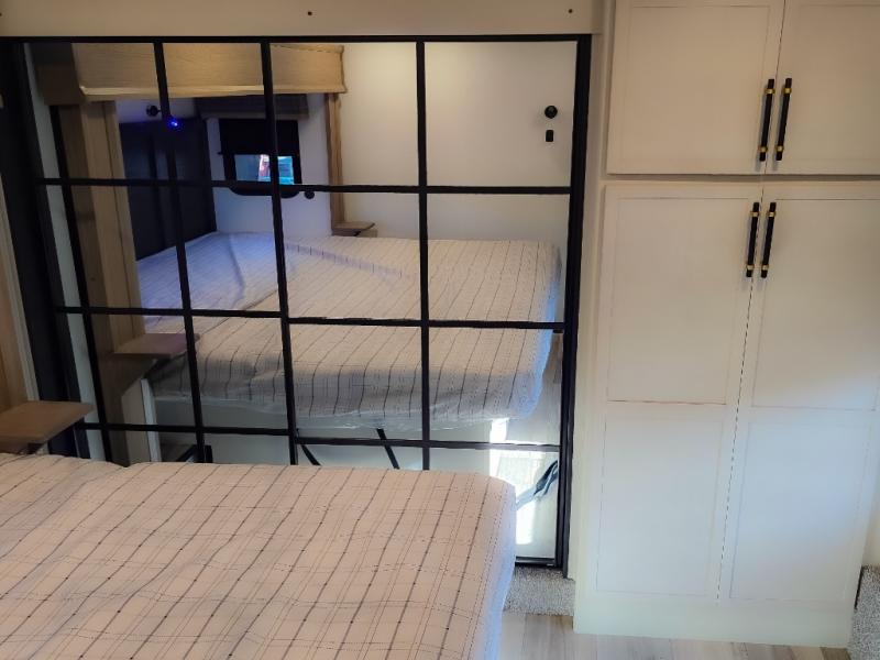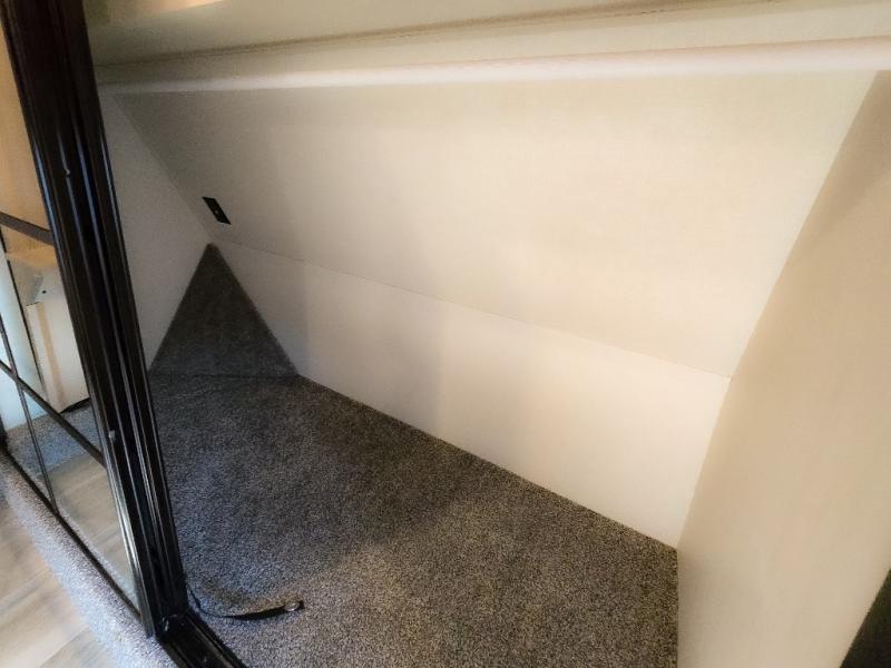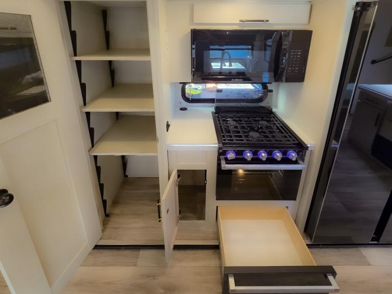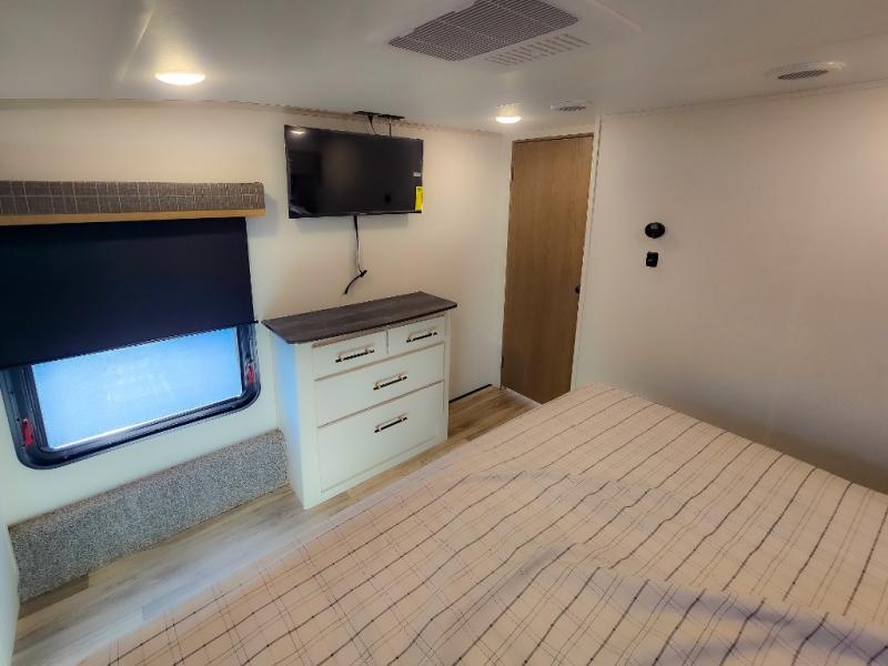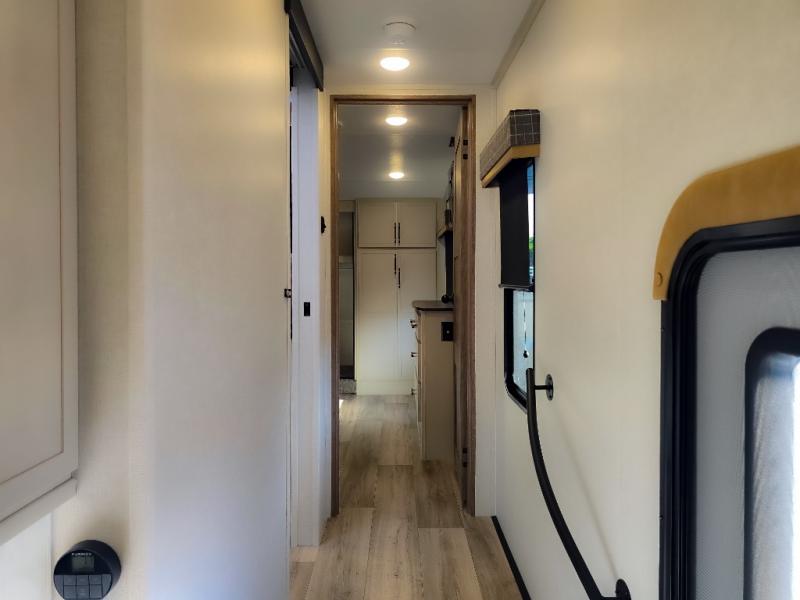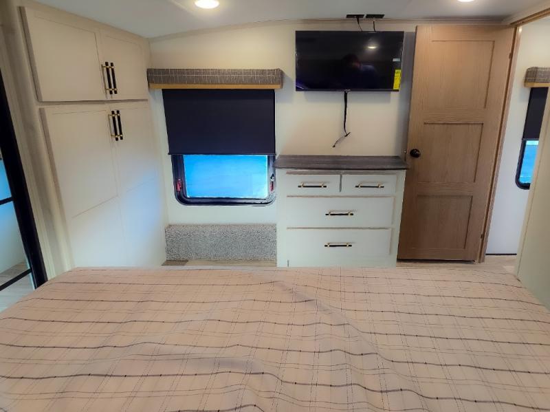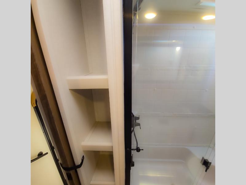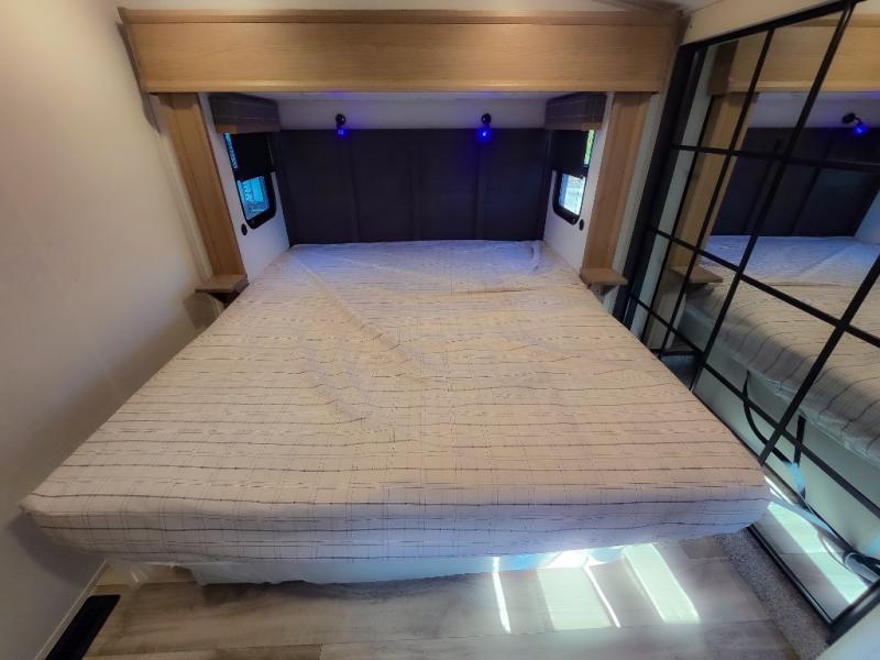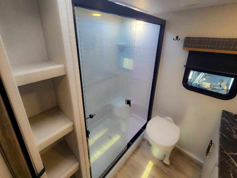 Two can get ready at once with a dual sink vanity in the full bathroom of this fifth wheel! Enjoy a good night's rest and interior space with the king bed slide in the front private bedroom which also has a front wardrobe to keep your clothes looking their best, and a closet with washer/dryer prep. The chef will have an easy time preparing meals in the kitchen with the island, the extra countertop space below the hutch, and the glass top three burner cooktop with the oven. The rear living area has a tri-fold sofa and theater seating across from an entertainment center with a fireplace and an HD LED TV!