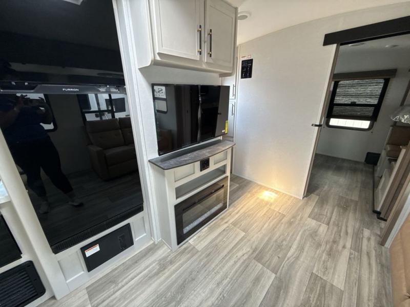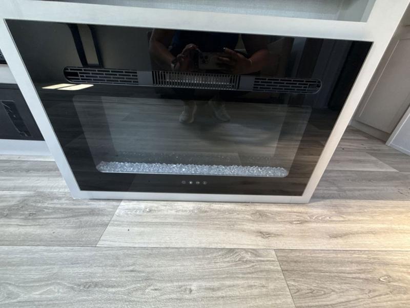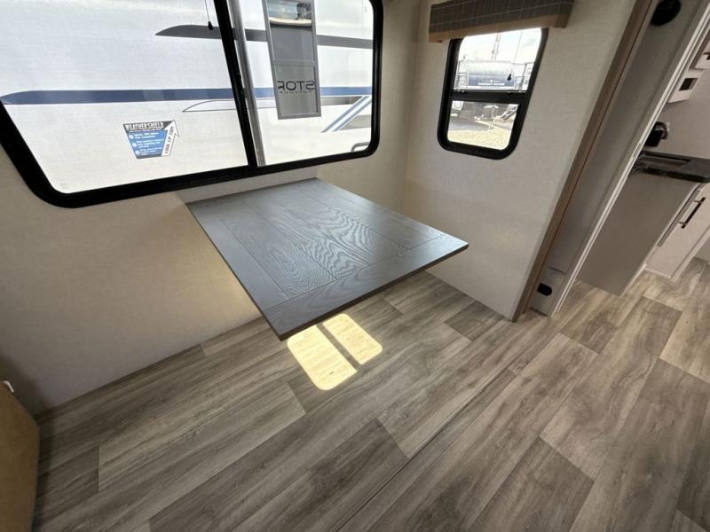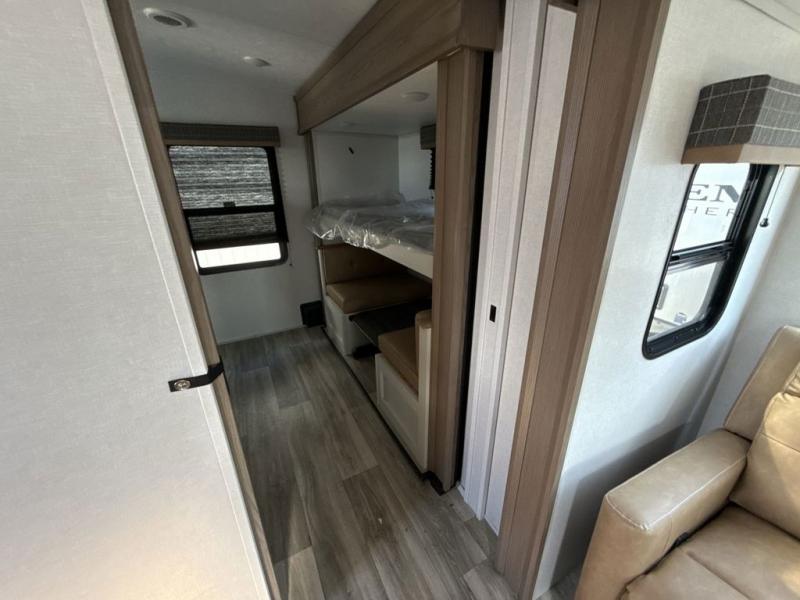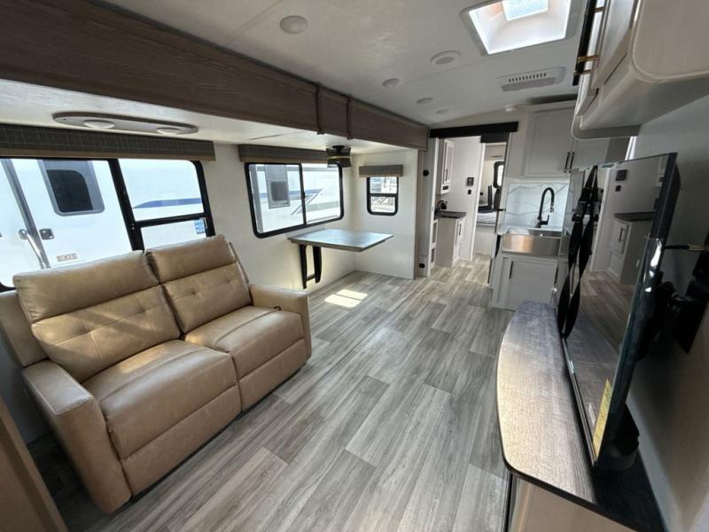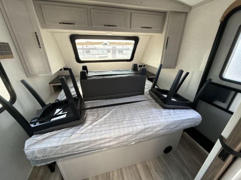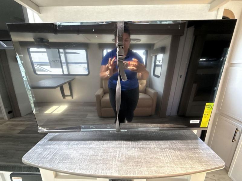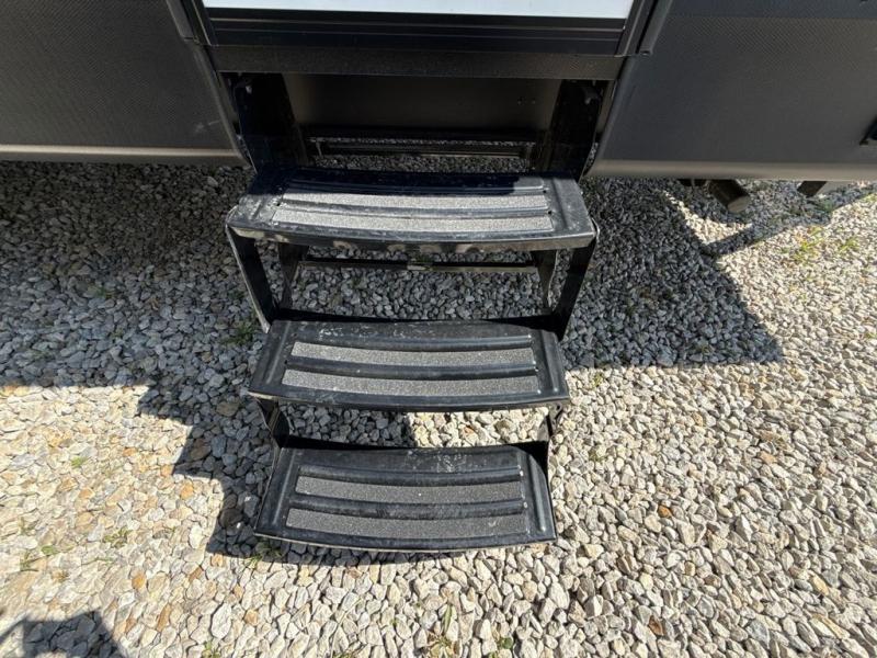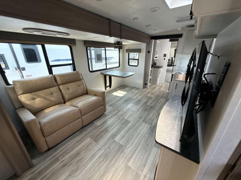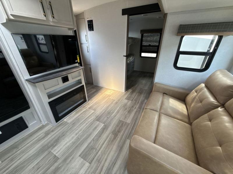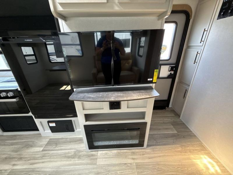 There are plenty of sleeping spaces for everyone in this travel trailer! From the rear private bunkhouse with a set of bunk beds along one side and a bunk bed above a sofa on the other to the front private bedroom with a king bed. You can even transform the tri-fold sofa and U-shaped dinette slide into extra sleeping spaces if needed. The walk-through bathroom has everything you will need to freshen up each morning. The chef will love cooking indoors with the glass top three burner cooktop with an oven, yet may love cooking at the outdoor kitchen even more. Grab a snack from the walk-in pantry behind the entertainment center and watch your favorite movie on the LED TV while a fire roars in the fireplace!