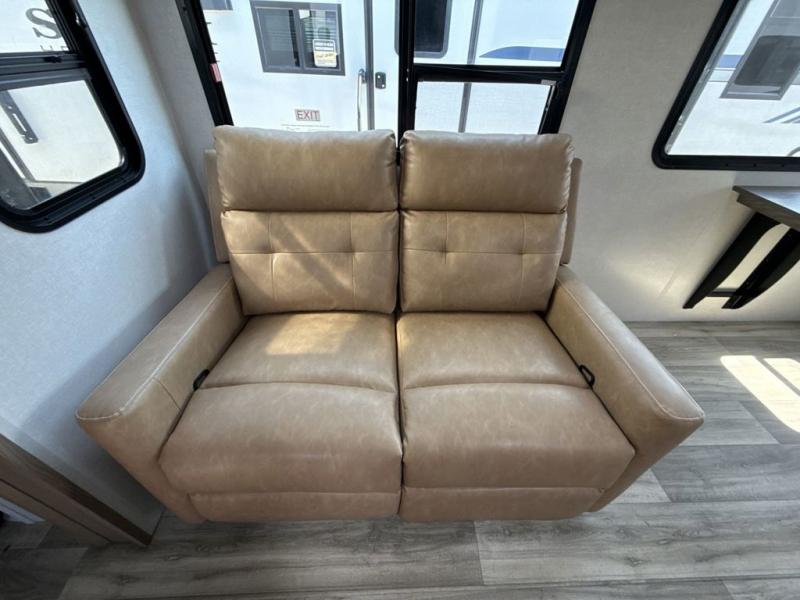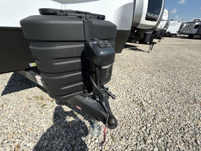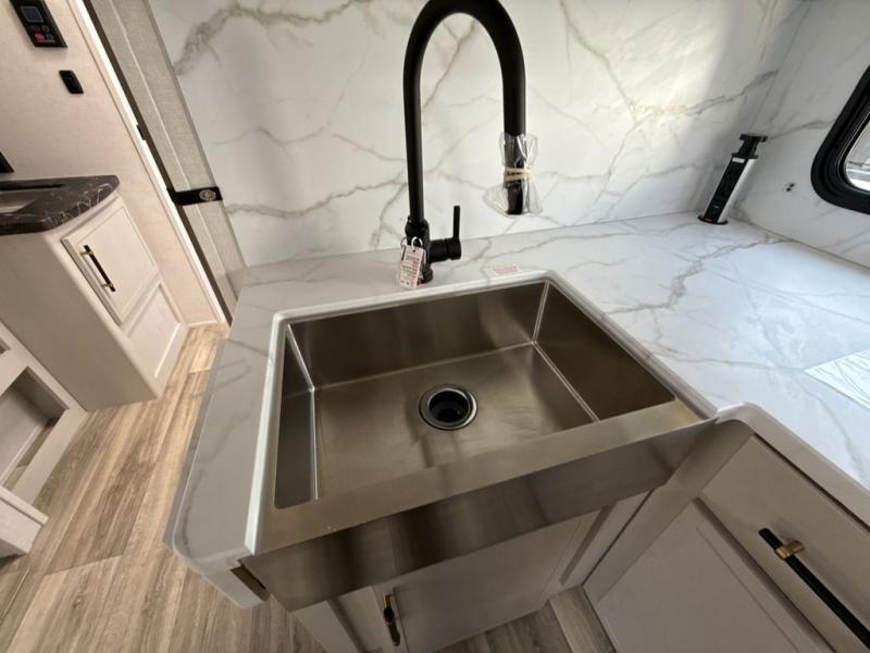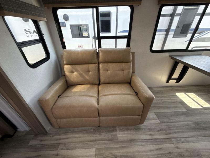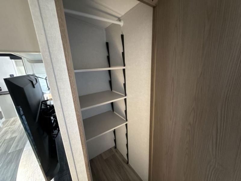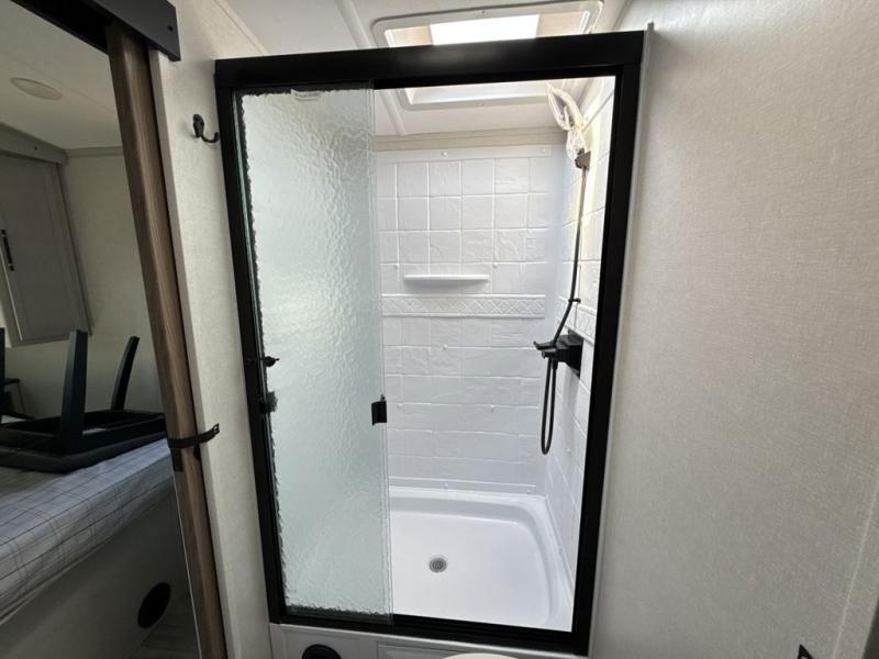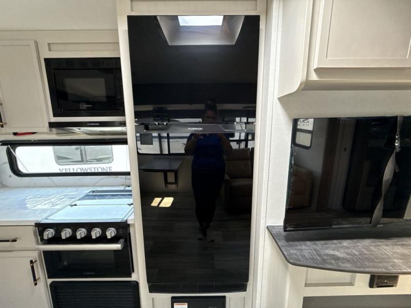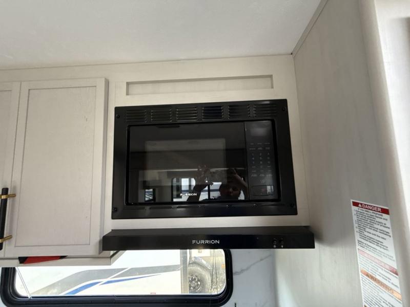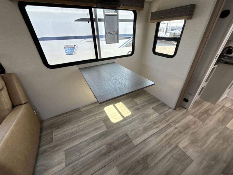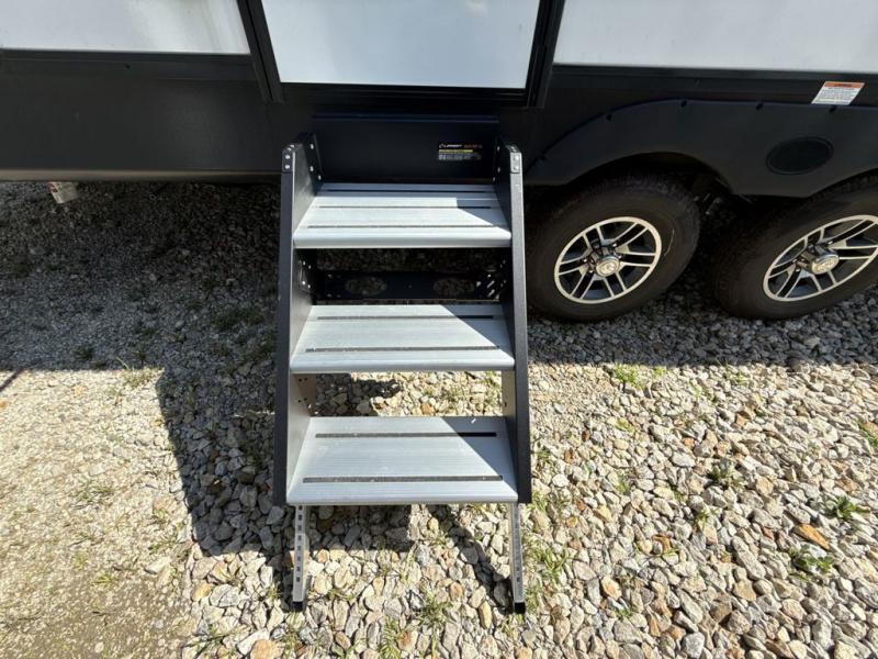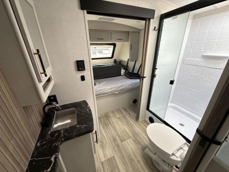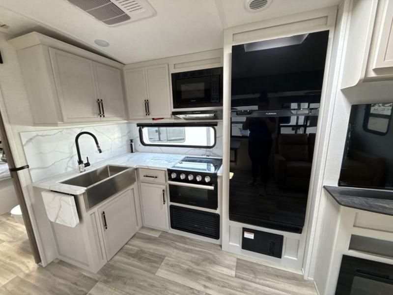 There are plenty of sleeping spaces for everyone in this travel trailer! From the rear private bunkhouse with a set of bunk beds along one side and a bunk bed above a sofa on the other to the front private bedroom with a king bed. You can even transform the tri-fold sofa and U-shaped dinette slide into extra sleeping spaces if needed. The walk-through bathroom has everything you will need to freshen up each morning. The chef will love cooking indoors with the glass top three burner cooktop with an oven, yet may love cooking at the outdoor kitchen even more. Grab a snack from the walk-in pantry behind the entertainment center and watch your favorite movie on the LED TV while a fire roars in the fireplace!