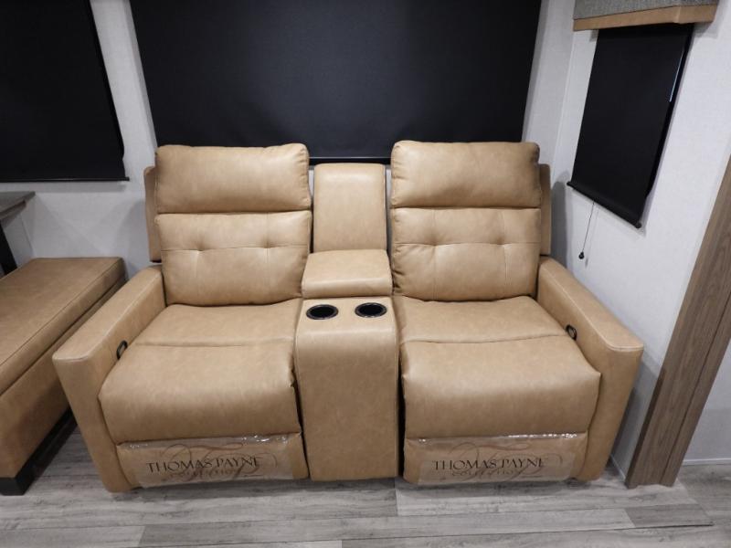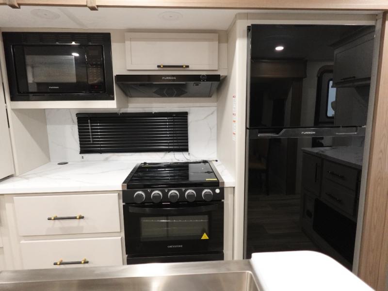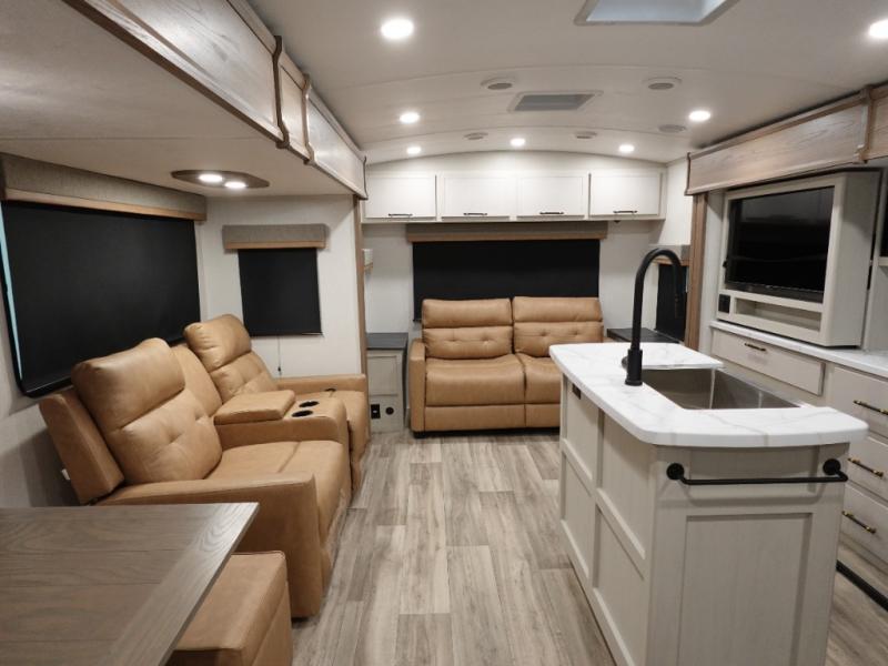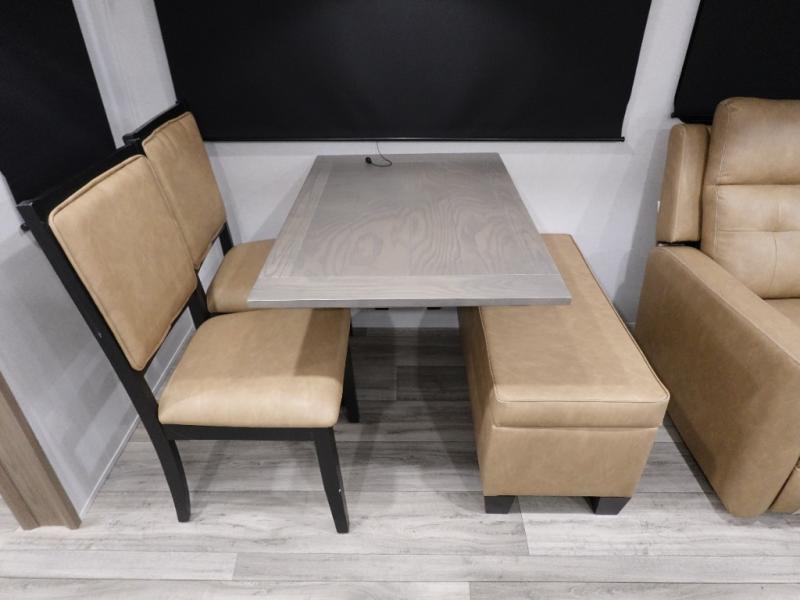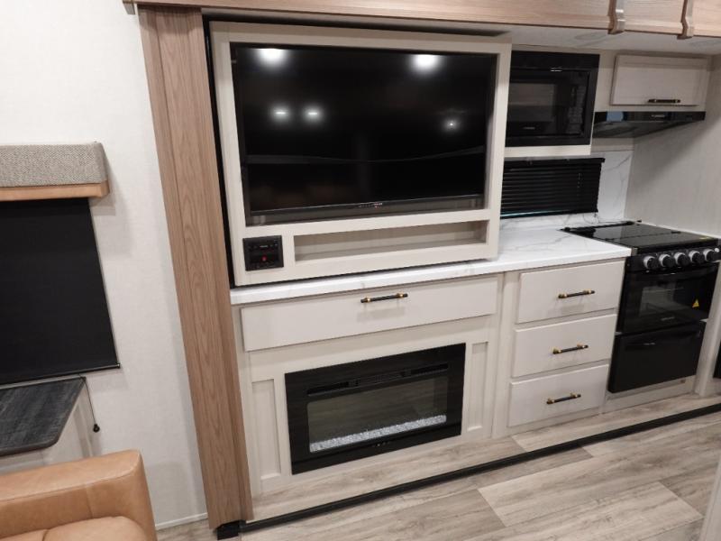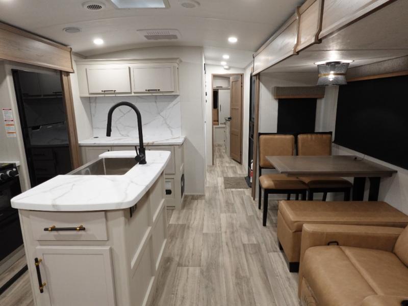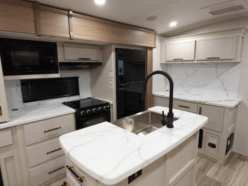Feel at home the very first time you step into this triple slide Astoria travel trailer. You will love the spacious feel with opposing slides in the main living/kitchen area to the left of the door. A booth dinette and theater seating can be found in the slide along the curbside, and a tri-fold sofa along the rear wall all providing ample seating for your family and friends to enjoy. A kitchen island features a farm-style sink, and the upgraded kitchen also features stainless steel appliances which will provide all that you need for preparing and cooking while you travel. Rest easy at night on a comfortable king bed and find ample storage throughout. This all weather unit features an enclosed underbelly which makes full time RVing easy, and part-time travel something that you can do in any season, not just the summer!