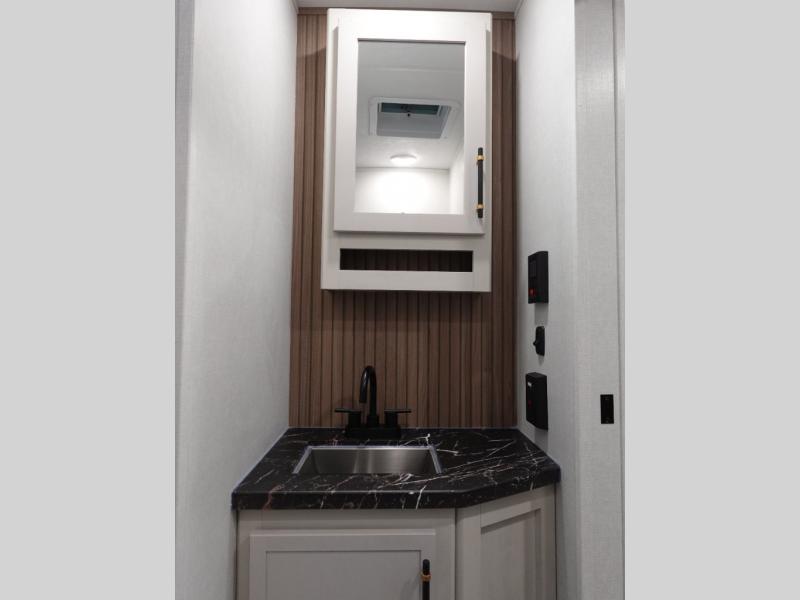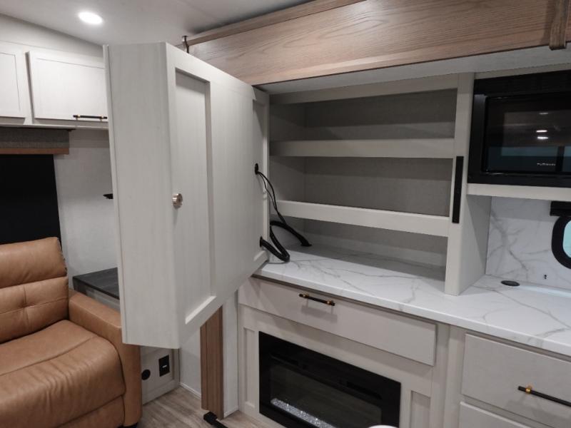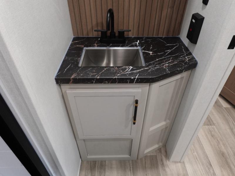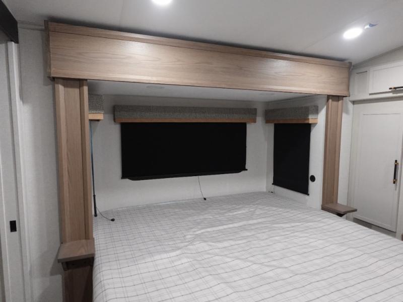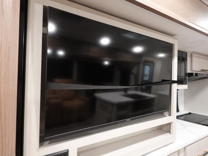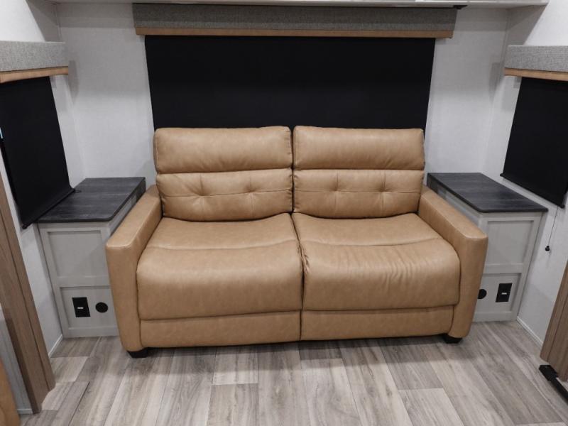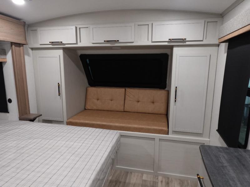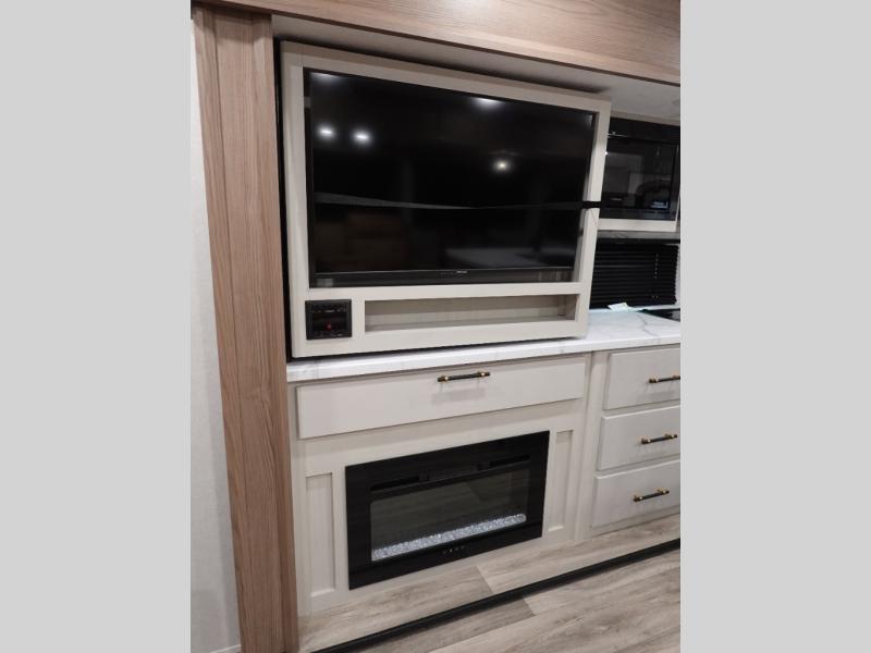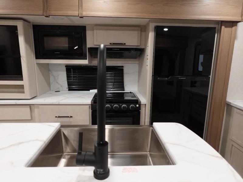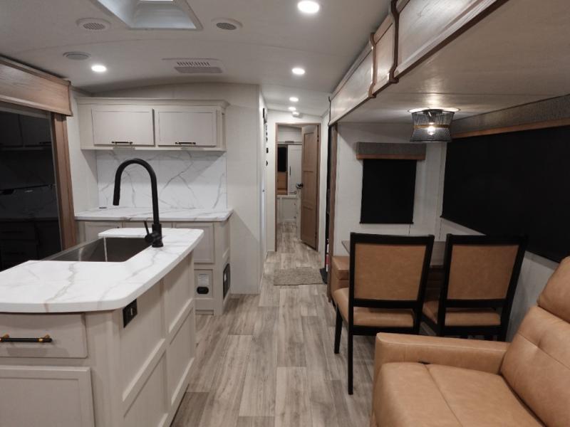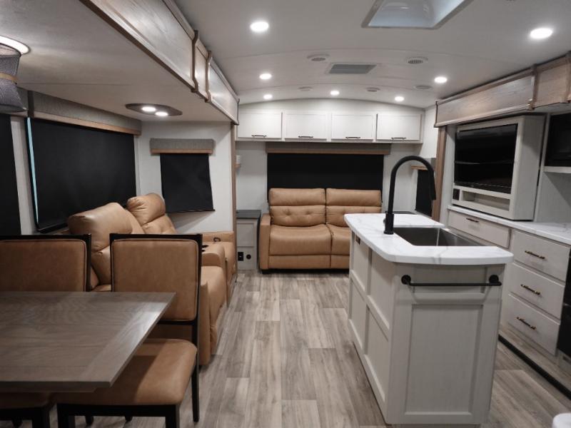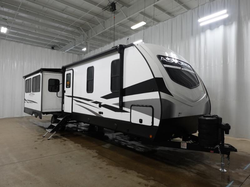 Feel at home the very first time you step into this triple slide Astoria travel trailer. You will love the spacious feel with opposing slides in the main living/kitchen area to the left of the door. A booth dinette and theater seating can be found in the slide along the curbside, and a tri-fold sofa along the rear wall all providing ample seating for your family and friends to enjoy. A kitchen island features a farm-style sink, and the upgraded kitchen also features stainless steel appliances which will provide all that you need for preparing and cooking while you travel. Rest easy at night on a comfortable king bed and find ample storage throughout. This all weather unit features an enclosed underbelly which makes full time RVing easy, and part-time travel something that you can do in any season, not just the summer!