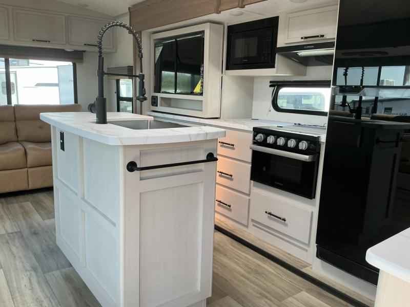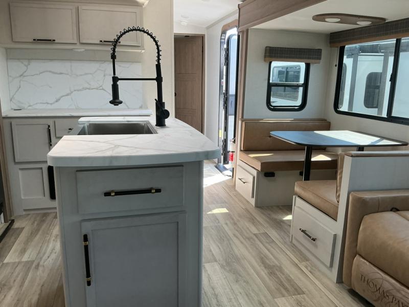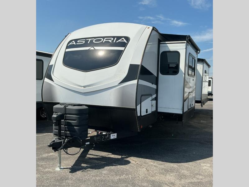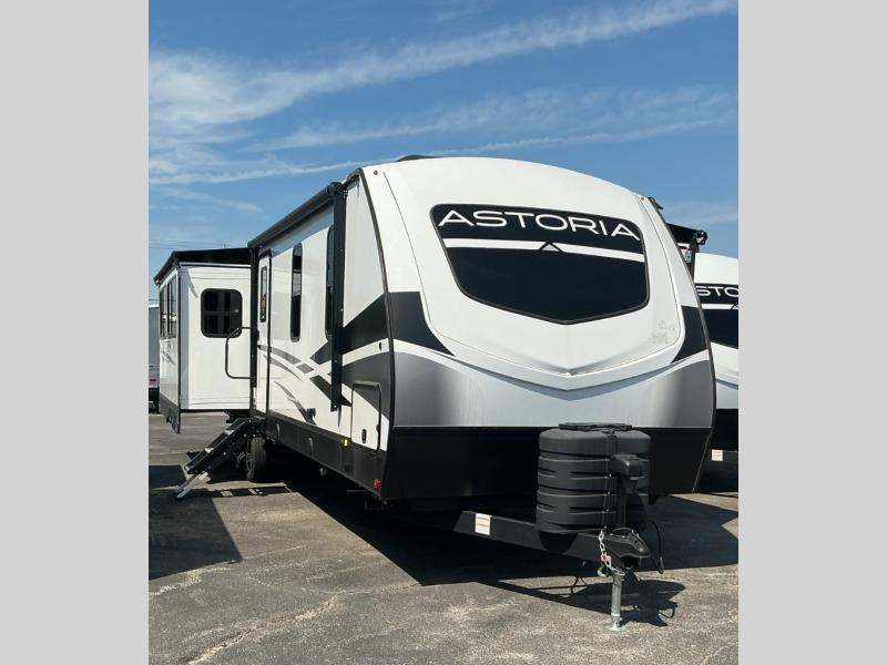 Feel at home the very first time you step into this triple slide Astoria travel trailer. You will love the spacious feel with opposing slides in the main living/kitchen area to the left of the door. A booth dinette and theater seating can be found in the slide along the curbside, and a tri-fold sofa along the rear wall all providing ample seating for your family and friends to enjoy. A kitchen island features a farm-style sink, and the upgraded kitchen also features stainless steel appliances which will provide all that you need for preparing and cooking while you travel. Rest easy at night on a comfortable king bed and find ample storage throughout. This all weather unit features an enclosed underbelly which makes full time RVing easy, and part-time travel something that you can do in any season, not just the summer!