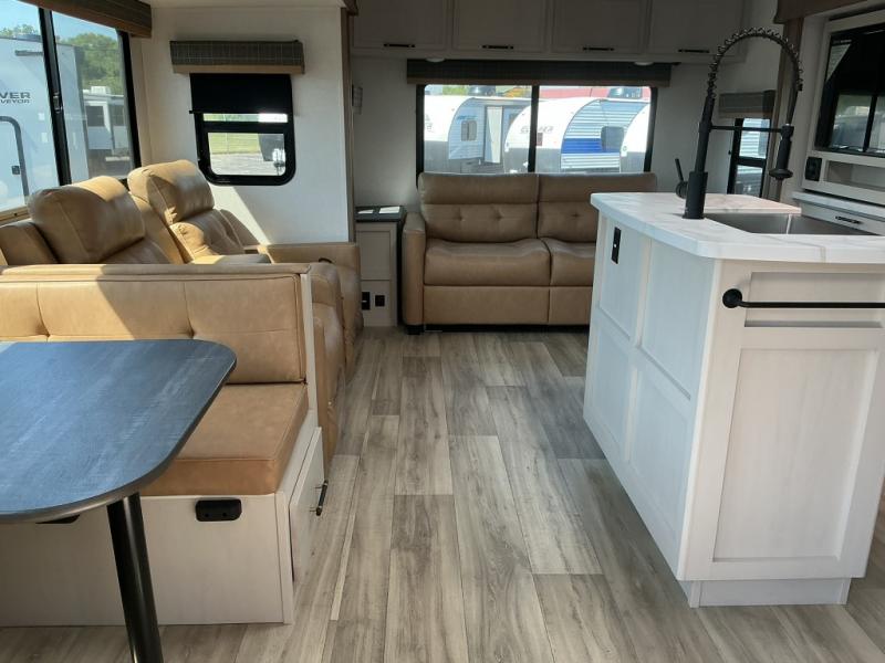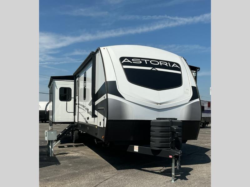 Feel at home the very first time you step into this triple slide Astoria travel trailer. You will love the spacious feel with opposing slides in the main living/kitchen area to the left of the door. A booth dinette and theater seating can be found in the slide along the curbside, and a tri-fold sofa along the rear wall all providing ample seating for your family and friends to enjoy. A kitchen island features a farm-style sink, and the upgraded kitchen also features stainless steel appliances which will provide all that you need for preparing and cooking while you travel. Rest easy at night on a comfortable king bed and find ample storage throughout. This all weather unit features an enclosed underbelly which makes full time RVing easy, and part-time travel something that you can do in any season, not just the summer!