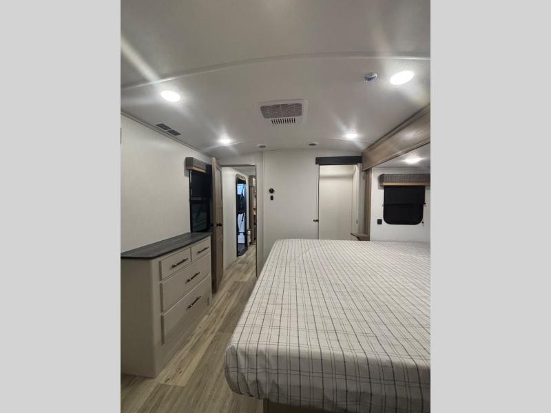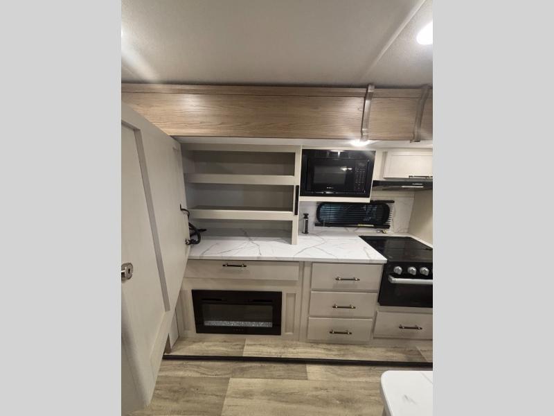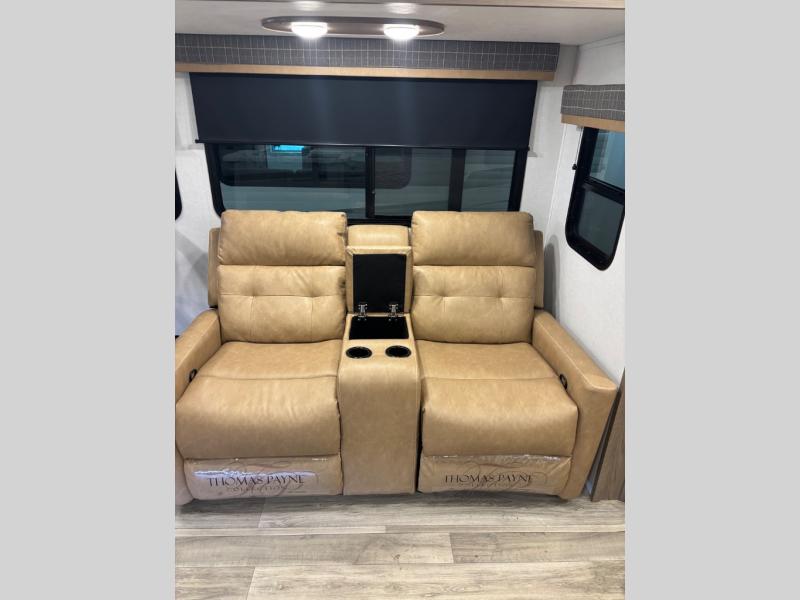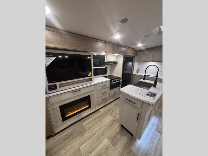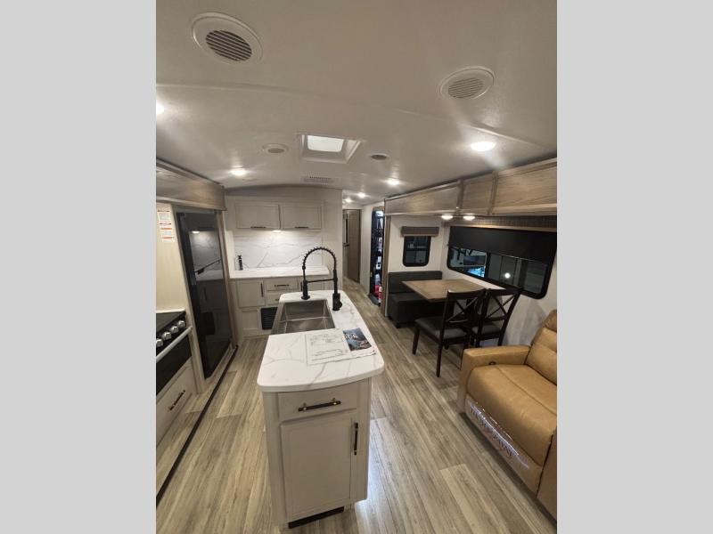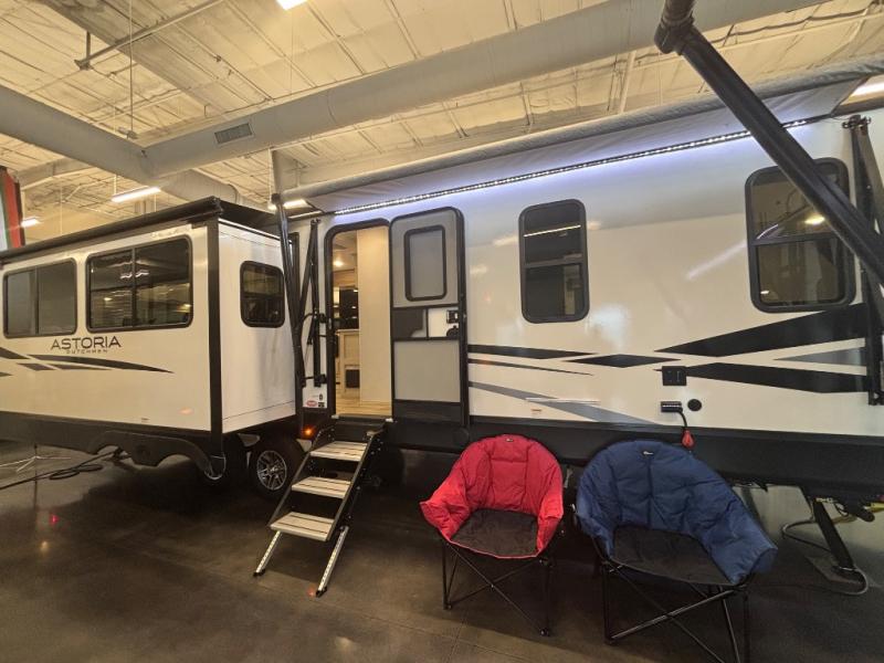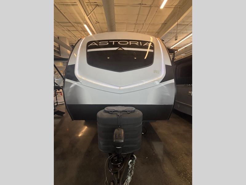 Feel at home the very first time you step into this triple slide Astoria travel trailer. You will love the spacious feel with opposing slides in the main living/kitchen area to the left of the door. A booth dinette and theater seating can be found in the slide along the curbside, and a tri-fold sofa along the rear wall all providing ample seating for your family and friends to enjoy. A kitchen island features a farm-style sink, and the upgraded kitchen also features stainless steel appliances which will provide all that you need for preparing and cooking while you travel. Rest easy at night on a comfortable king bed and find ample storage throughout. This all weather unit features an enclosed underbelly which makes full time RVing easy, and part-time travel something that you can do in any season, not just the summer!