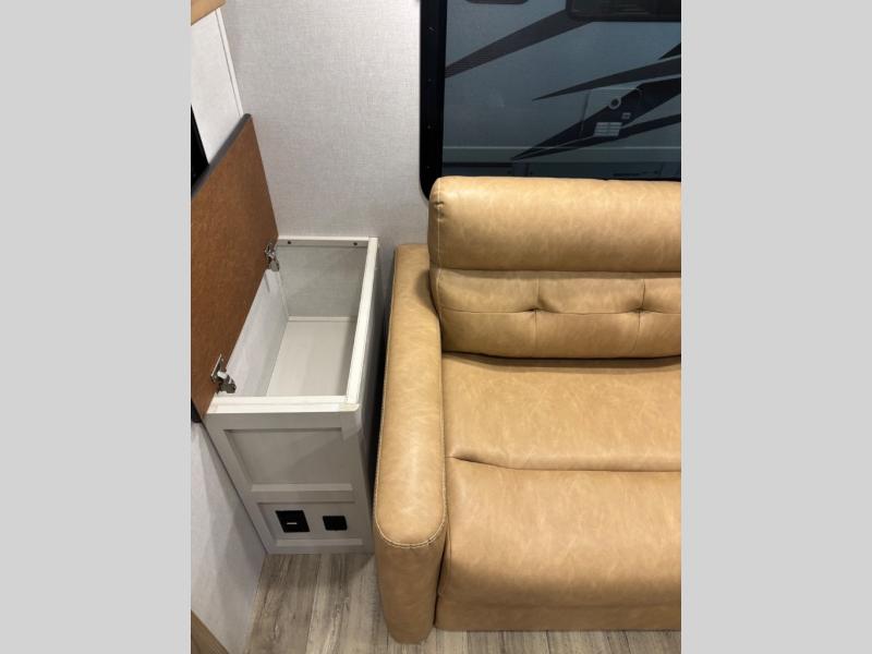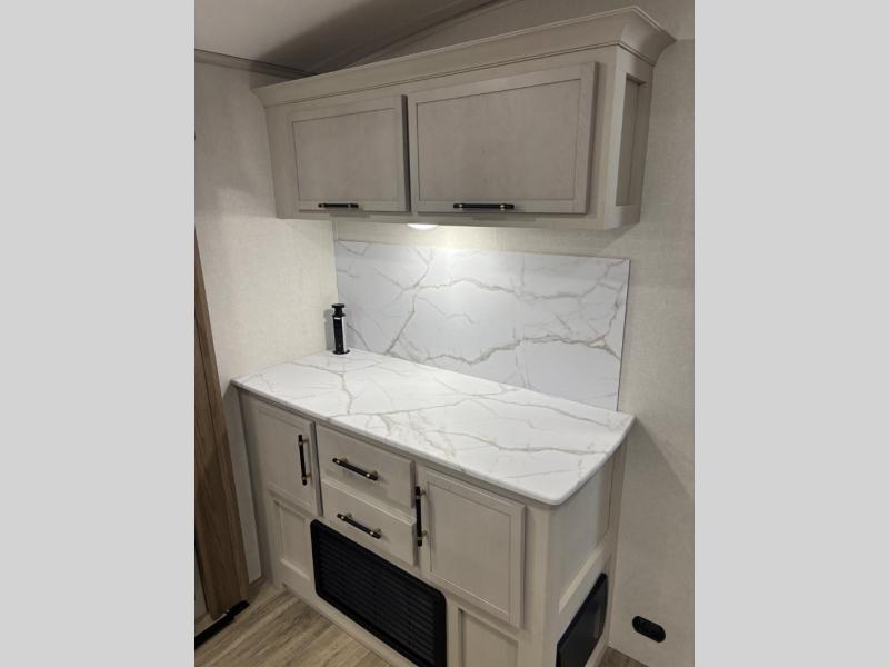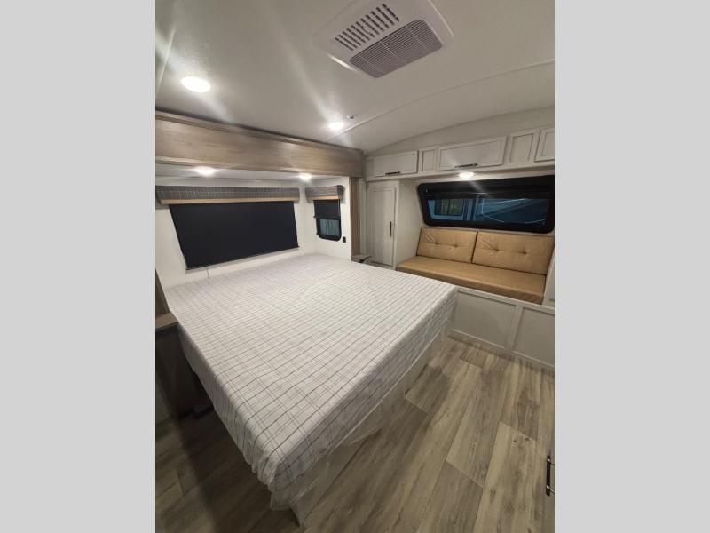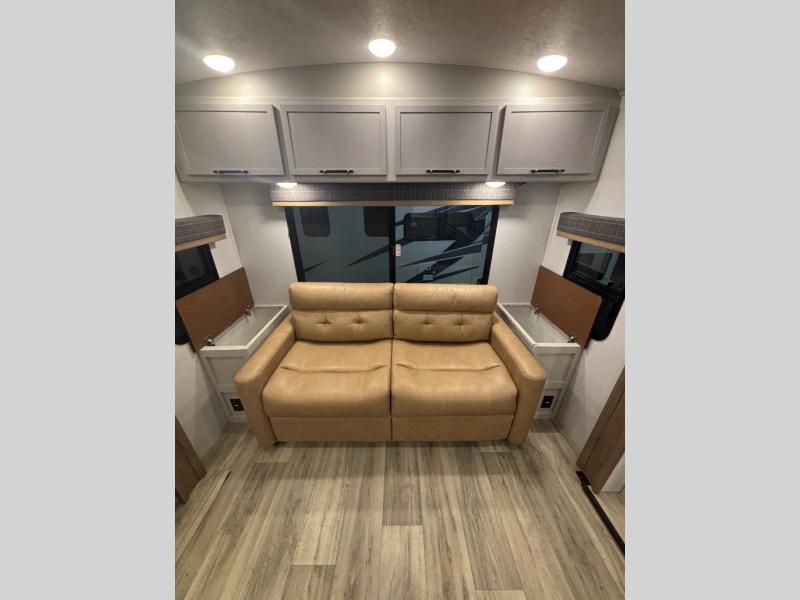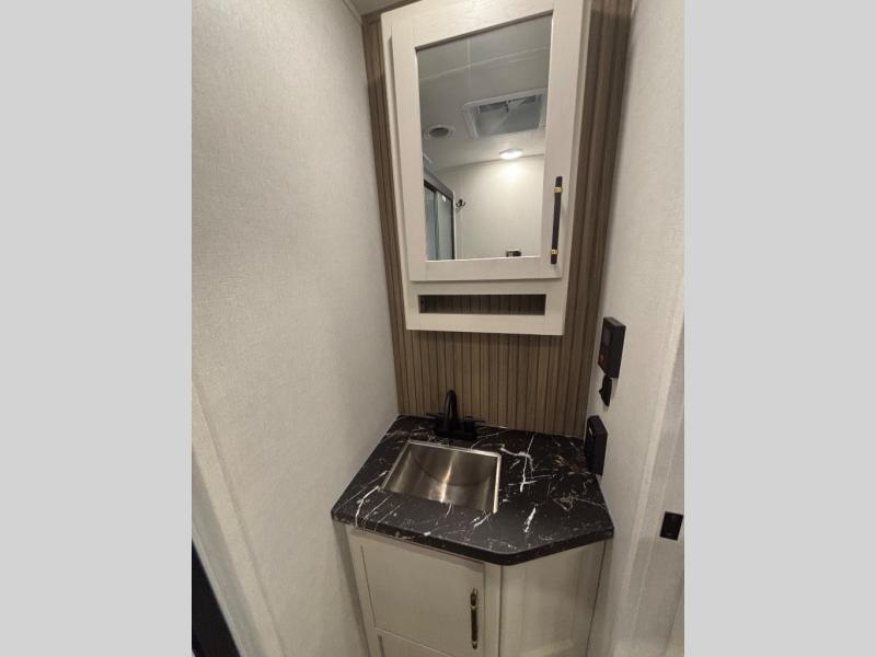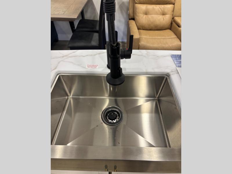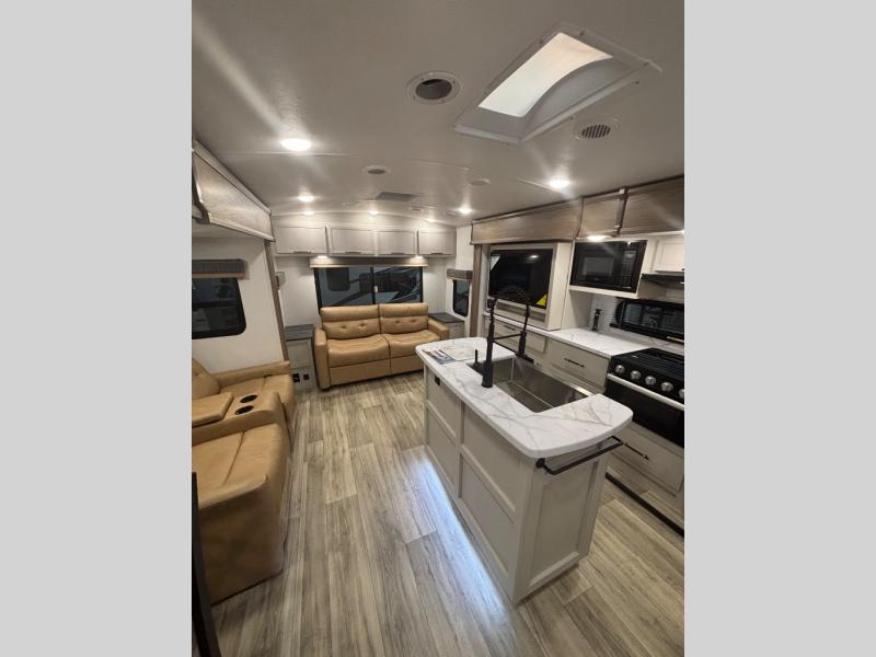 Feel at home the very first time you step into this triple slide Astoria travel trailer. You will love the spacious feel with opposing slides in the main living/kitchen area to the left of the door. A booth dinette and theater seating can be found in the slide along the curbside, and a tri-fold sofa along the rear wall all providing ample seating for your family and friends to enjoy. A kitchen island features a farm-style sink, and the upgraded kitchen also features stainless steel appliances which will provide all that you need for preparing and cooking while you travel. Rest easy at night on a comfortable king bed and find ample storage throughout. This all weather unit features an enclosed underbelly which makes full time RVing easy, and part-time travel something that you can do in any season, not just the summer!