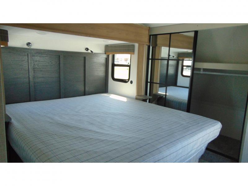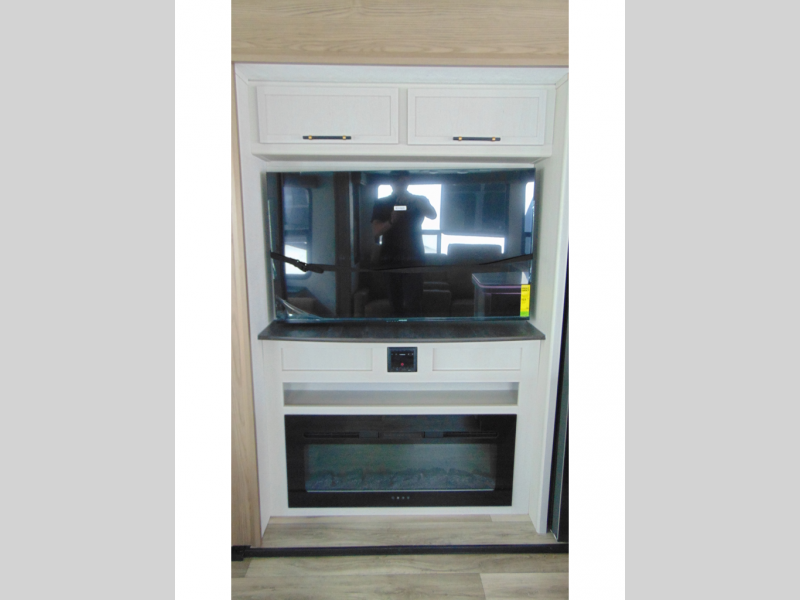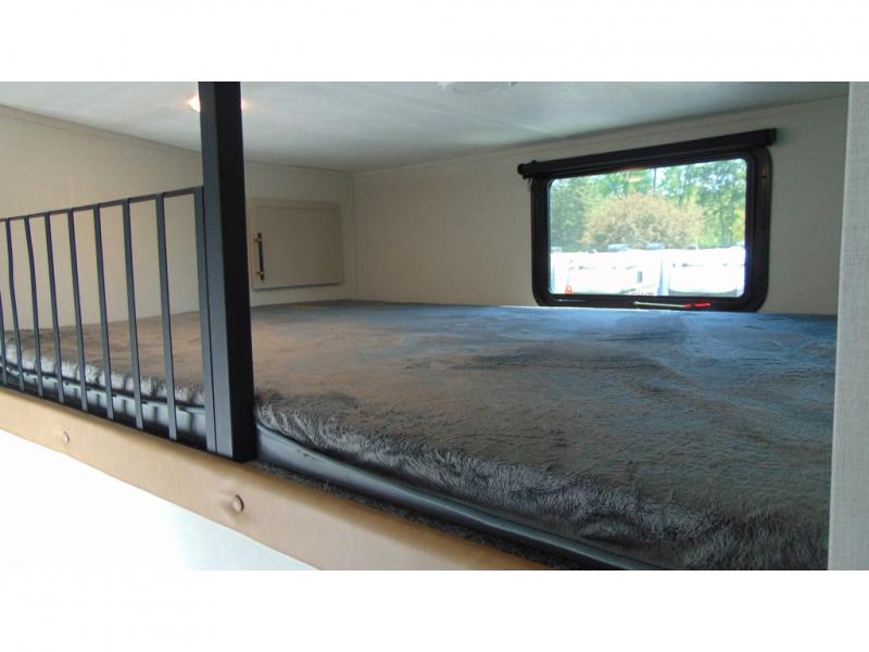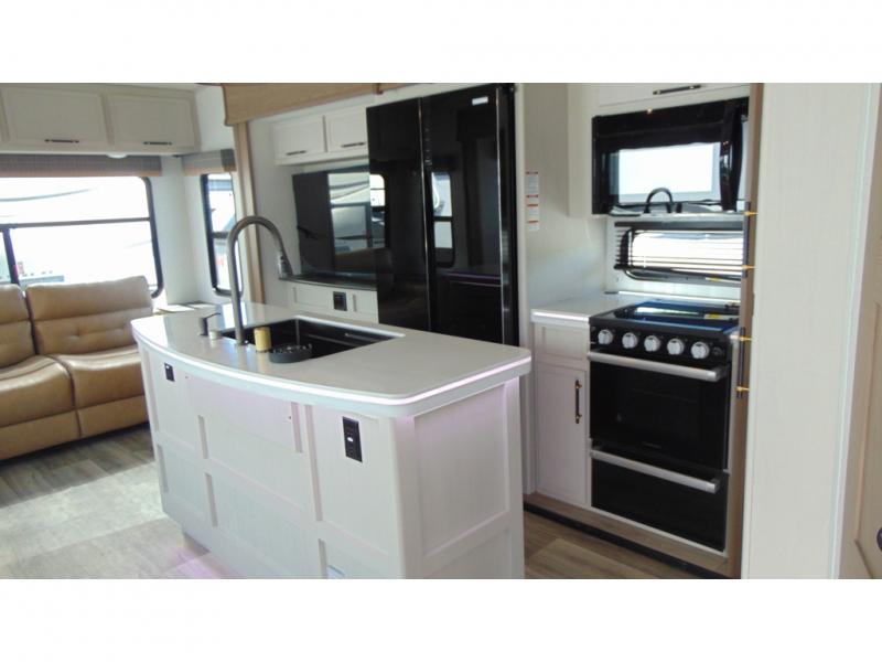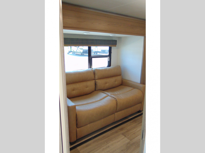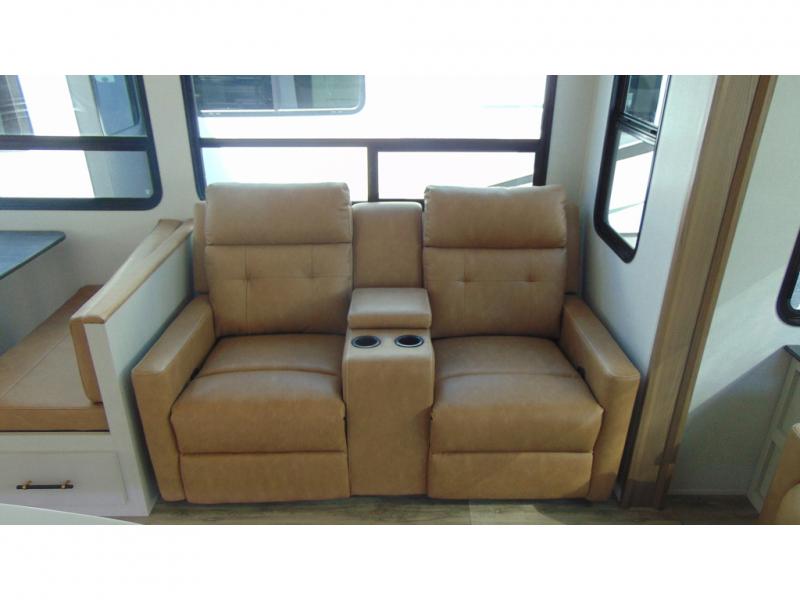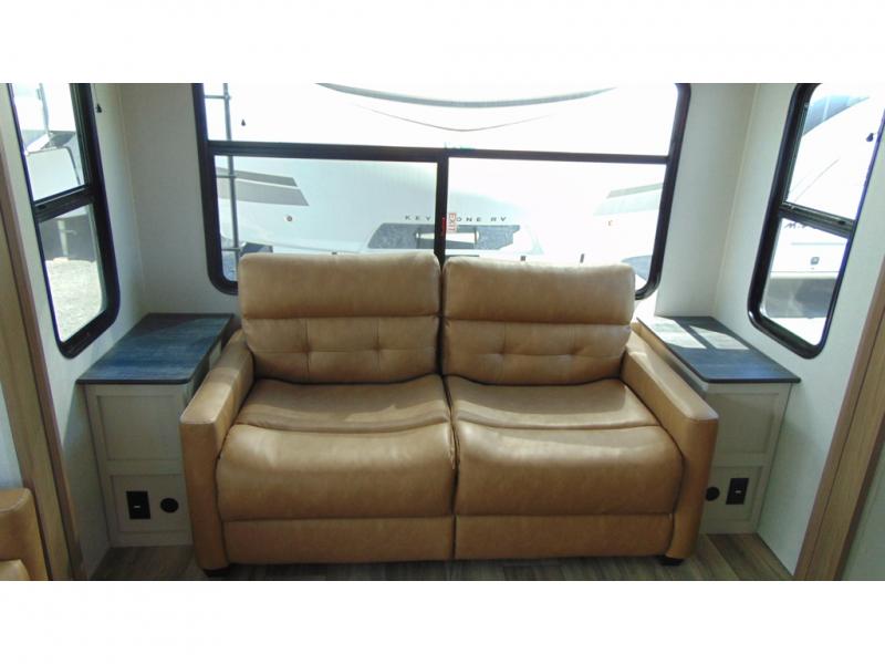 With a front bedroom and a middle multi-purpose room in this fifth wheel, everyone will have a comfortable night's sleep when you include the living room furniture and the loft bed as sleeping space! The front private bedroom has a king bed slide and a front wardrobe to keep your clothes looking their best. The multipurpose room features a sofa slide and storage below a loft bed which can be used for sleeping or storage. A couple other guests can join in too and sleep on the rear tri-fold sofa and the booth dinette once they are converted. The full bathroom has a dual sink vanity to make it easier for everyone getting ready in the mornings. You can prepare your best meals with the glass top three burner cooktop with an oven, the 16 cu. ft. refrigerator, and the kitchen island. The theater seating is conveniently across from the entertainment center with an HD LED TV and fireplace.