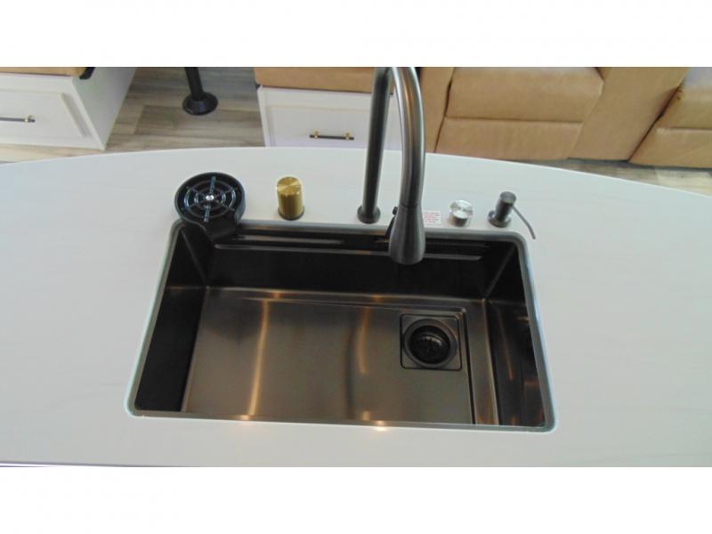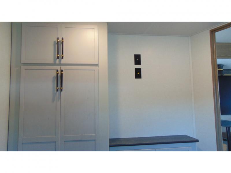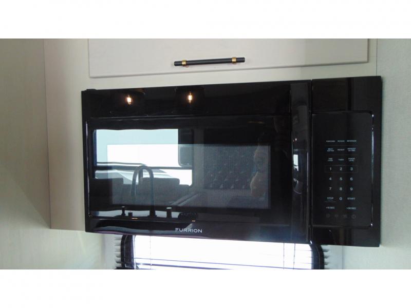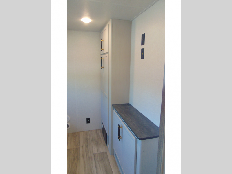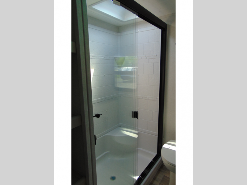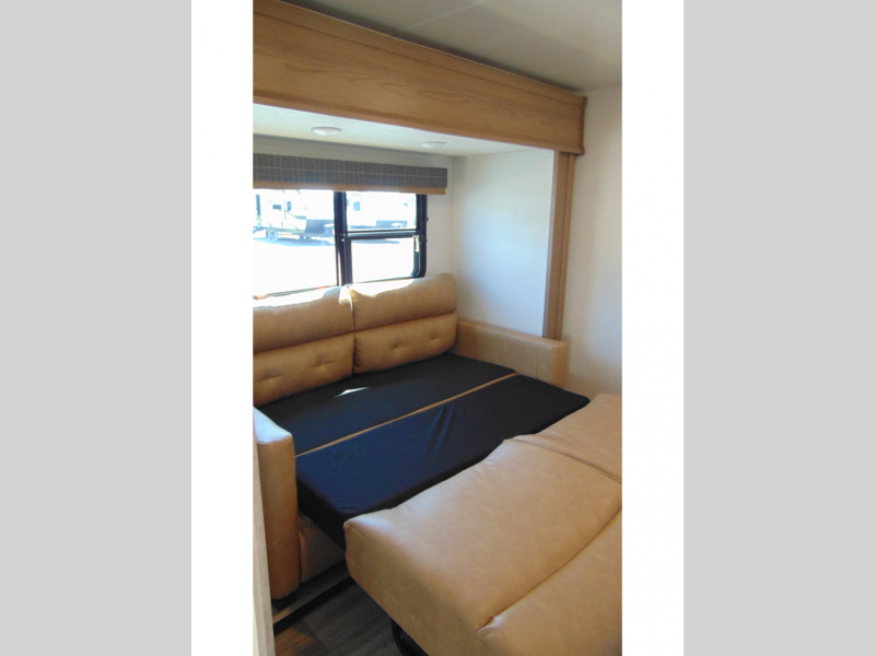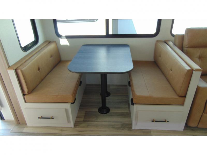With a front bedroom and a middle multi-purpose room in this fifth wheel, everyone will have a comfortable night's sleep when you include the living room furniture and the loft bed as sleeping space! The front private bedroom has a king bed slide and a front wardrobe to keep your clothes looking their best. The multipurpose room features a sofa slide and storage below a loft bed which can be used for sleeping or storage. A couple other guests can join in too and sleep on the rear tri-fold sofa and the booth dinette once they are converted. The full bathroom has a dual sink vanity to make it easier for everyone getting ready in the mornings. You can prepare your best meals with the glass top three burner cooktop with an oven, the 16 cu. ft. refrigerator, and the kitchen island. The theater seating is conveniently across from the entertainment center with an HD LED TV and fireplace.