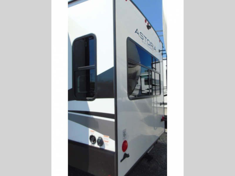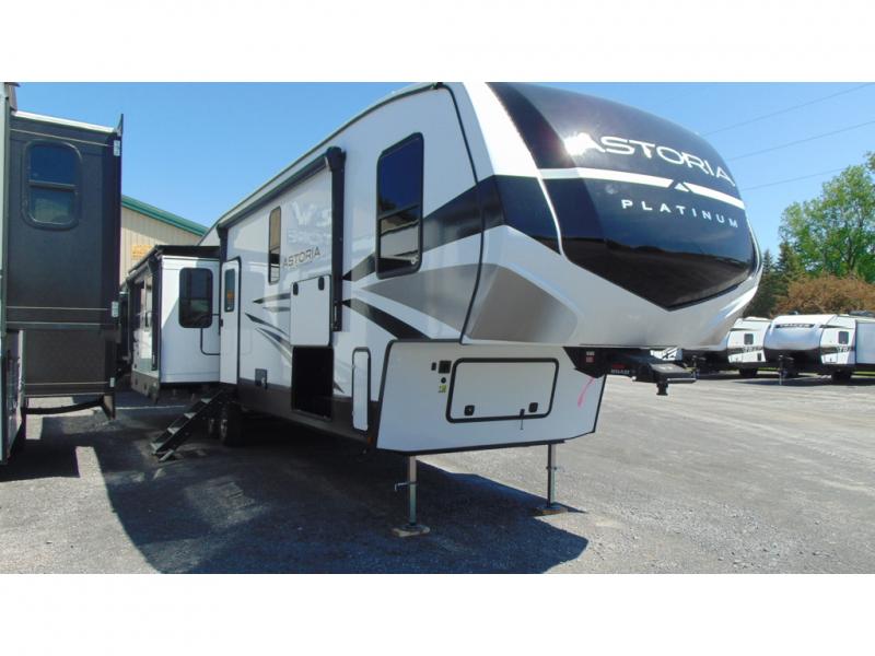 Each one of these Dutchmen RV Astoria Platinum fifth wheels feature a fiberglass exterior for added durability and an All Weather Thermal Package so you can camp all year long! There are also MorRyde Solid entry steps, slam latch baggage doors, and many more exterior conveniences. You'll enjoy a 200W solar panel for off-grid capabilities, an X1 back up camera for easy parking, and a power awning with LED lights for an inviting outdoor space. The interior is designed with bathroom backsplash, night shades throughout the living area, and Thomas Payne furniture collection. The on-demand tankless water heater will provide endless hot showers, and the dual ducted A/C will keep you cool all summer long.