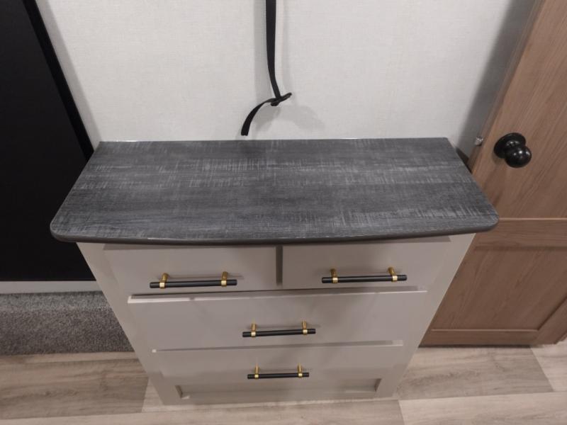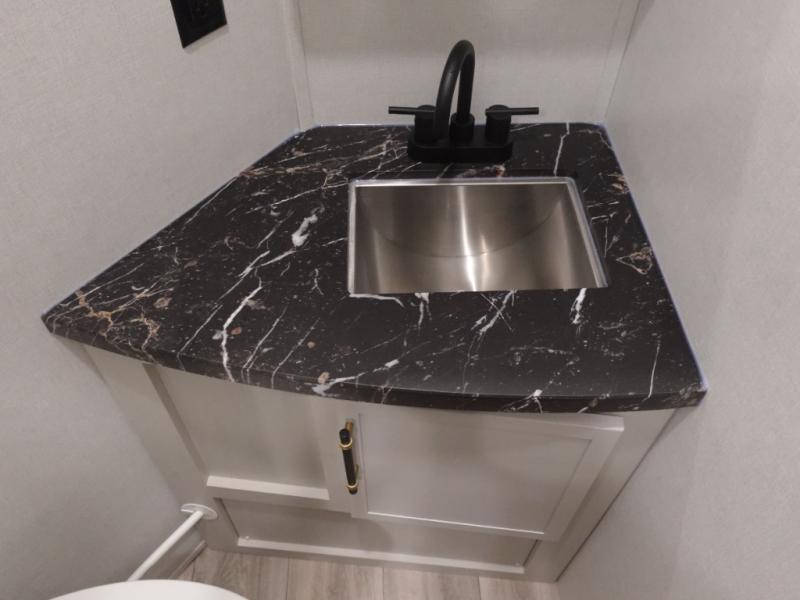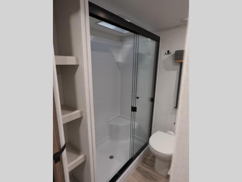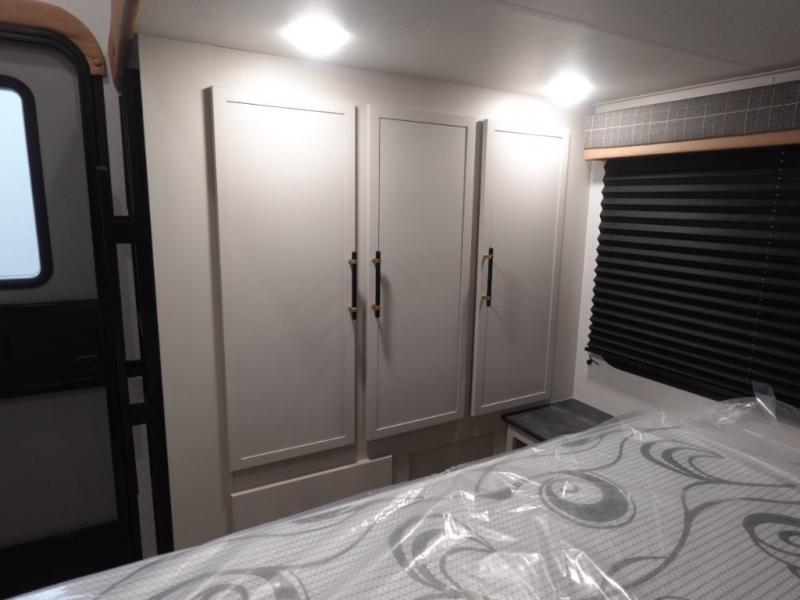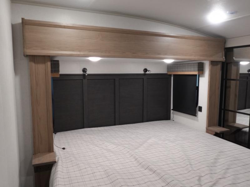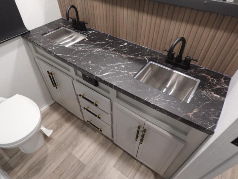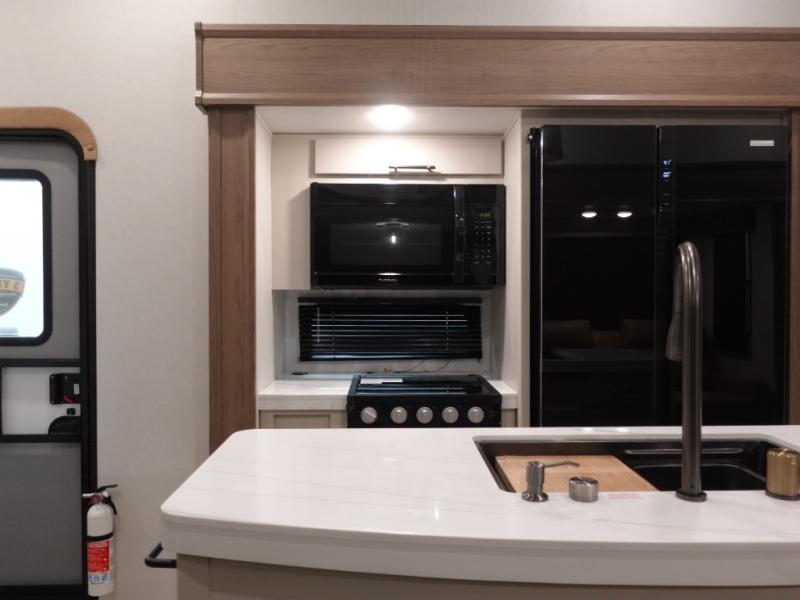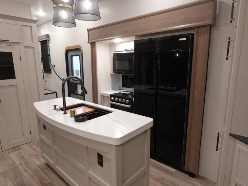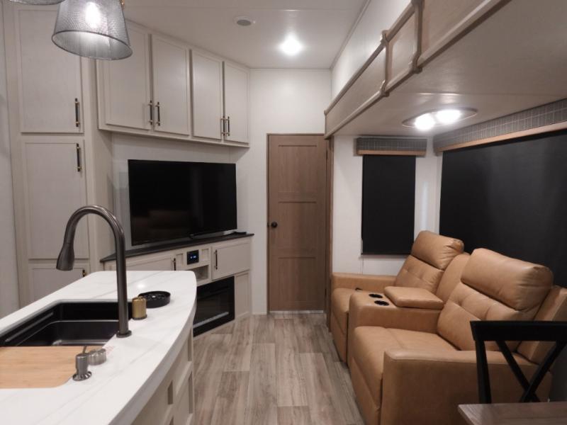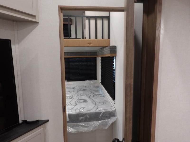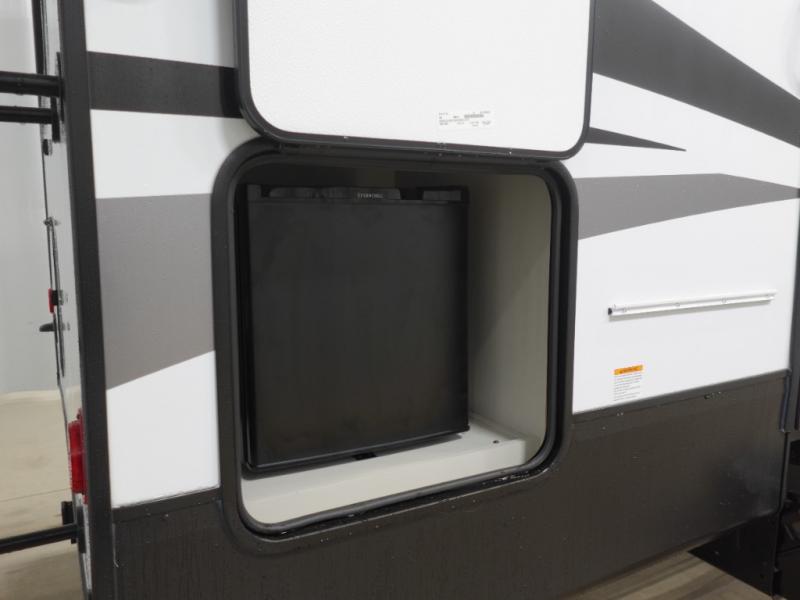 You will experience a smooth flow of traffic in and out of this fifth wheel with dual entry doors! One of the entrances even leads into the rear private bedroom which also has a 54" x 74" loft bed for storage or sleeping space, plus its very own half bathroom which will come in handy at night. The chef will enjoy preparing and serving meals using the kitchen island and all the amenities inside, plus they will enjoy cooking at the outdoor kitchen when wanting to be outside with everyone. Inside, there is a large pantry that is big enough to store everyone's favorite snacks, and the booth dinette offers a comfortable place to eat your meals or play card games. And the full bathroom has a dual sink vanity for two to get ready at once. When you're ready to wind down your nights, head to the front private bedroom and relax on the king bed slide!