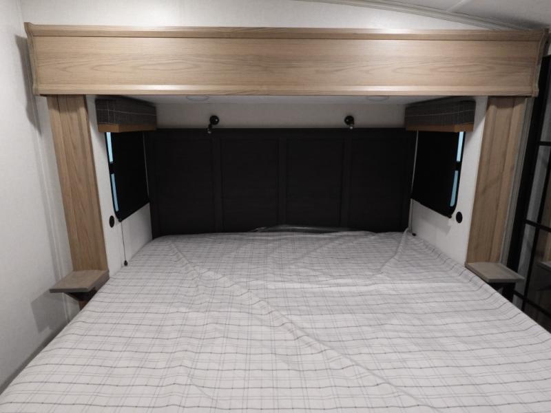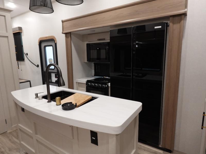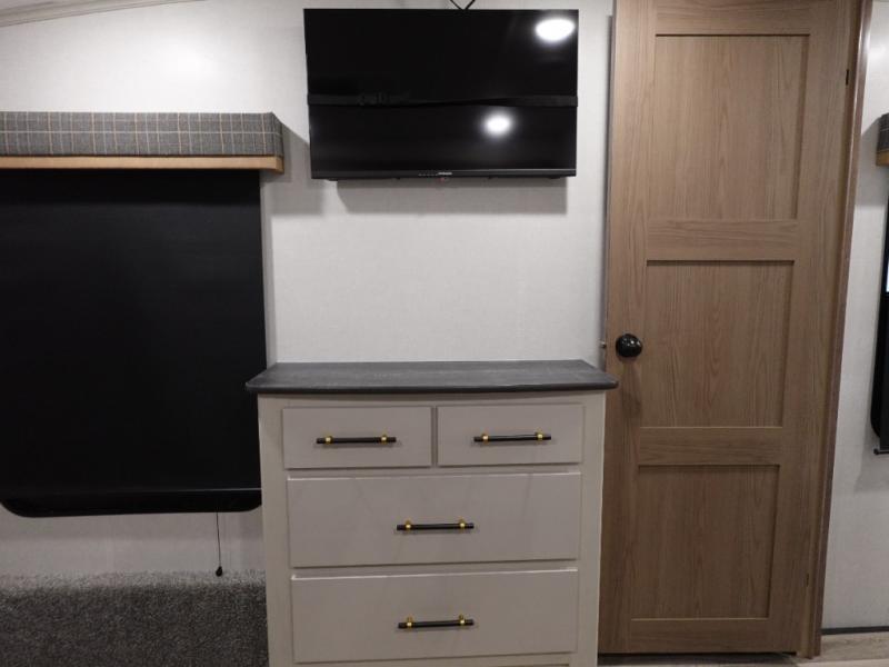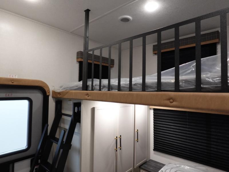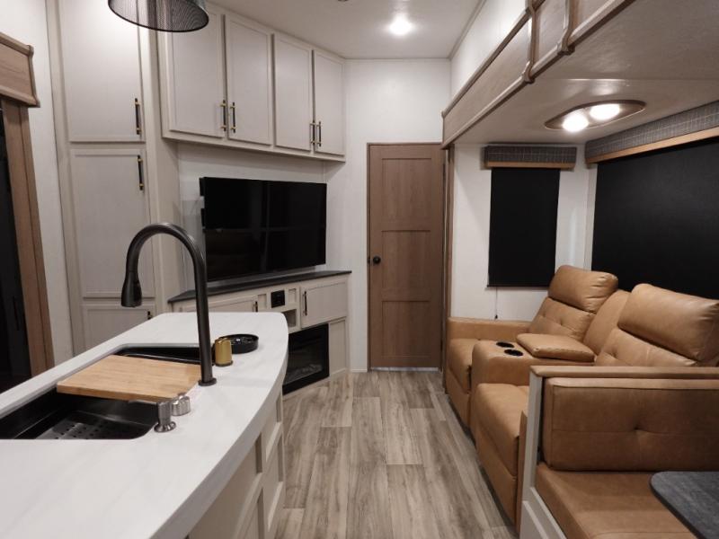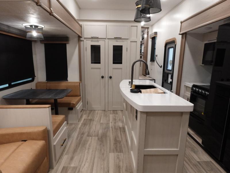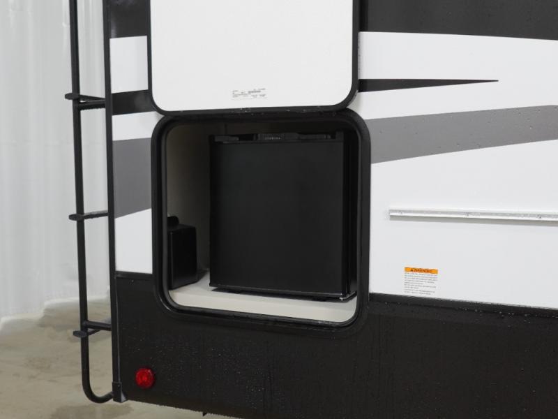 You will experience a smooth flow of traffic in and out of this fifth wheel with dual entry doors! One of the entrances even leads into the rear private bedroom which also has a 54" x 74" loft bed for storage or sleeping space, plus its very own half bathroom which will come in handy at night. The chef will enjoy preparing and serving meals using the kitchen island and all the amenities inside, plus they will enjoy cooking at the outdoor kitchen when wanting to be outside with everyone. Inside, there is a large pantry that is big enough to store everyone's favorite snacks, and the booth dinette offers a comfortable place to eat your meals or play card games. And the full bathroom has a dual sink vanity for two to get ready at once. When you're ready to wind down your nights, head to the front private bedroom and relax on the king bed slide!