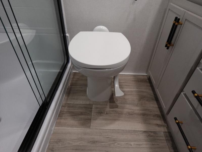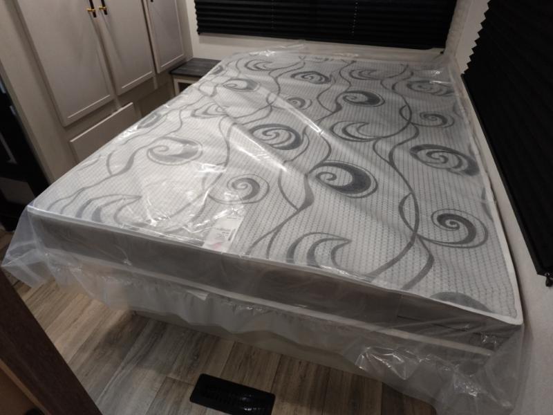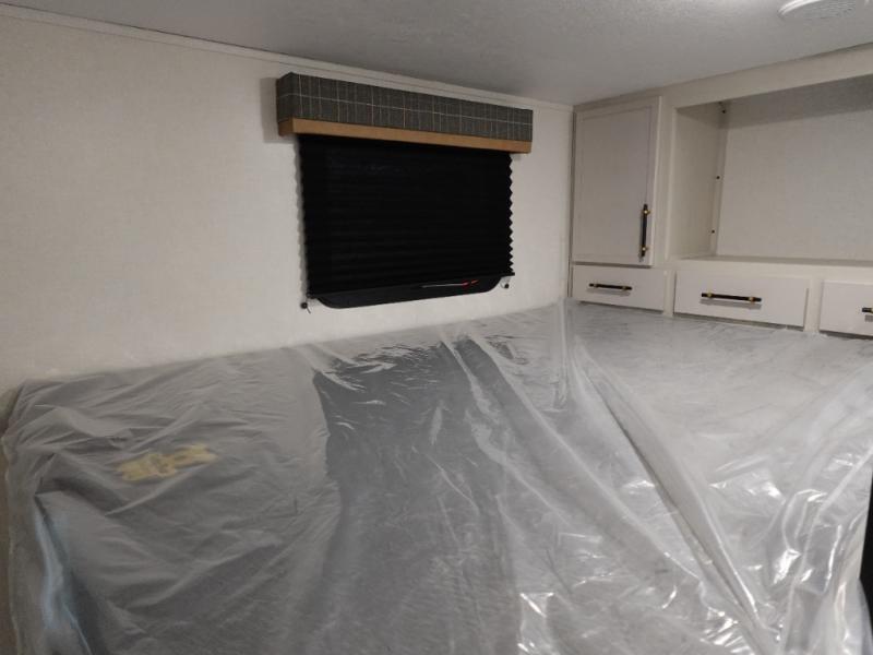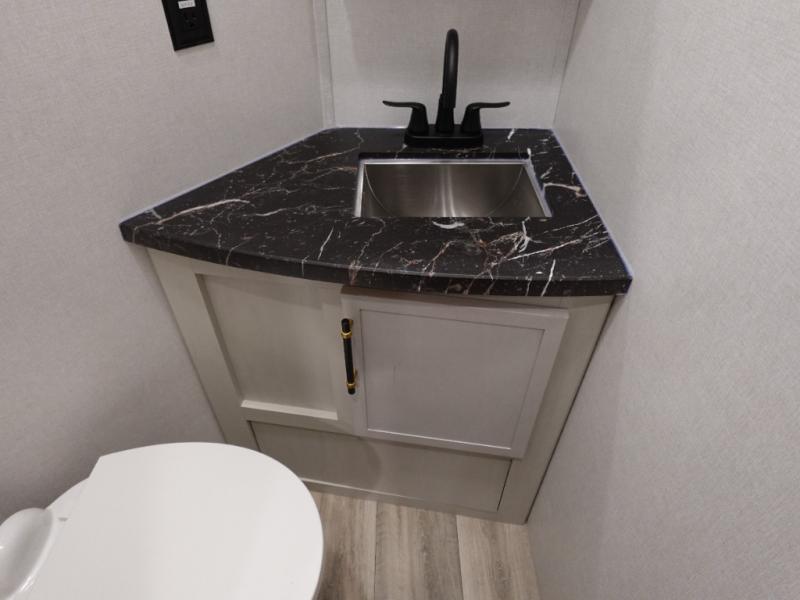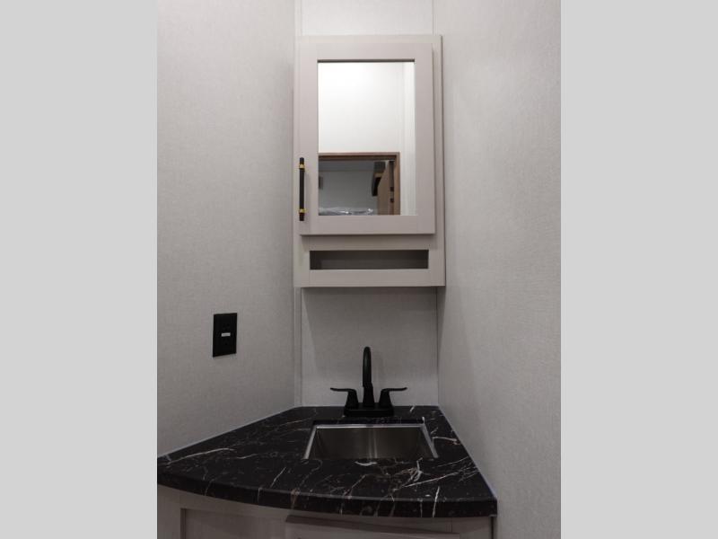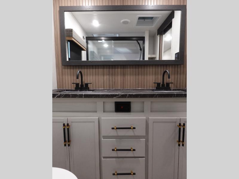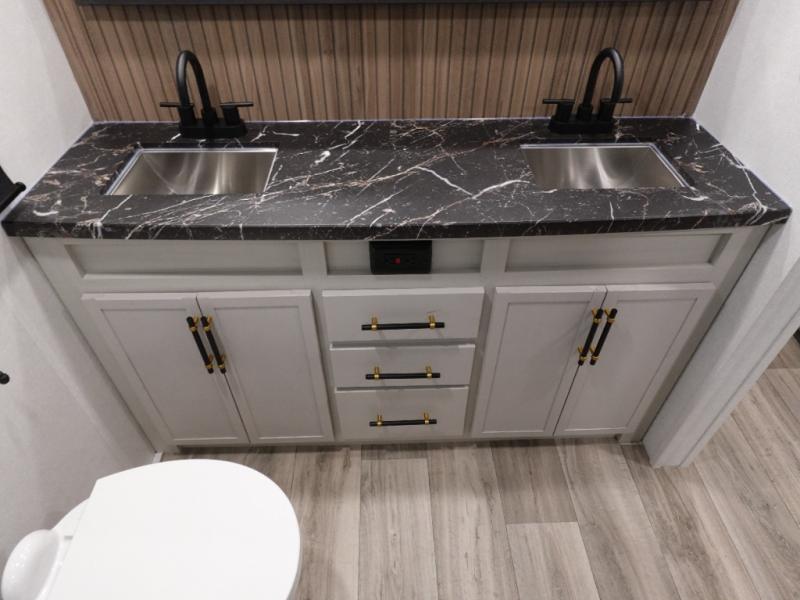 You will experience a smooth flow of traffic in and out of this fifth wheel with dual entry doors! One of the entrances even leads into the rear private bedroom which also has a 54" x 74" loft bed for storage or sleeping space, plus its very own half bathroom which will come in handy at night. The chef will enjoy preparing and serving meals using the kitchen island and all the amenities inside, plus they will enjoy cooking at the outdoor kitchen when wanting to be outside with everyone. Inside, there is a large pantry that is big enough to store everyone's favorite snacks, and the booth dinette offers a comfortable place to eat your meals or play card games. And the full bathroom has a dual sink vanity for two to get ready at once. When you're ready to wind down your nights, head to the front private bedroom and relax on the king bed slide!